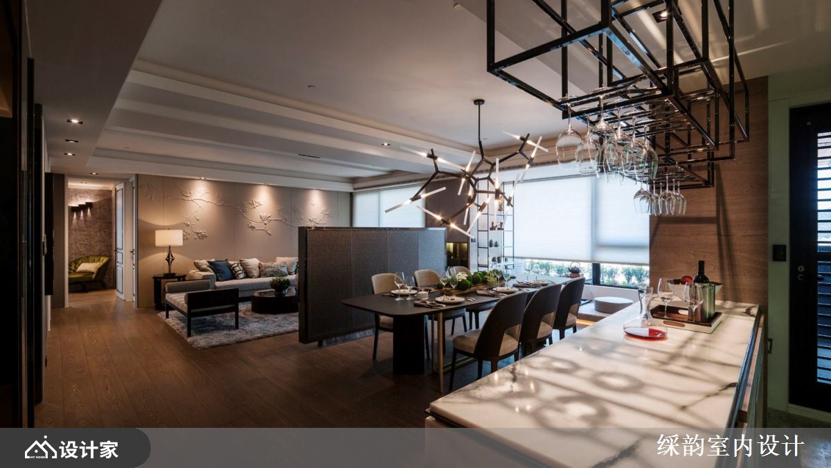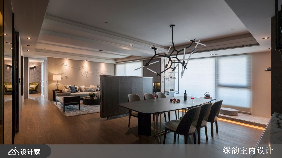 考虑家庭人数与亲友聚餐需求,餐桌选用最多可 8 人入座的长型大桌,搭配树枝造型吊灯,呈现大户人家招待宾客的恢弘底蕴,一旁中岛吧台以彷佛泼墨山水的白底黑纹大理石,彰显雍容之气与寄情诗画的风雅质蕴,同时也和临窗卧榻相映成趣,呼应诗情人文的雅致禅意。飘窗则有日式茶房般的简约韵味,此处晨日采光极佳,当光线轻透窗内、恣意洒落于卧榻时,家人能在此惬意品茗,体验谧穆而禅意的居家气氛。