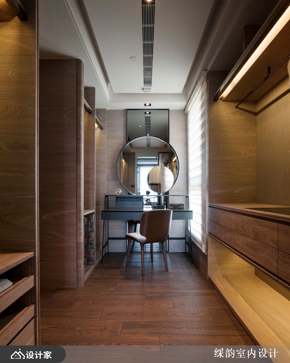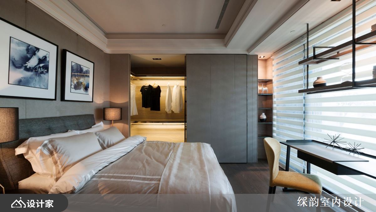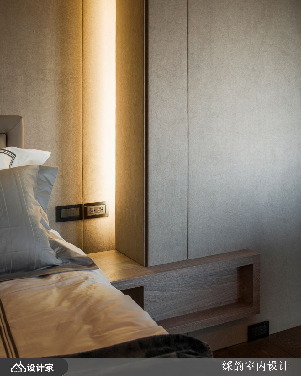 至于卧房空间,运用浅色调与大地色系作为舒缓自在的私领域气息,搭配深色木地板,形塑自然惬意的环境氤氛,让屋主进入卧房后,即可感受到慵懒适切的放松感,让人遗忘一天的繁忙与喧嚣,静静地沉淀专属于自己的个人时光。 主卧以收纳墙作为睡眠区与更衣间的分界,大量的收纳给予完整而全面性的居家机能;次卧则以简约素雅的空间语汇,延续主卧的静谧恬然质感,也刻画清雅柔和的家居意象。