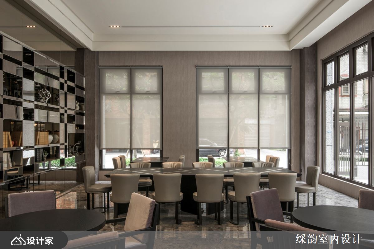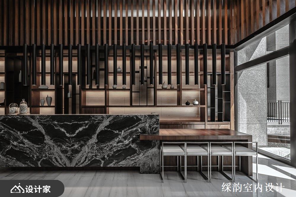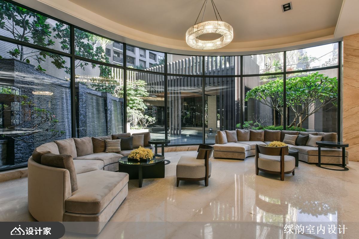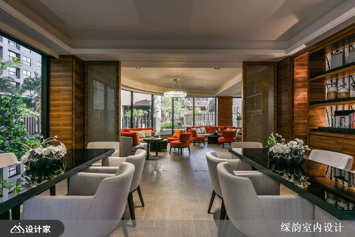 运用有如装置艺术般的大型灯具,华丽展现豪宅小区的大厅气势,搭配整片大理石墙面诠释低调浮华的雅致贵气,半圆环式的落地窗座位区营造惬意舒适气息,一整块实木既是实用桌体,又兼具大型 installation 的艺术品味,与空间内部的石材、窗外的绿意共谱出浓厚的自然森境底蕴。