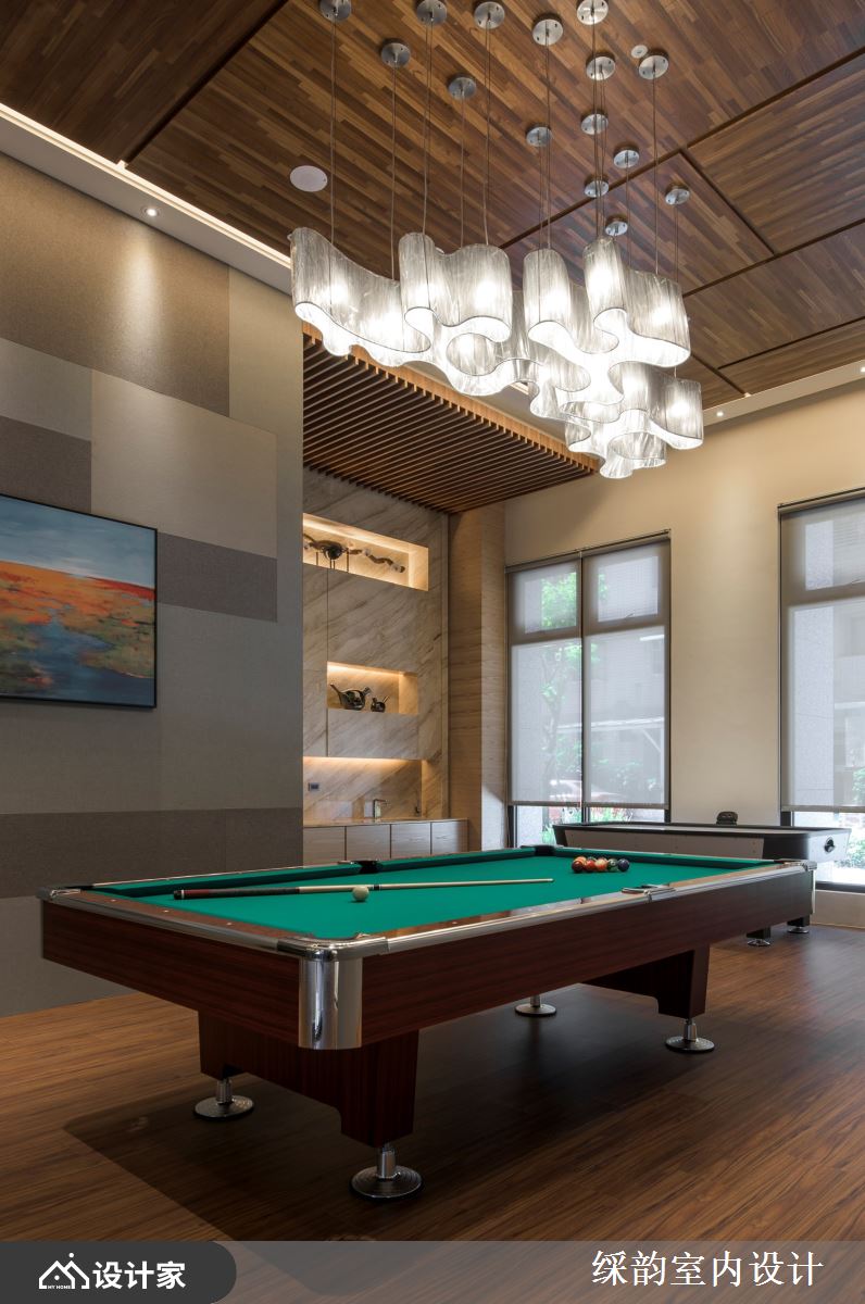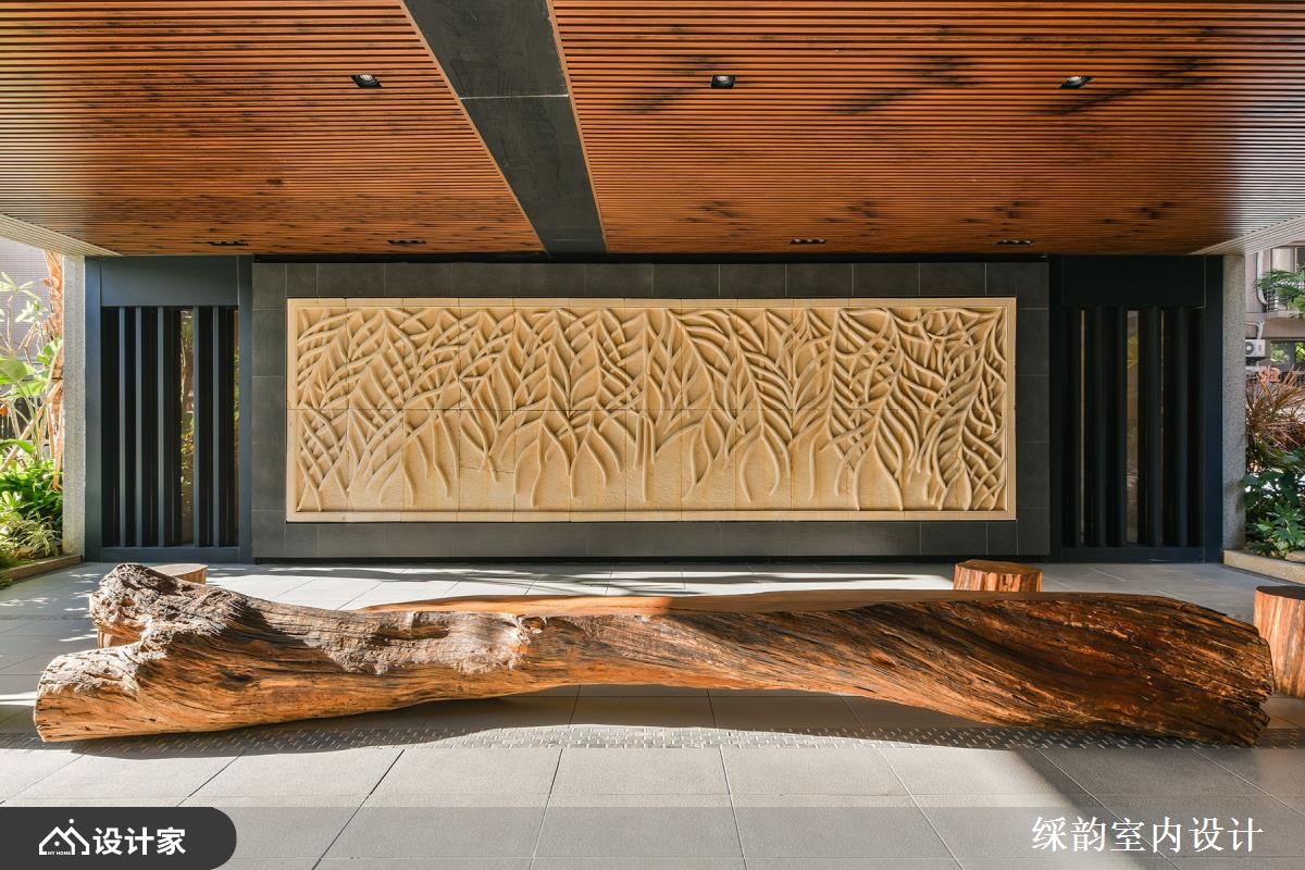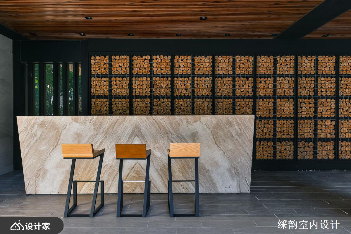 运用有如装置艺术般的大型灯具,华丽展现豪宅小区的大厅气势,搭配整片大理石墙面诠释低调浮华的雅致贵气,半圆环式的落地窗座位区营造惬意舒适气息,一整块实木既是实用桌体,又兼具大型 installation 的艺术品味,与空间内部的石材、窗外的绿意共谱出浓厚的自然森境底蕴。