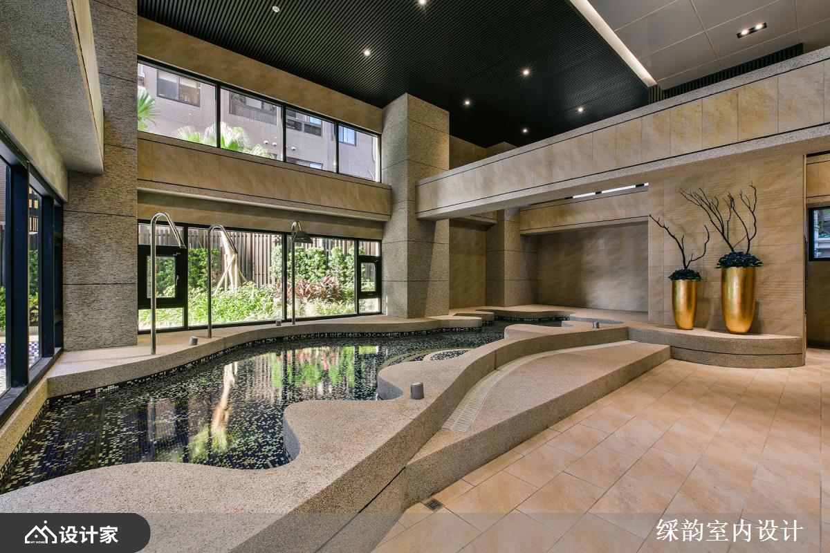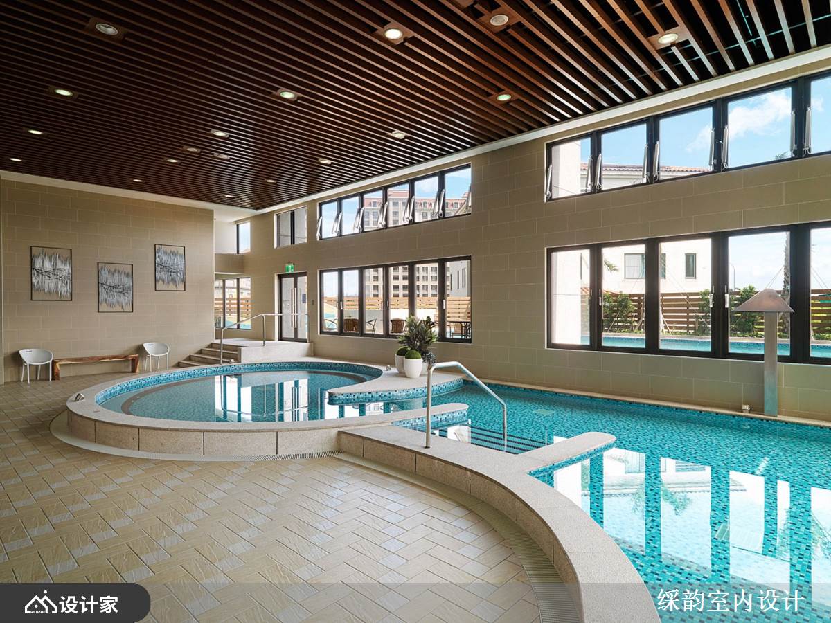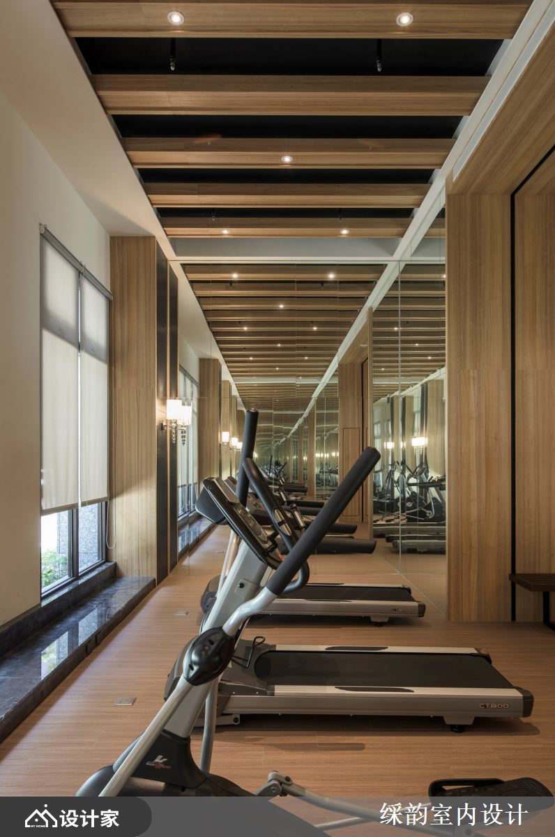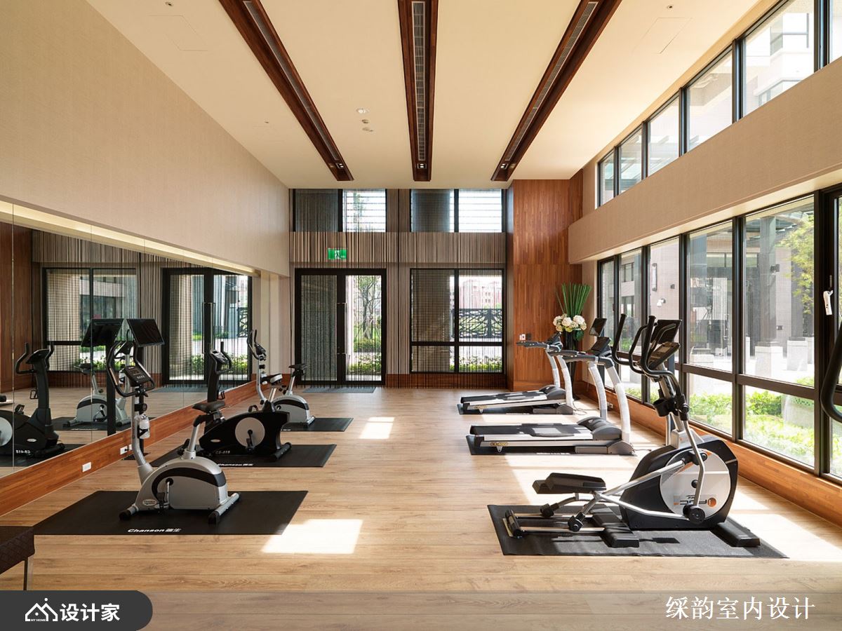 为了善用大量采光的环境优势,特意以浅色主轴呼应充沛光感,像是浅灰、米白、暖木棕;石材柜台后方的墙面设计更是焦点设计之一,彷佛树根盘结、光洒叶影般的造型铁艺,搭配纤细吊灯,酿造都会时尚气质。健身房、游泳池等休闲机能区域也丝毫不马虎,延续大堂空间的挑高与木质感设计,让豪宅住户皆能感受高端空间情境。