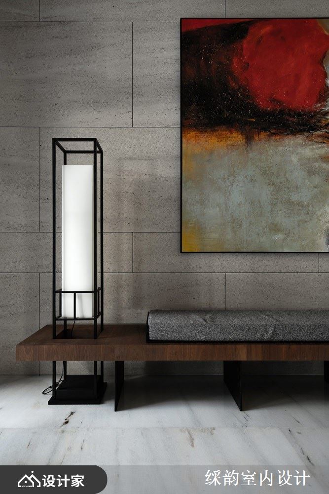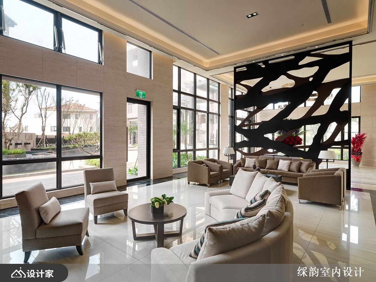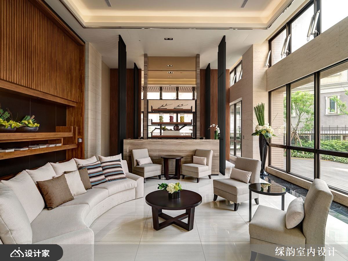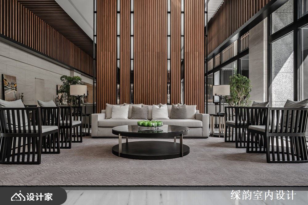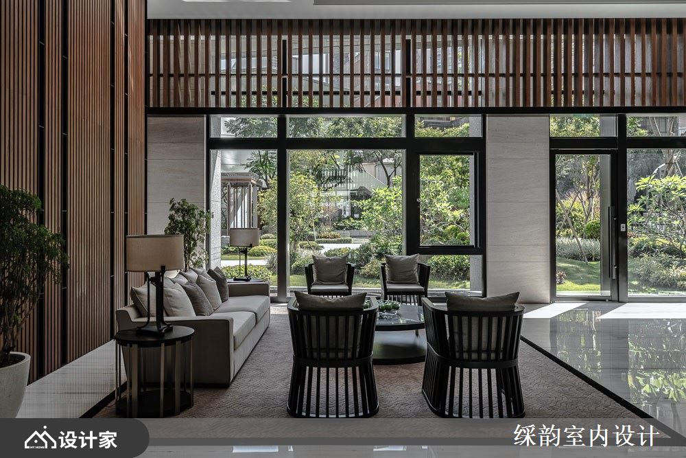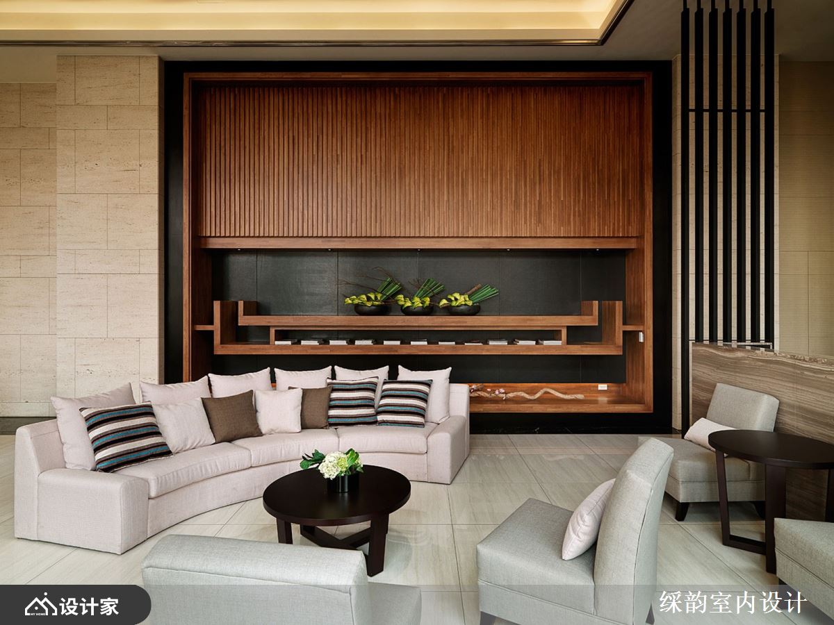 运用大量木质酿造东方人文的温儒禅意,垂直排列的木格栅作为最大的视觉意象,延伸出和缓暖漾调性,同时也和窗外绿意景致相互呼应,烘托丰富自然情韵,铁艺与落地窗的黑铁框、大堂白色大理石柱、黄铜立灯与抽象艺术挂画,交迭出多元气韵的空间样貌。