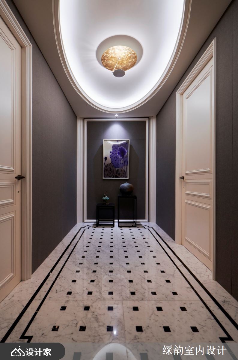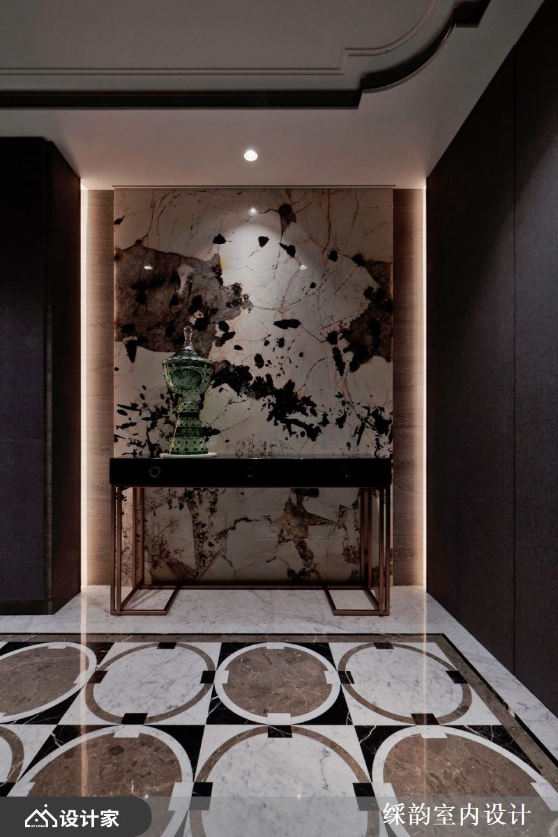 入室后的玄关,铺设饼图腾的大理石地坪,与斑驳质感石材的端景相互辉映;另一侧更搭以驼圆型的拱顶天花,尽头墙面陈列东方色彩的艺术画作与器皿,形塑美学气息的迎宾风尚。公领域以开放隔局规划,客、餐厅兼容一室,冷暖材质相互搭配,调和出轩昂非凡且渐层美感的室内景致,彰显豪宅户型尊贵气度。