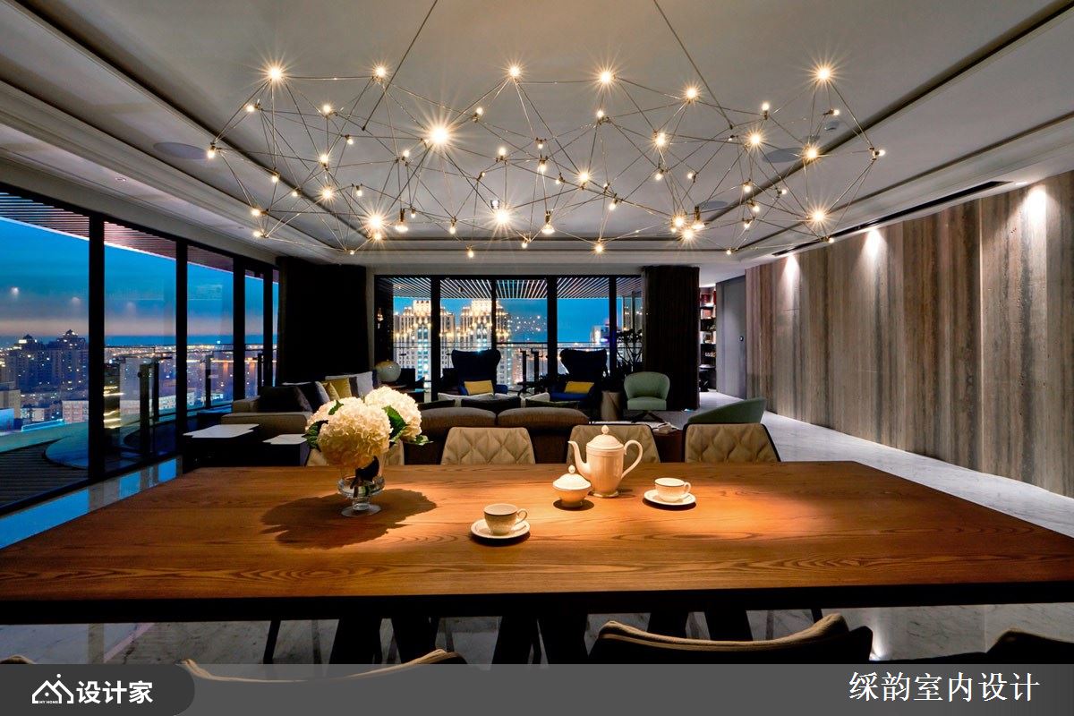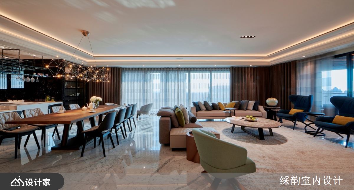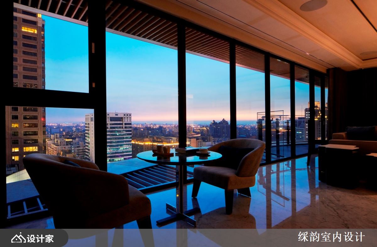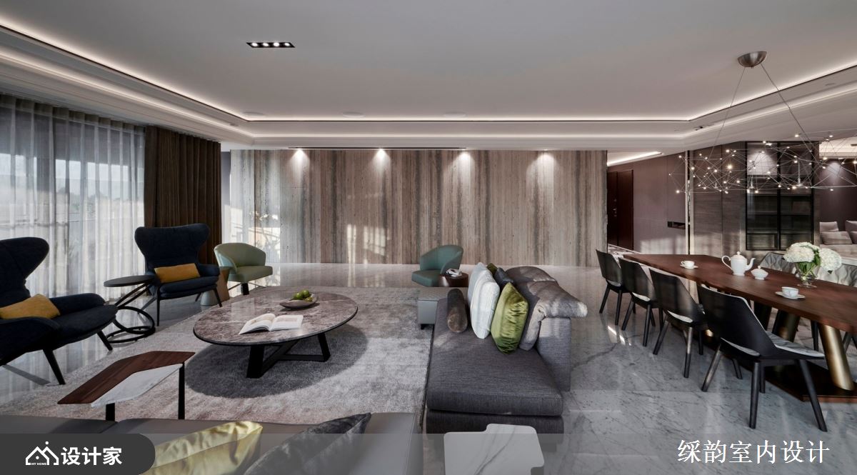 䌽韵设计善用整排窗景设计,延揽户外城市建筑美景,引入充沛自然光线,伴随空间里石材、木纹与布料的演绎,照明的点缀下,烘托用材肌理且交织一片精致美感。