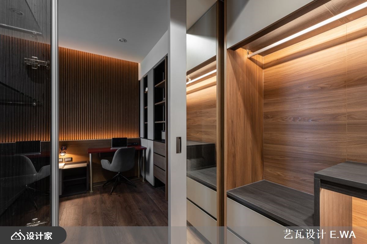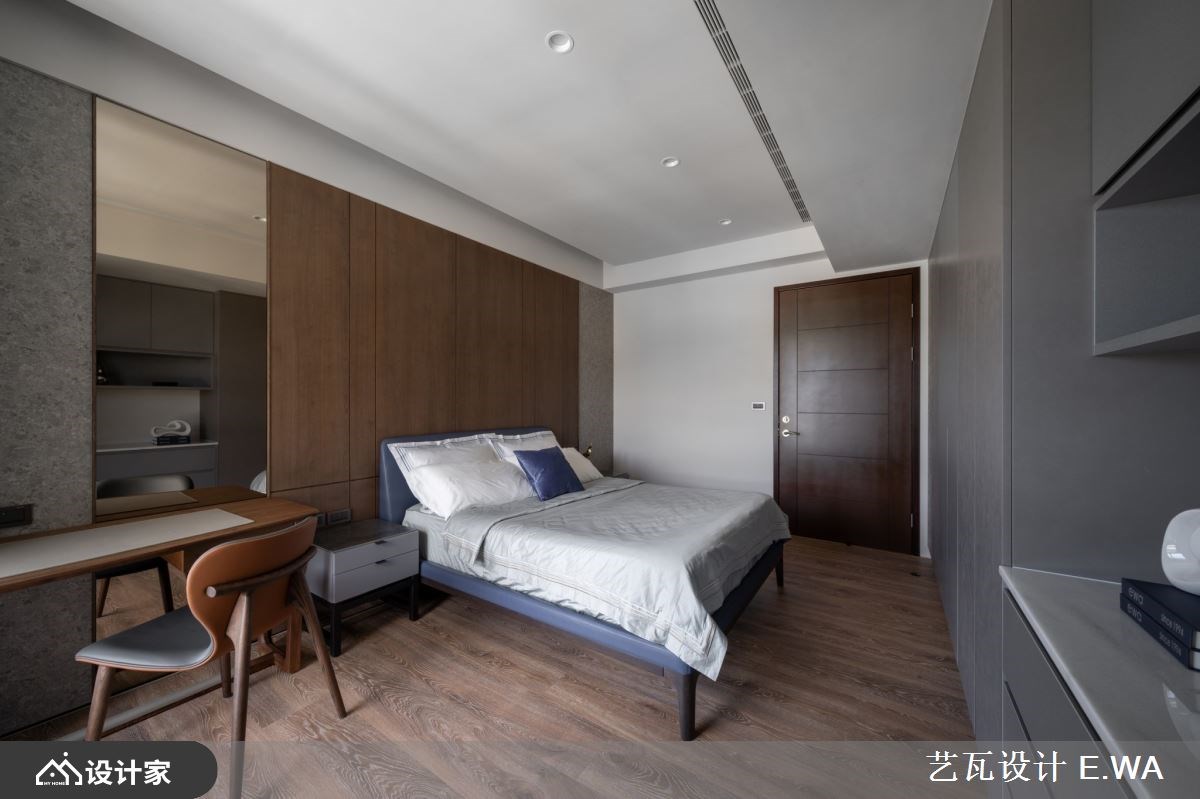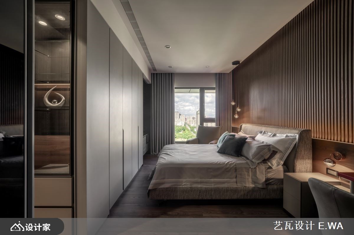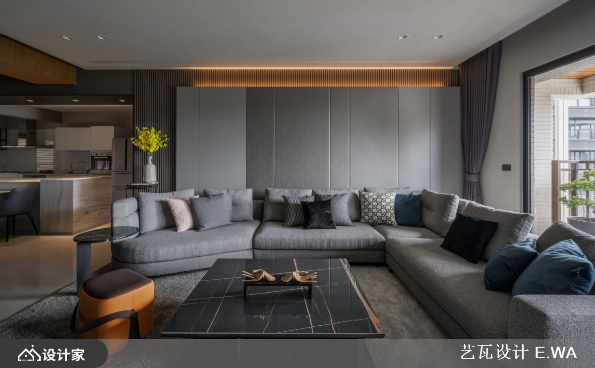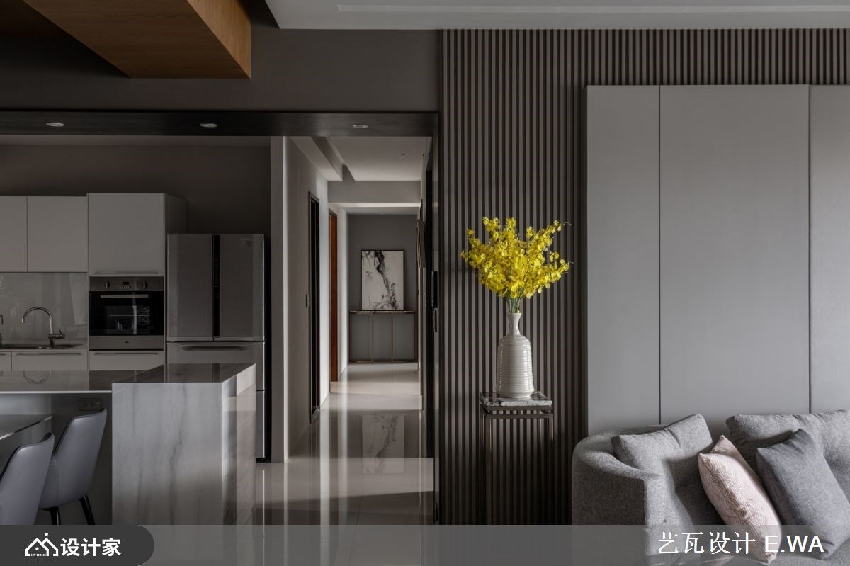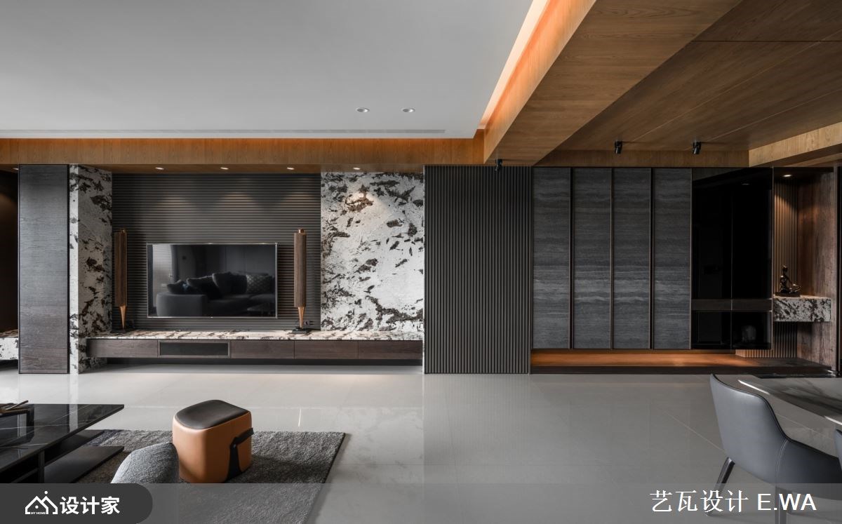 369 平米的现代风豪底里没有水晶吊灯与铺天盖地的大理石,而是将山林景致所见的自然石纹、木格栅带入都会生活,包覆了大量的收纳柜体让其自然隐身于宅邸之中,留下宽敞的空间与宁静的居家氛围,陪伴一家人度过每日的相处时光。 【异材质诠释现代宅的人文与奢华】 精准掌握每一种建材的特色,以石纹板材包覆大面积的玄关柜并用铁艺勾勒,形成意象的泼墨山水;灰色格栅作为过渡设计衔接纹理鲜明的石材电视墙,透过材质堆叠在视线上形塑层次感。客厅与餐厅采开放式设计,不借由隔间或地材化分场域,而是在用餐空间以木皮包覆天花板围塑出人文风情,达到五感的平衡设计。浅灰造型沙发如同山林间的石块,配合窗景靠躺于客厅放松休憩,让心能够真的静下来享受空间的包覆力。 大宅内 4 居室的设计上均以木格栅作为基调,主卧床头辅以皮革的柔软,并将衣物收纳收拢于床尾;客卧则在床头上半部装饰整面木格栅、或以木皮做分割营造出山中宁静的睡眠空间。选用调性与色系接近的系统板材完备卧房所需的收纳、阅读空间等等机能。 小编的最爱 格栅设计如同现代风宅邸里的优雅间奏,为每个立面与转角带来情绪与视觉上的缓冲。配合色调以及光线,百坪空间具备了豪宅应有的奢华气质,同时兼具了人文魅力。