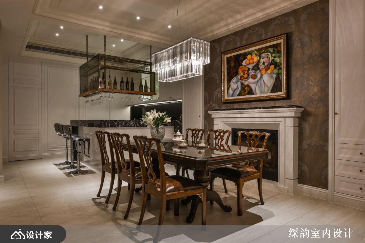 餐桌与中岛并排而行,餐厅里安排一张深色原木餐桌,搭配同样是原木且镂空雕花造型的餐椅,让华美的视觉转为安定、内敛气息,用餐时凝聚起一家人情感;主体墙以融入壁炉灵感,上方安排以水果为主题的油画,呼应领域重点。 中岛吧台结合深色石材,结合吊柜设计,营造出豪宅的高端质感;餐厅一旁还摆设黑色钢琴,随着屋主或宾客的即兴之作,满室洋溢着动人乐章。