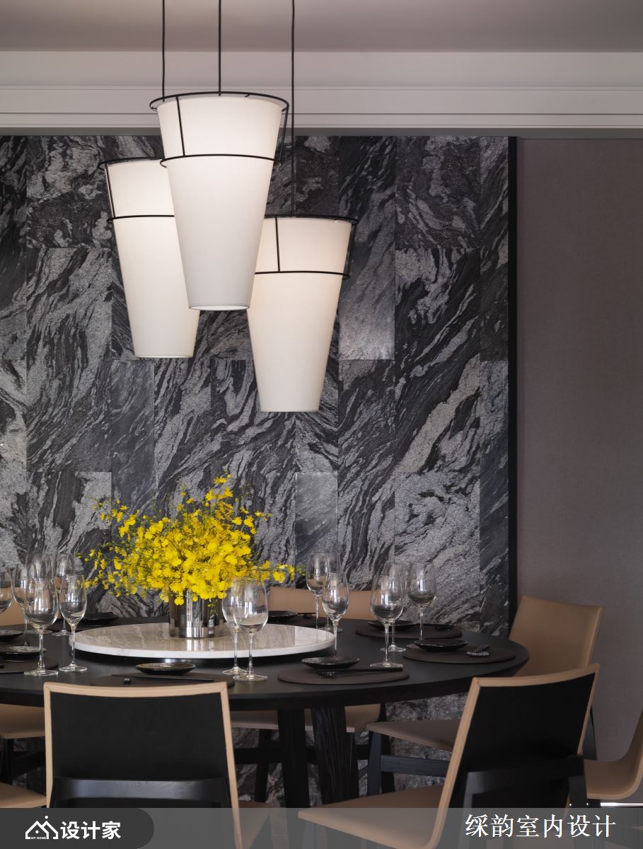 䌽韵设计透过开放餐厅领域的设定,无论是以工业风为设定,大型木纹质感的中岛台安排,搭配高脚椅、餐椅,让休闲质感当中倾注些许优雅情怀,也成为三五好友休闲假日时放松慵懒的好时光;或是木质长桌与中岛并排设计,大量的座位可满足更多亲友到家中来场假日派对,而揉合木纹与铁件材质的冷暖特性,更交织出现代风尚的独特神韵,与点状造型灯源的设计吊灯共谱摩登情境。