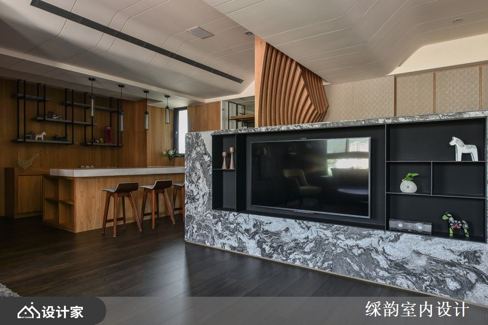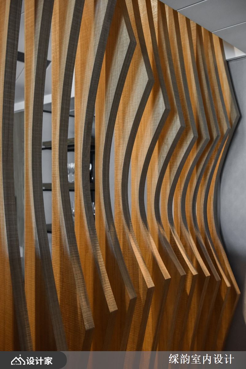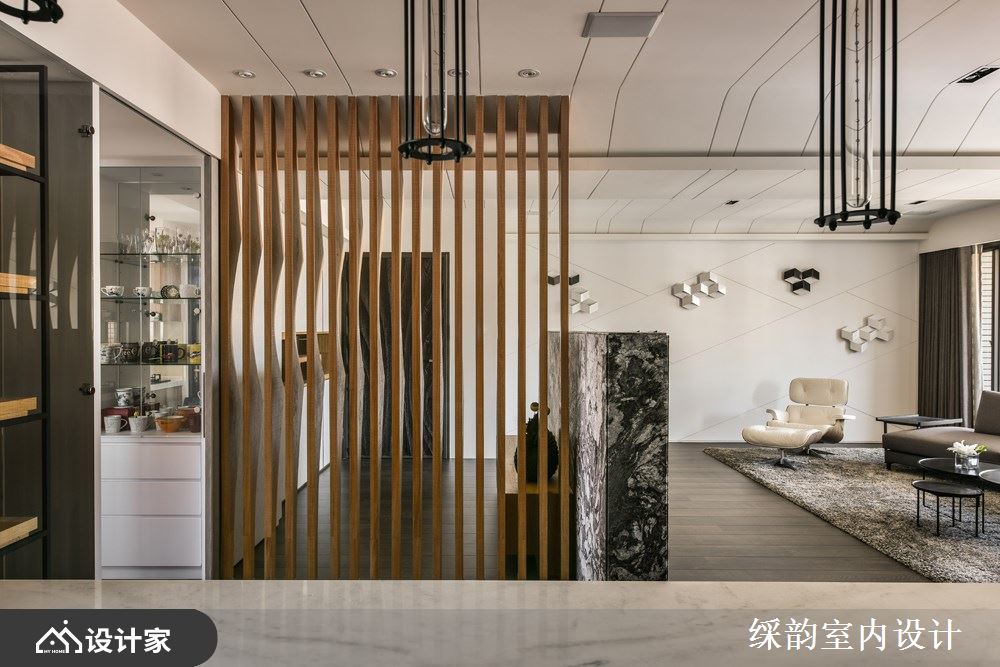 入口玄关处,以一面不规则流线形的格栅造型屏风,巧妙遮住餐厨空间,加上横向量体的电视墙以半高姿态静置在屏风旁,巧妙的翻转位置后,形塑一块落尘区,解决入室后整顿服仪的需求;而半穿透性的隔断手法,不仅界定出内外领域,更让公领域显得完整且开阔。