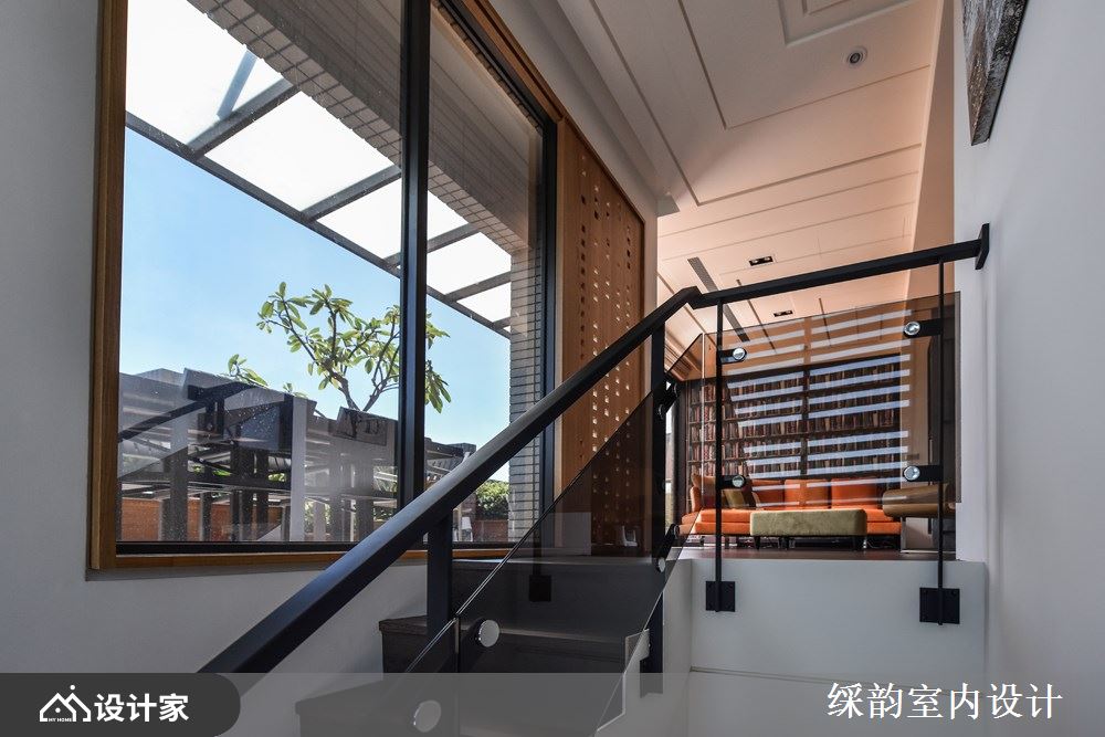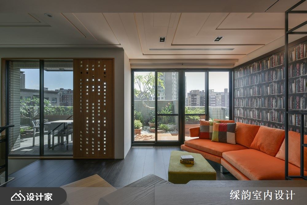 二楼是屋主日常生活的休闲空间,一张抢眼的亮橘沙发登场,而壁面则以书墙造型的墙纸铺陈,营造出浓浓人文质感的书香空间。墙壁搭佐裸露质感的铁件结构展示,赋予空间些许个性;坐在沙发上还可欣赏户外阳台的花园景致,大自然的绿意引入空间里,带来心旷神怡的快意!