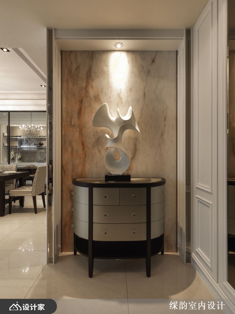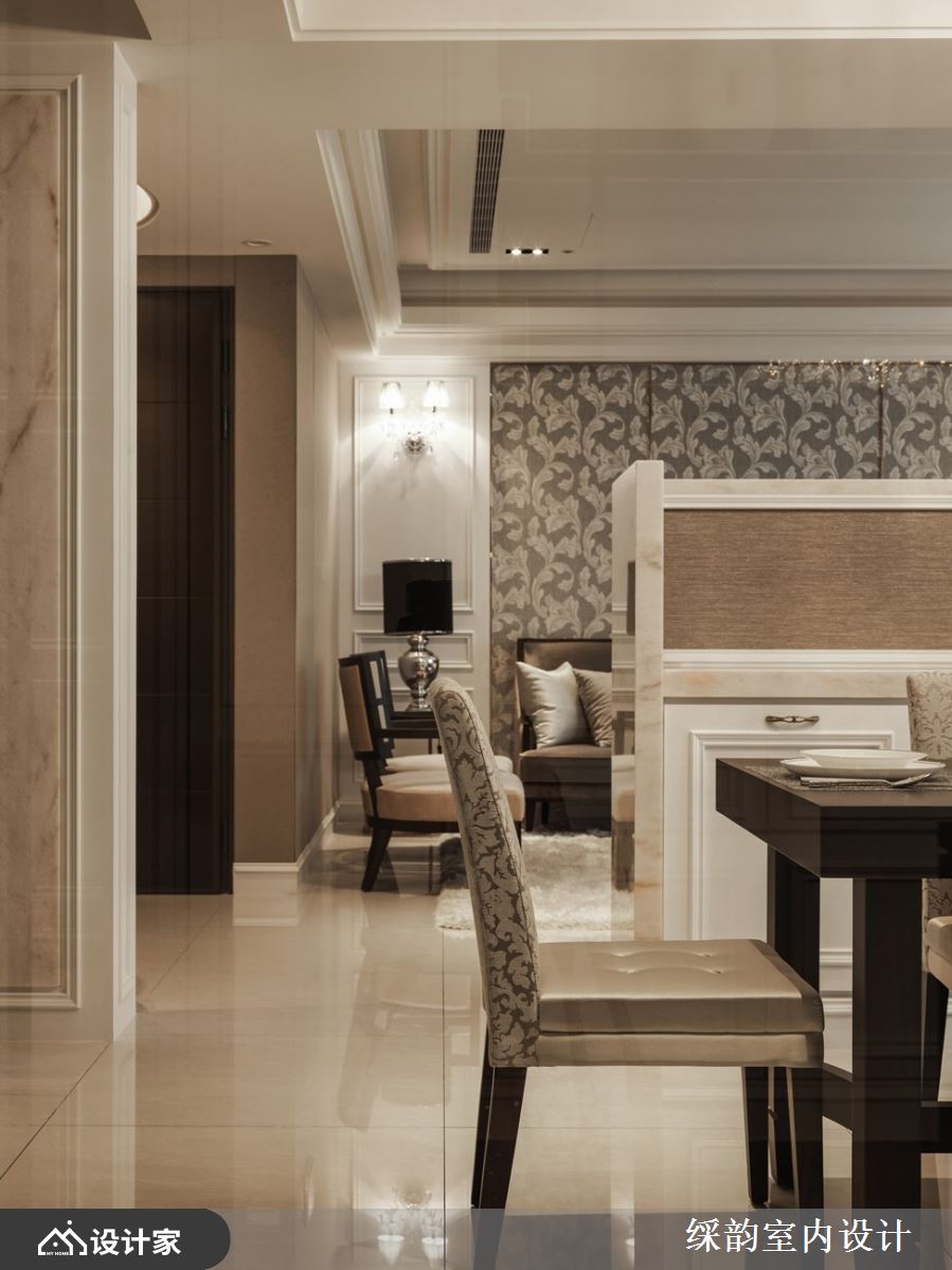 此案为 264 ㎡ 的豪宅府邸,白色线板搭配欧式壁灯,慵懒悠然的暖漾光晕散发宁静气息,流光碎影彷佛和餐厅水晶吊灯互相辉映高雅风情;深色茶几妆点着红铜金属,与纯白长毛地毯型塑刚硬舒软的视觉对比,打造现代古典风格的法式豪宅,空间里各处皆是优雅诗意。