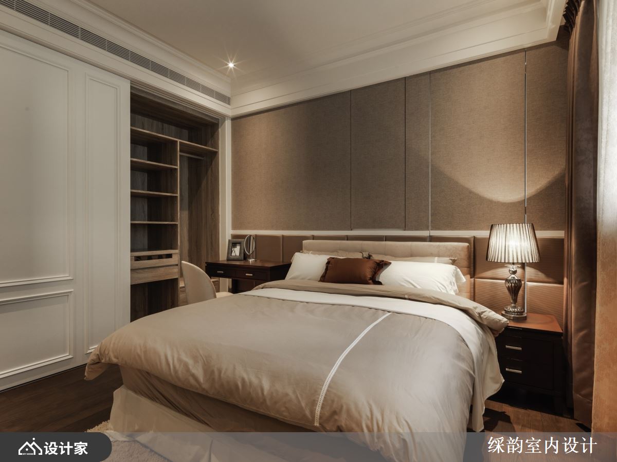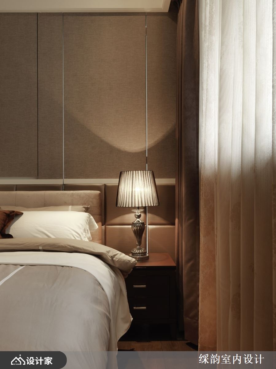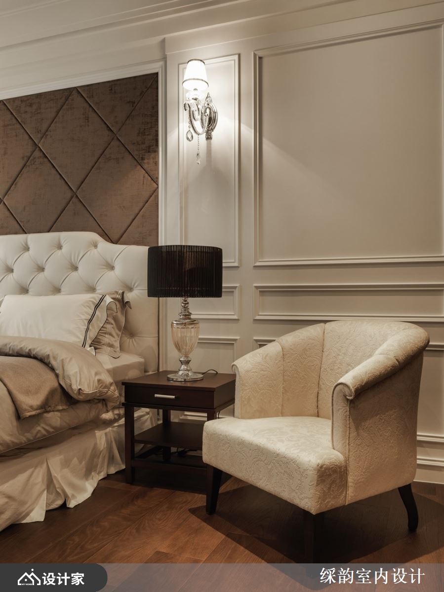 在私领域空间部分,䌽韵设计刻意选用大地色系作为主轴,巧妙连结深色木地板的自然意境与暖心气氛,并以法式古典风格勾勒卧房空间美学,像是主卧的绷布床头墙,菱格造型更诠释出时尚风韵;另外两房则分别以栗棕色调的木质感、纯白色调为主,营造温暖舒适的私人场域空间,让每一位家人都能好好享受专属于自己的沉淀时光。