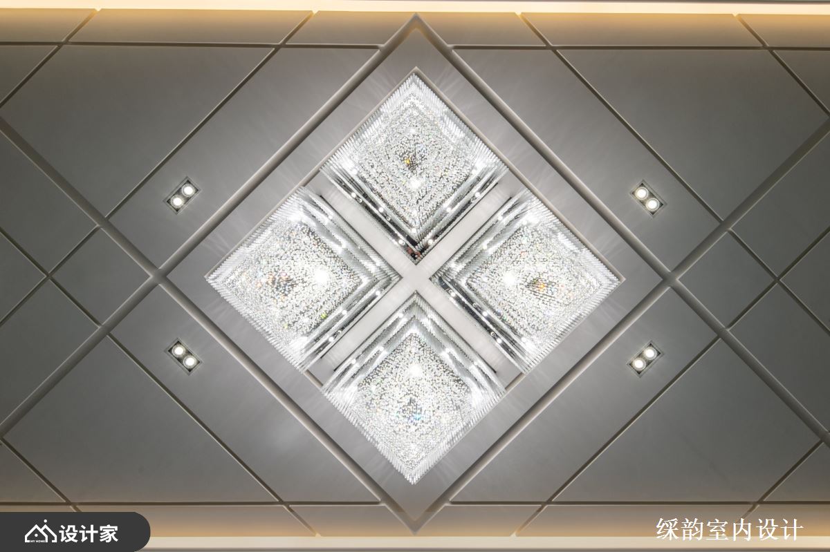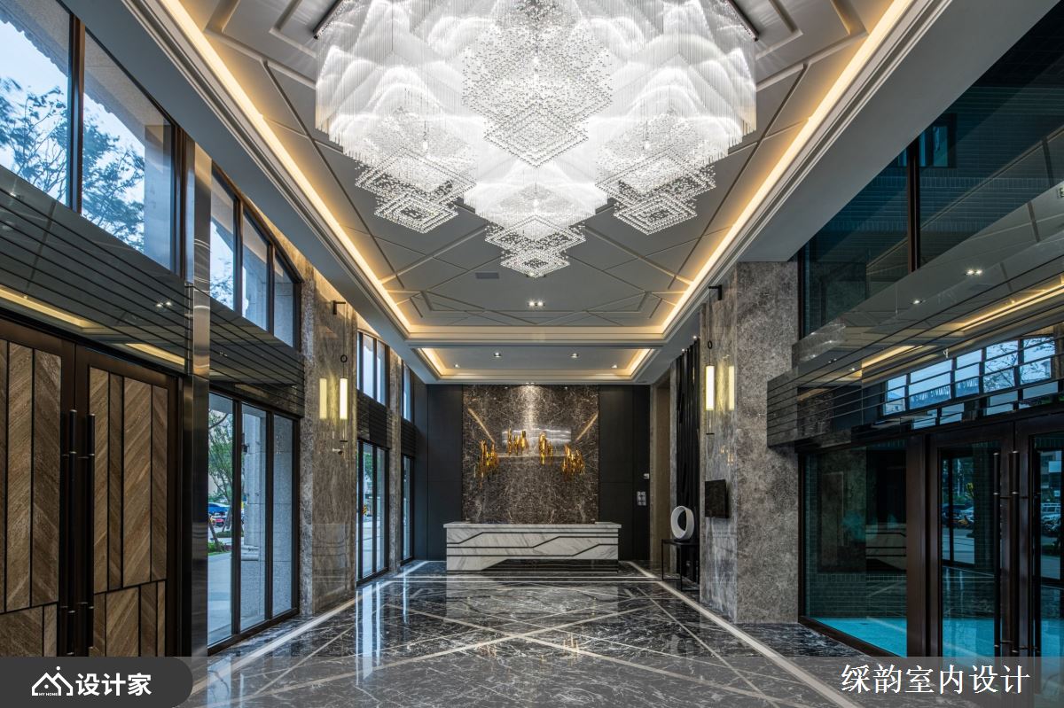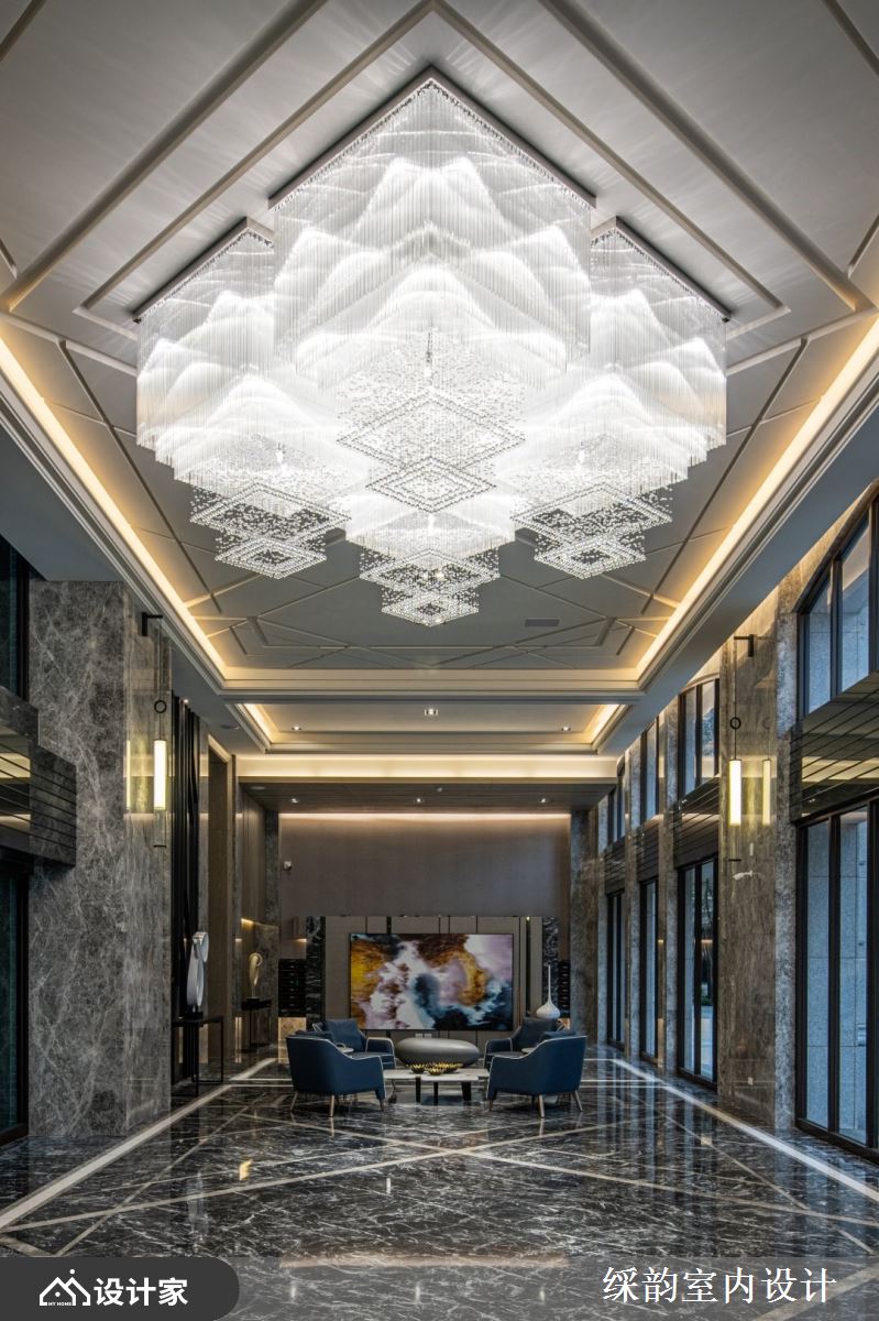 缓步进入高档小区的大堂,两侧墙面以石材与金属错落相间,树立起气宇轩昂的立面结构。仰望银光天花板、俯瞰石材地板的质地纹理,菱形交错的利落线条宛如镜面般映照彼此,上下辉映出璀璨耀眼的入门端景。而位于中间位置的大尺度水晶吊灯,似白瀑悬空般从四个象限奔泻而下,繁复细腻的灯饰工法形成层峦迭嶂的视觉形象,从不同角度欣赏皆各有风情,表现横看成岭侧成峰的山水逸趣。