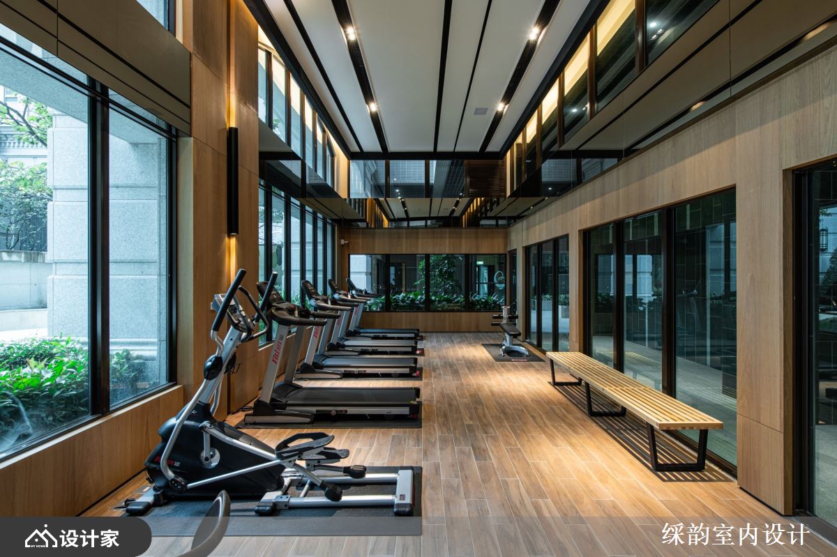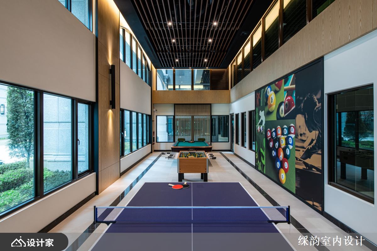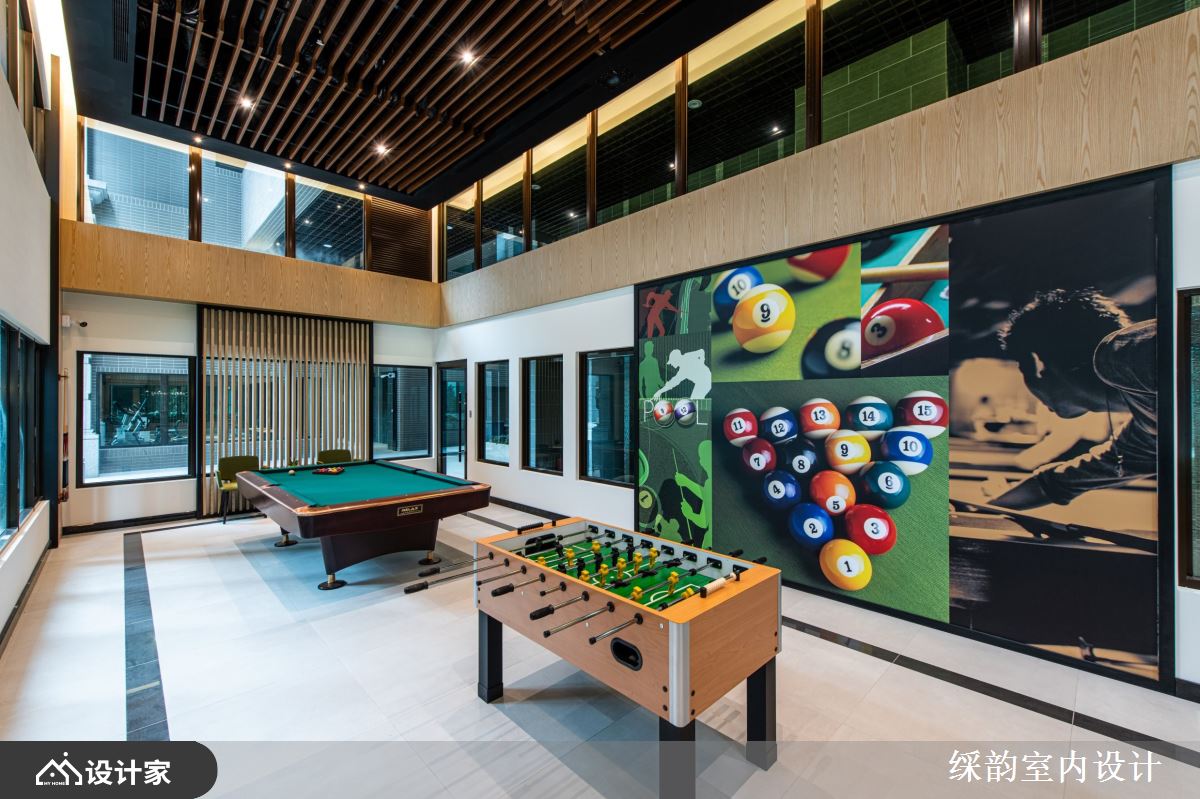 向内穿梭至台球间与健身中心,大面积的暖木质调布满天地壁,格栅天花板伴随灯光向下延展至墙面造型,创造动中有静的沉稳气韵,并依循匀称平稳的视觉安排,以乒乓球桌、台球桌的缤纷色彩拉高空间彩度,让众多居民能够聚集在此处,藉由大汗淋漓的运动竞技,享受邻里和睦的关怀情操。