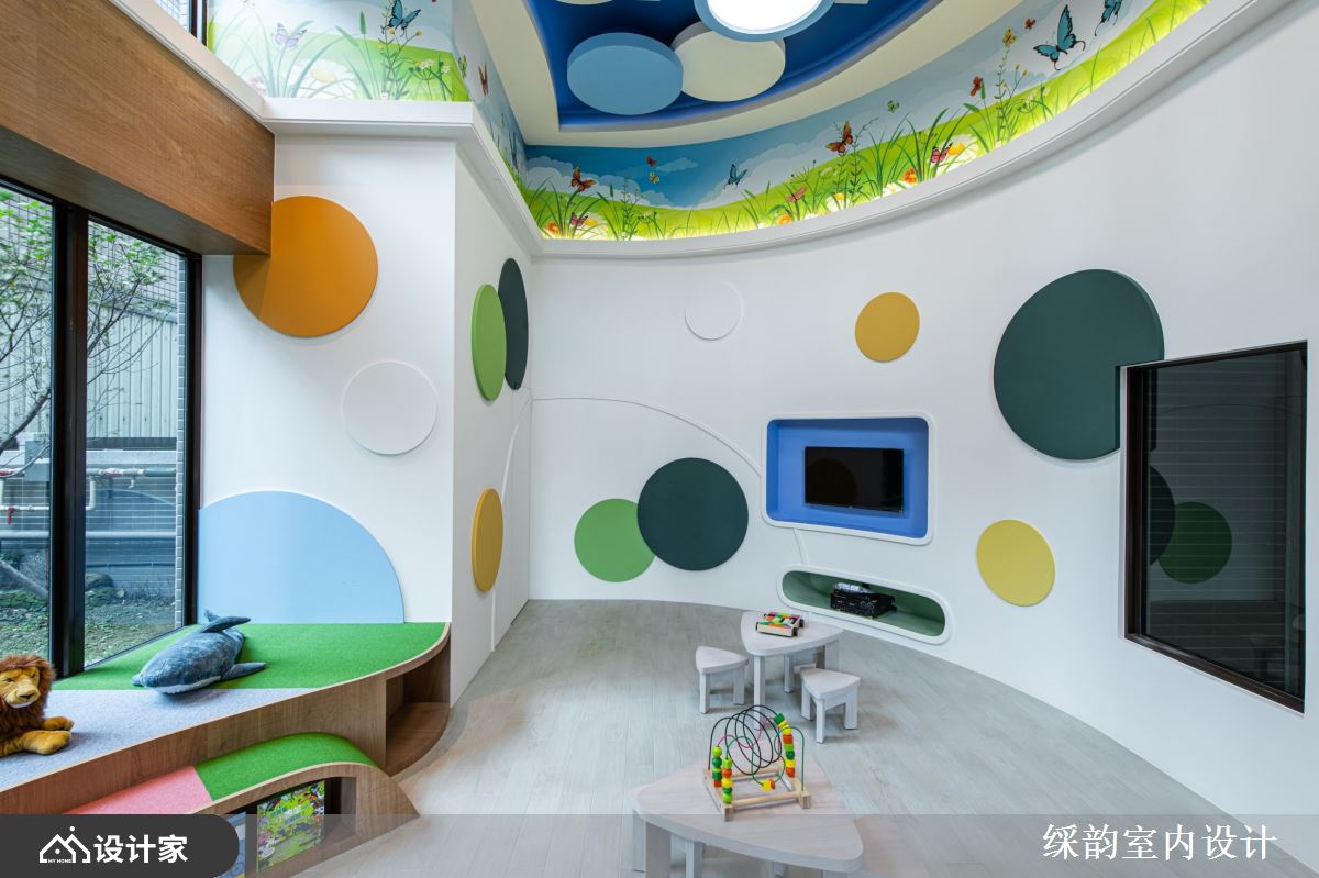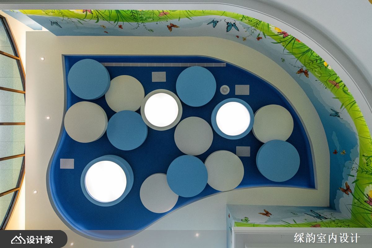 转身前往提供孩童阅读书籍的图书室,五光十色的大小圆点绽放于四周墙面,仿佛调色盘挥洒着孩子源源不绝的创意。坐在罗马斗兽场般的层层座椅上,昂首一观,蓝白相间的圆点转化穹顶的云朵意象,大胆描绘前途无量的未来蓝图。交谊空间以自然建材拓展开阔气度,并有条不紊界定休闲聚落的适当距离,使得浩瀚知识与美食飨宴能伴随欢声笑语在空间回荡不已,成就一幅幅典雅堂皇的隽永光景。