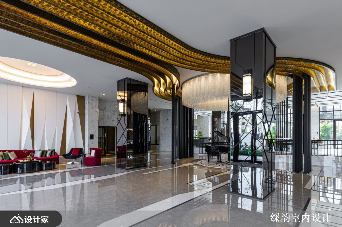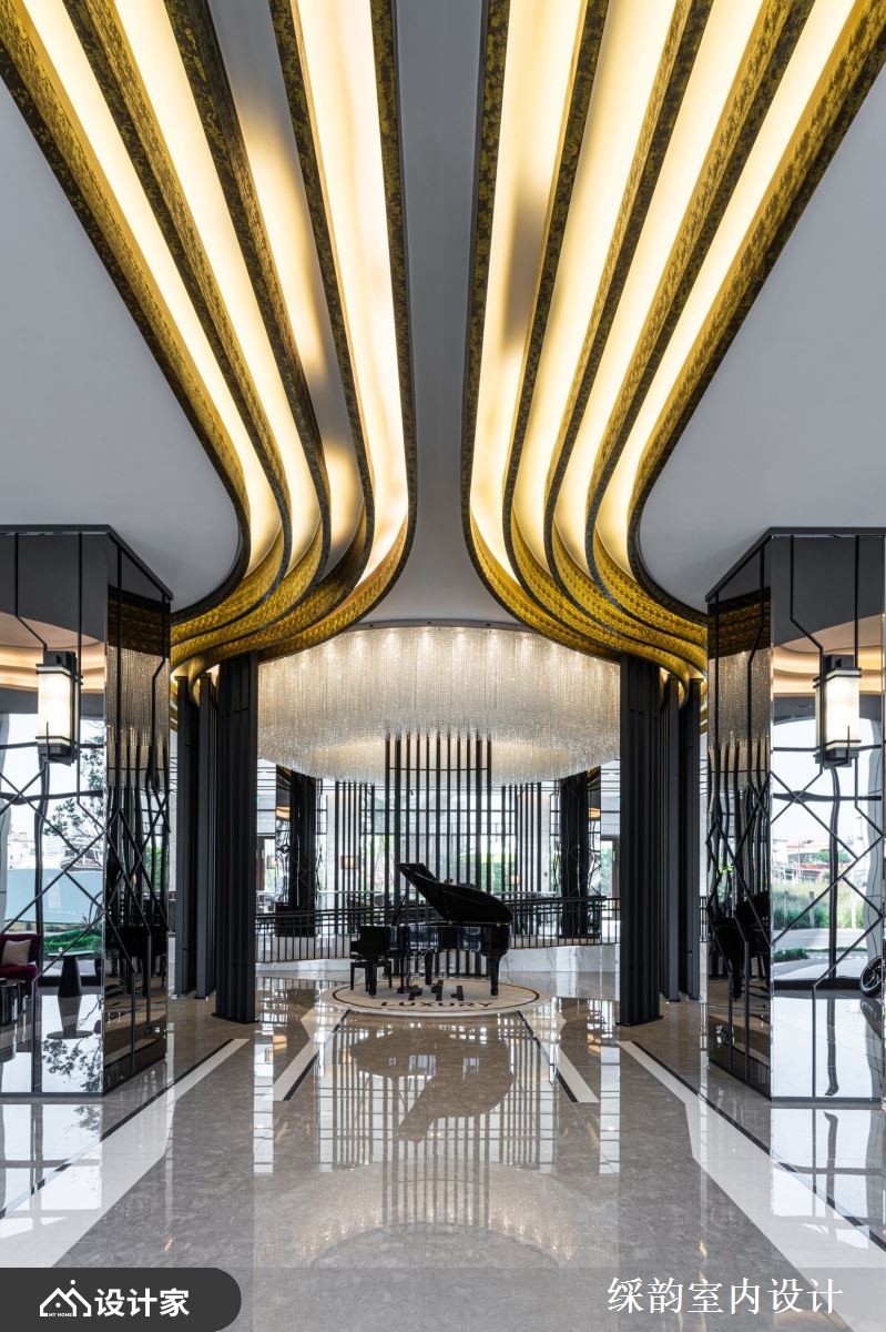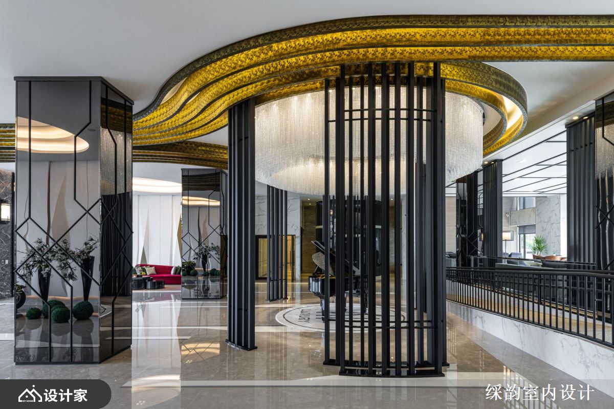 大堂门口即运用铁艺格栅、灰镜诠释现代风格的都会摩登气息;步入室内空间,柱体镜面、大理石地板与瑰丽璀璨的水晶玻璃灯具映照出高奢尊贵的雍容底蕴,天花板里衬的澄黄暖漾光线悄然流泻出极致华美逸趣,既是设计的焦点,同时也让场域氛围多了黄金光芒的润泽,彷佛群龙盘旋、攀云而上的生动姿态。