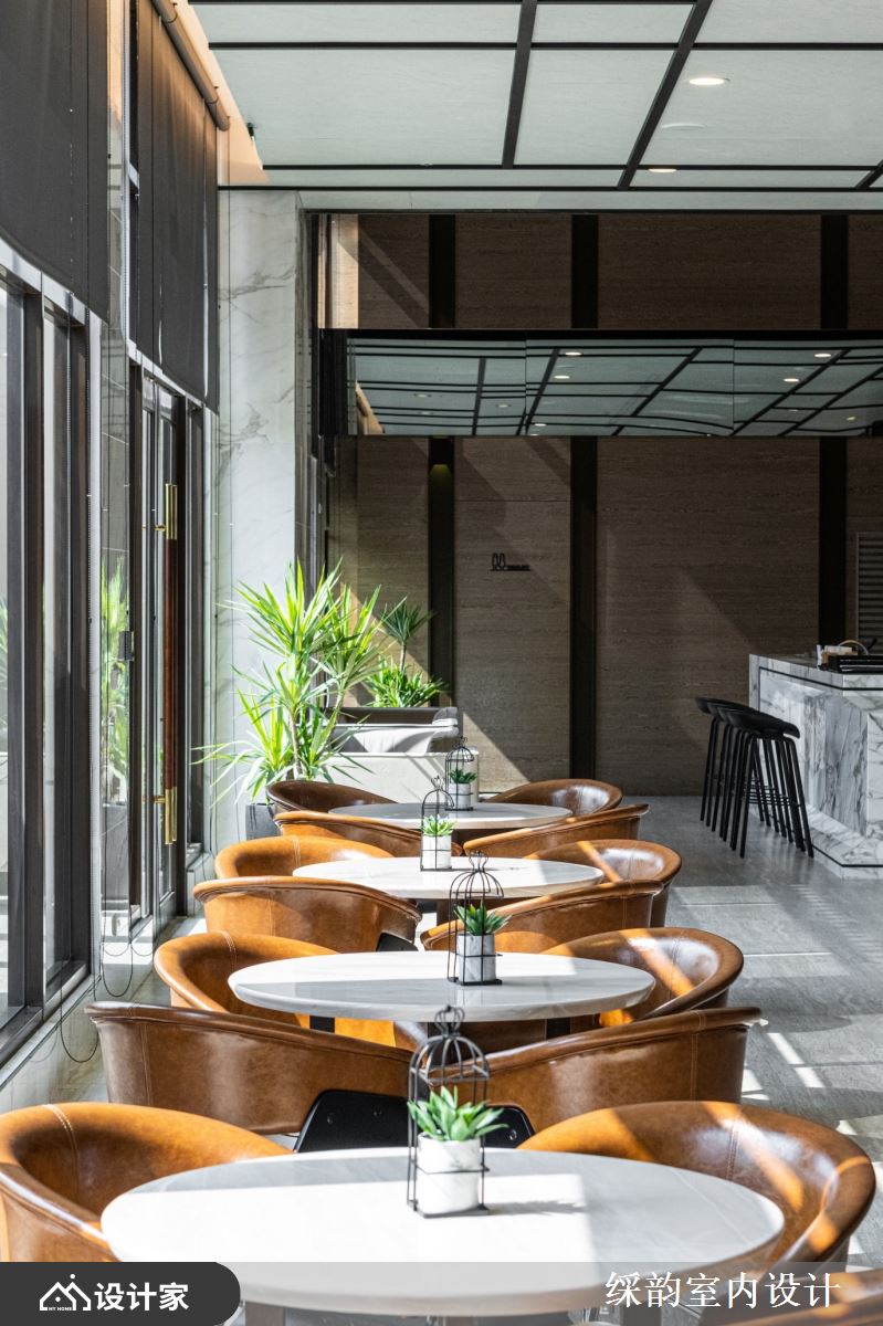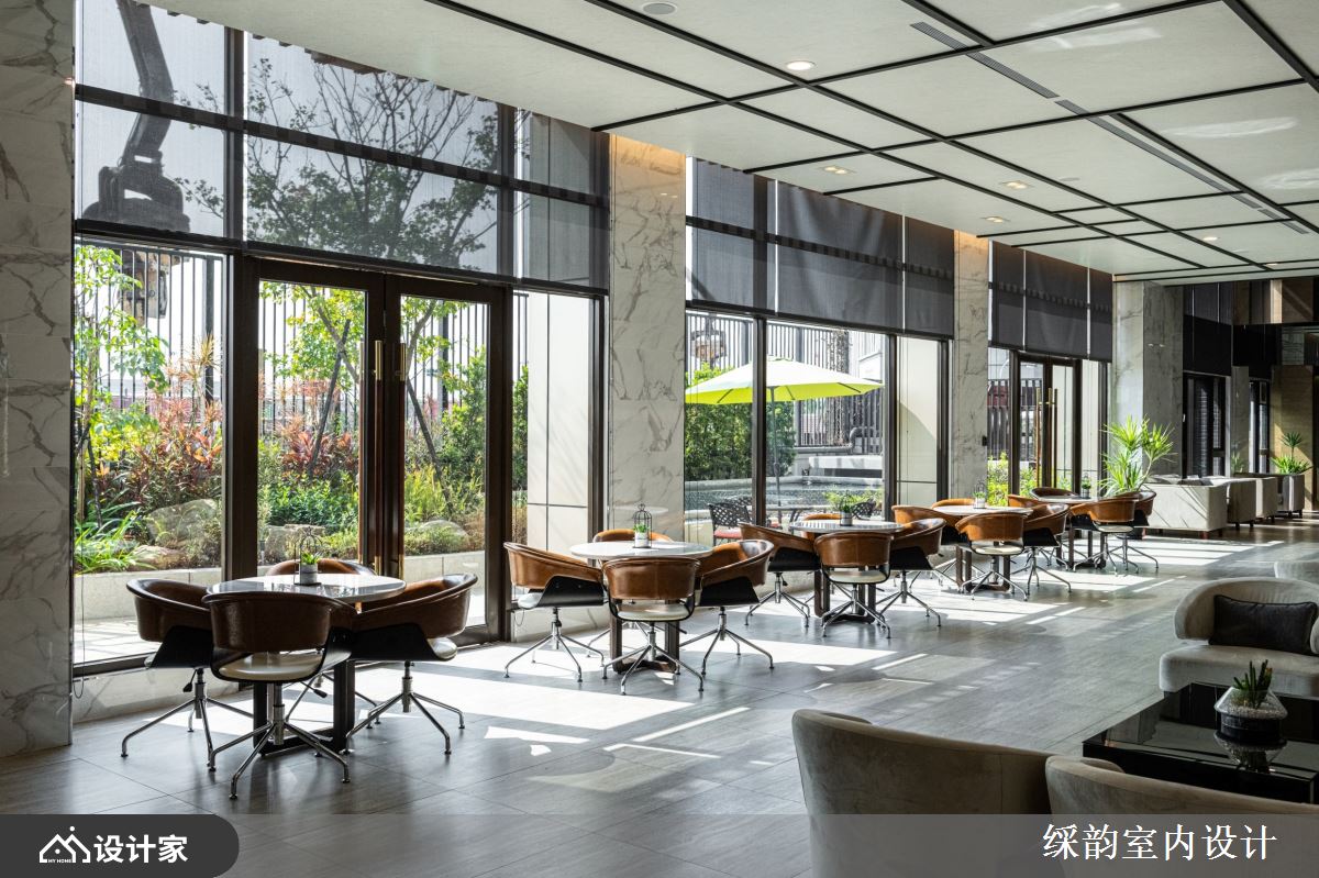 缓步入内,挑高七米四让垂直视觉多了份量感,延续建筑外观入口处的精髓元素,铁艺格栅和灰镜的置入让空间更有连续性,大堂的交谊空间搭配明亮充颖的落地窗采光,同时将四周绿意造景延揽入室,郁郁青翠与敞朗光感同时纳入灰镜映照之中,模糊户外与室内的场景边界,烘托宁静致远的惬意气氛。