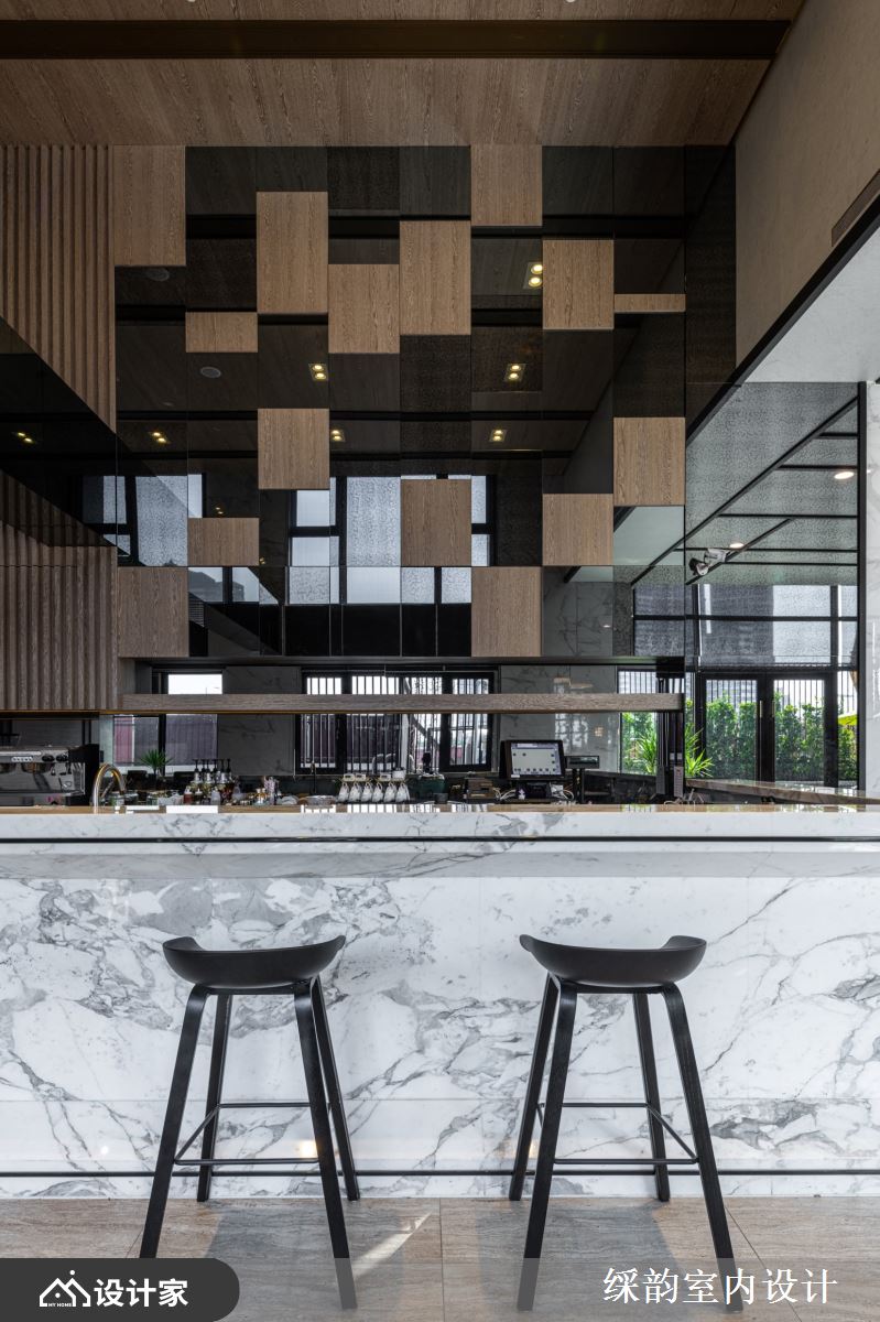 在豪宅设计美学之中,异材质的建材相互搭佐,更能显现上档次的层次意境,像是此处的白底灰纹大理石吧台,在灰镜、木质的几何拼接墙面上,共谱出多元不凡的设计巧思,不规则、不对称的排列呼应着跳脱框架的崭新美学,镜黑、暖木、冷灰、冰白,迭合出隽永肃穆的高端景致。