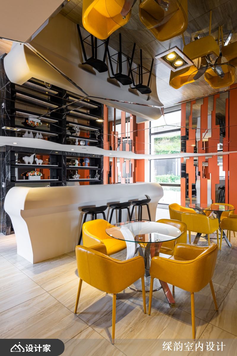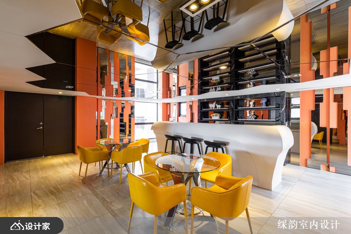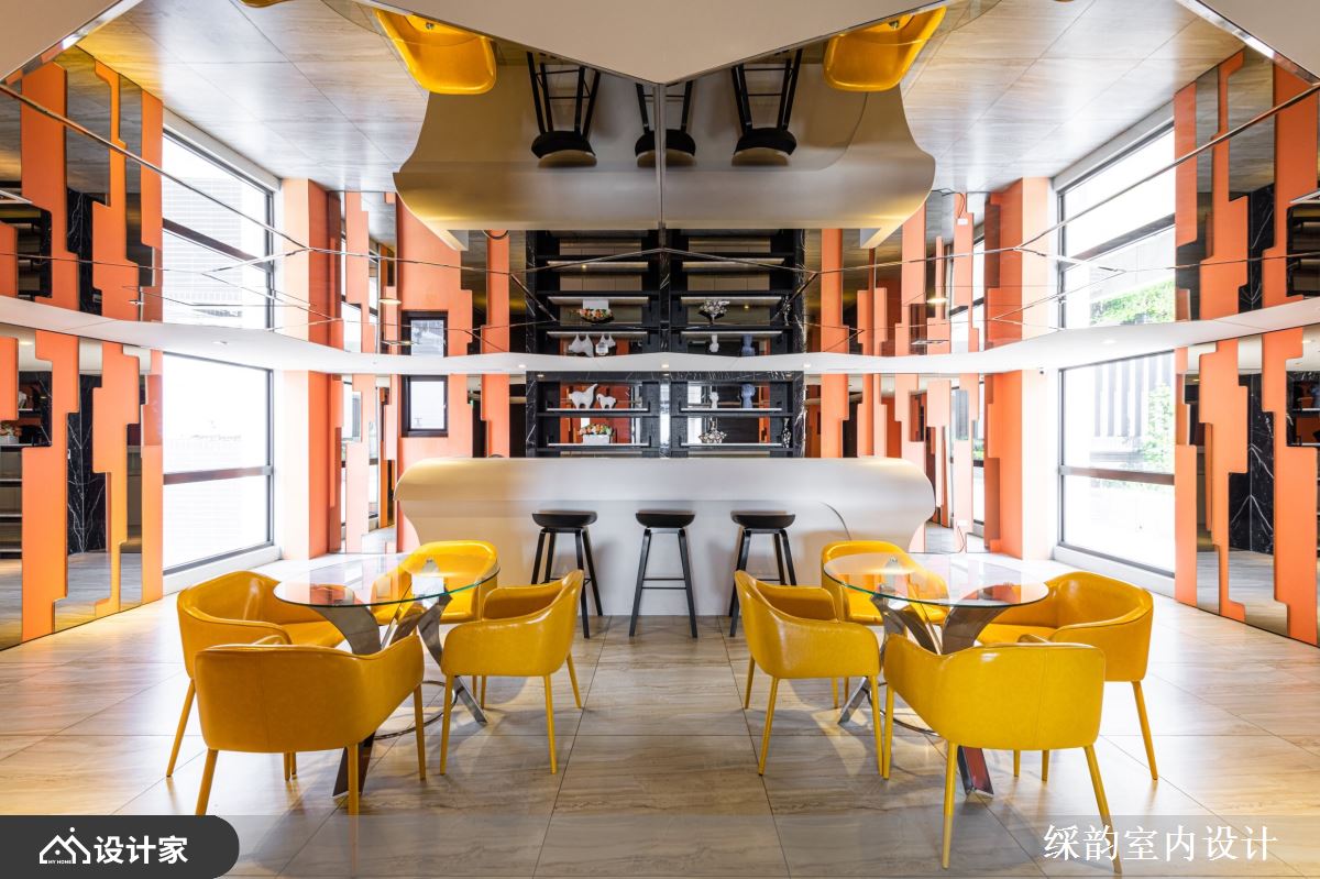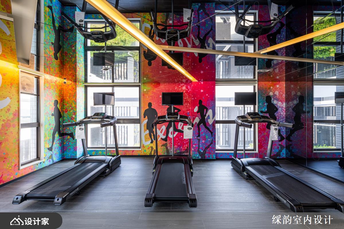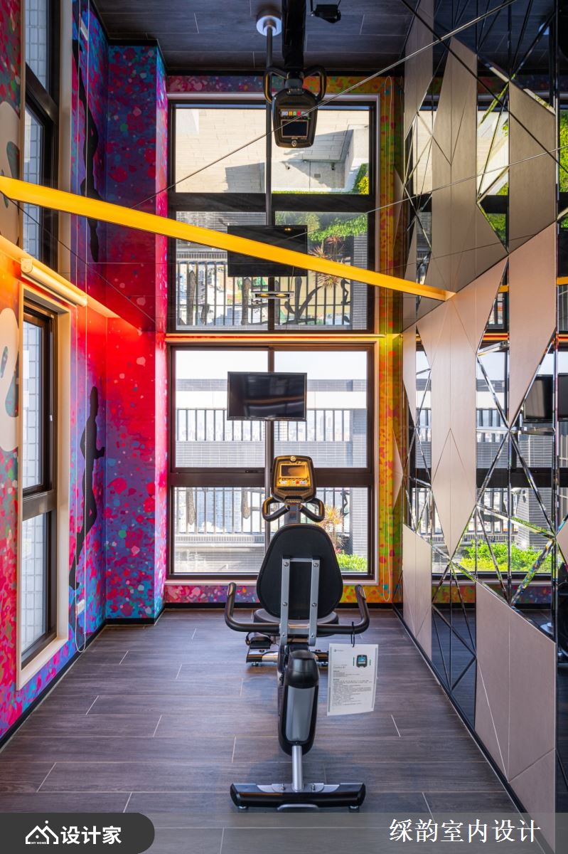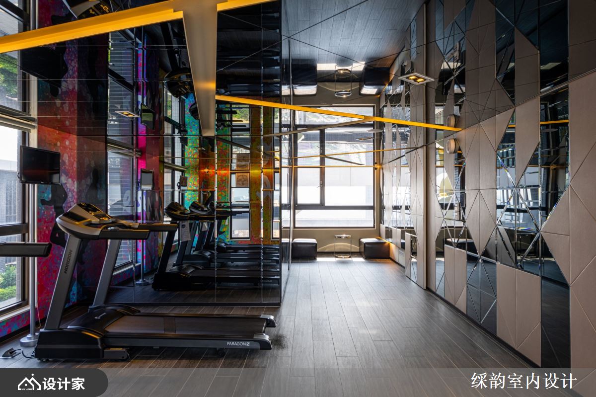 至于另一区交谊空间则较为隐蔽,适合深谈、洽商等需求,天花板以镜面映衬空间调性,扩大空间里的垂直向度,并运用爱马仕橘墙面与鲜黄色单椅增添空间彩度。健身房则以缤纷彩虹墙面与几何切割的镜面天花板光带,呈现缤纷活力与速度感,更与入口大堂的灰镜映照遥相呼应,打造时尚而现代的高端小区大堂设计。