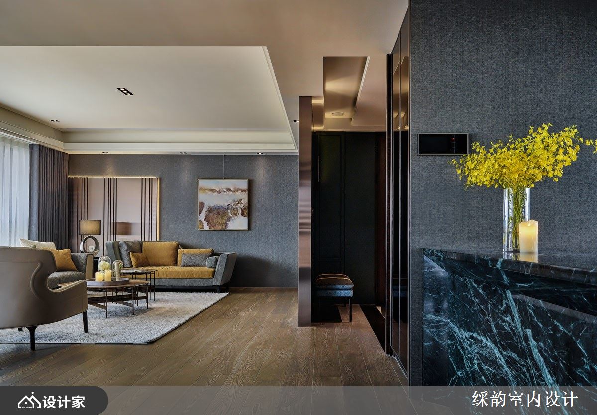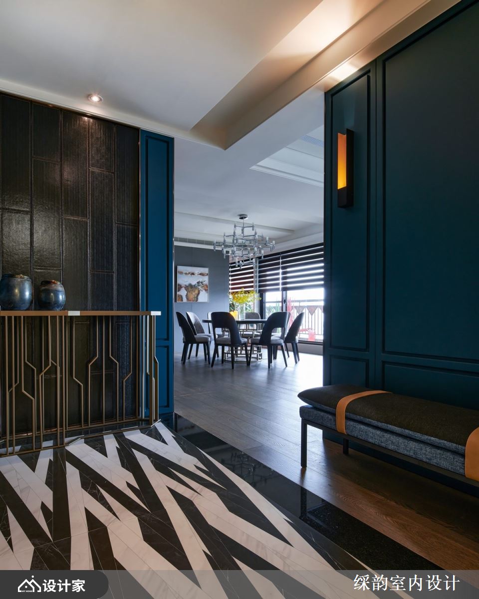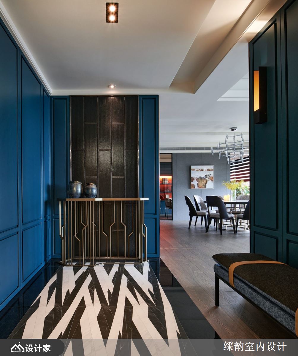 豪宅装修可以有如何的色彩计划?为了打造深具风采的豪宅空间,䌽韵设计在低彩度色调之间融入蓝、黄、橙作为鲜明之缀,充分诠释独一无二的设计巧思,同时也更具现代风格的大器风范。 步入玄关,地坪的黑白大理石层迭相间,搭配端景墙面摆放艺术逸品,呈现彷佛高端艺廊般的雅致气息;靛青绀蓝色的玄关墙面替豪宅空间拉开了色彩序曲,一旁的穿鞋长凳让每个出门穿鞋、回家脱鞋的时刻更加优雅便利。