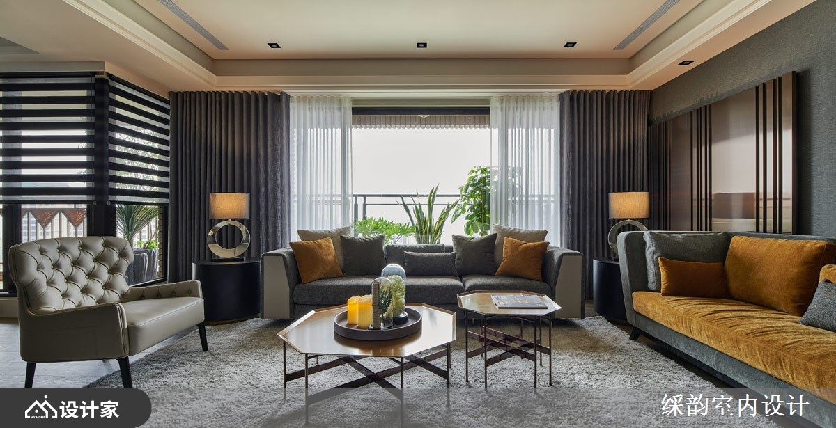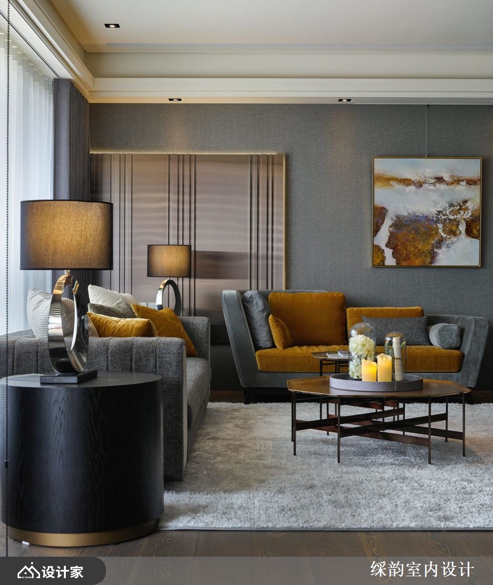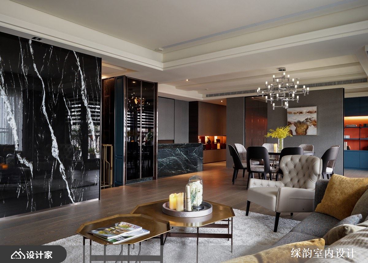 豪宅装修可以有如何的色彩计划?为了打造深具风采的豪宅空间,䌽韵设计在低彩度色调之间融入蓝、黄、橙作为鲜明之缀,充分诠释独一无二的设计巧思,同时也更具现代风格的大器风范。 步入玄关,地坪的黑白大理石层迭相间,搭配端景墙面摆放艺术逸品,呈现彷佛高端艺廊般的雅致气息;靛青绀蓝色的玄关墙面替豪宅空间拉开了色彩序曲,一旁的穿鞋长凳让每个出门穿鞋、回家脱鞋的时刻更加优雅便利。