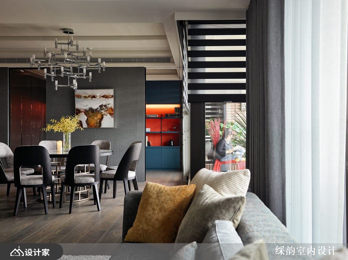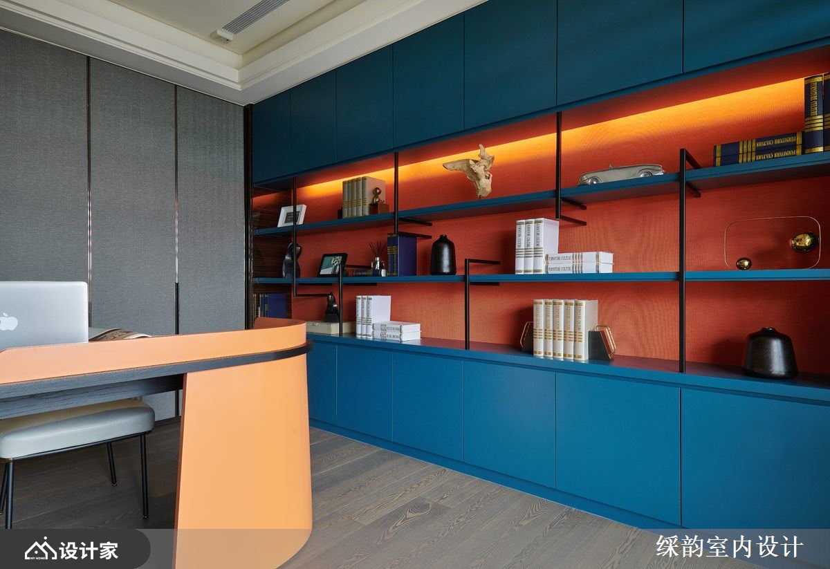 客厅沙发区运用黄栌缃色巧搭灰阶色调,与台灯的暖漾澄光相映成趣;餐厅则以意大利灯具品牌 NEMO 的 Crown Major 吊灯展现都会摩登的质感品味,并以一墙之隔轻盈利落的区隔半开放式书房,此处以夕阳燃橘般的色调,与蓝色调做出鲜明对比视觉,色彩活力跃然而出。