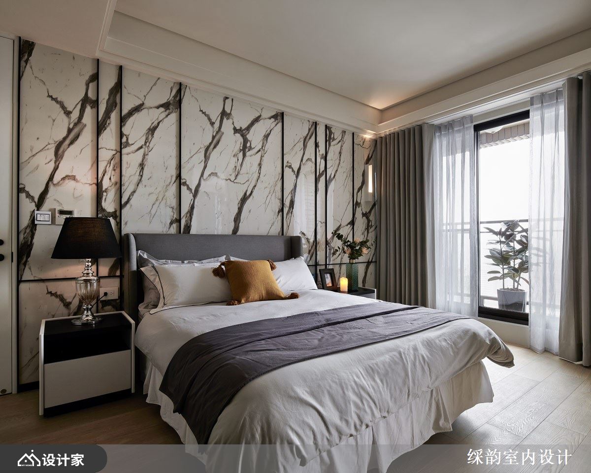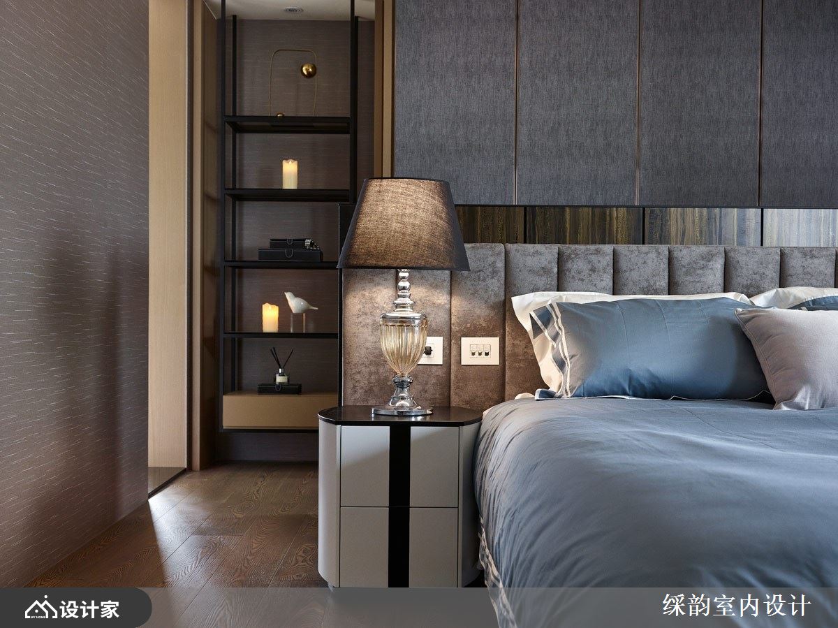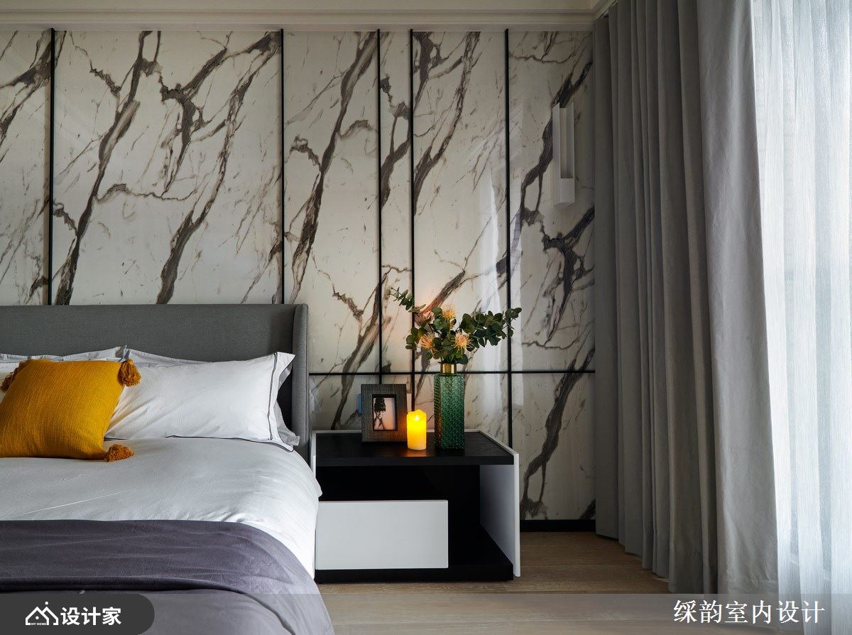 舒缓气氛的私人场域,有助于屋主在睡前凝聚更多沉淀时光,使人身处惬意放松的轻柔包覆中,以主卧为例,除了使用莫兰迪色系的黛紫、群青、浅灰色韵作为铺陈,卫生间更有独立式浴缸,搭配充沛霁朗的光感情境,让泡澡时刻更有闲适之情;而次卧的床头墙面则以白底灰墨大理石谱调雍容尊贵情韵,延续公领域的低调奢华都会质感。