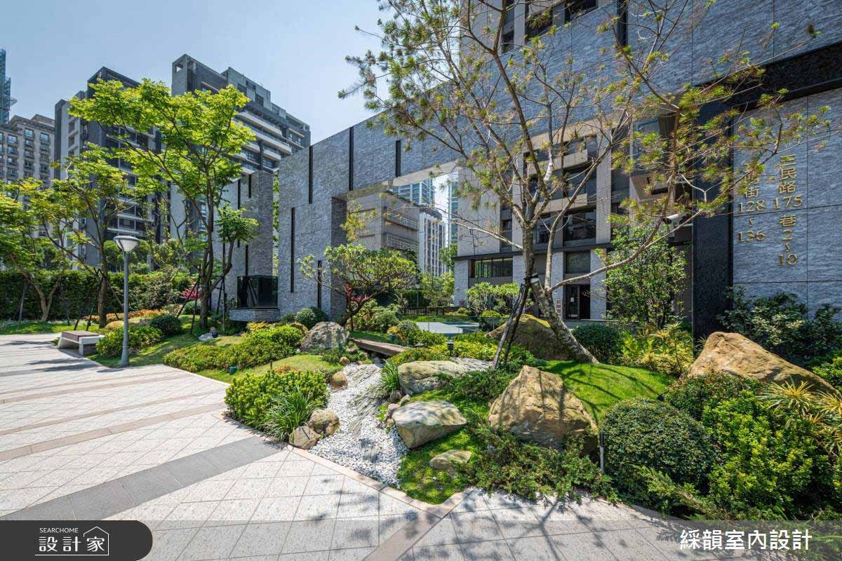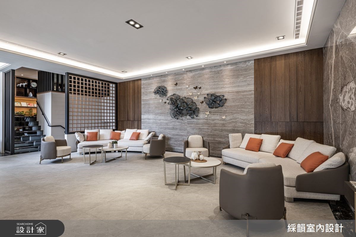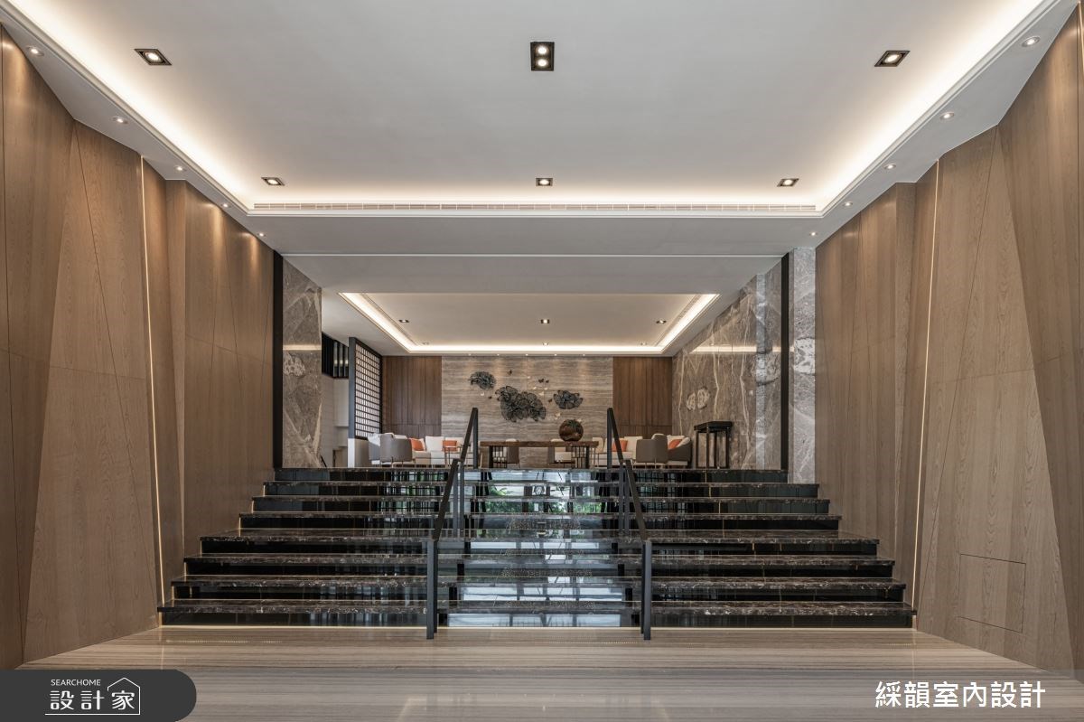 石纹作为大厅地材,将庭园景致化为立体泼墨山水形塑大厅的壮阔气度;木格栅垂直向上延伸,宛如山林树木的宏伟凸显大厅的挑高优势。视线被带向天花由镀钛编织成立体格状灯饰,如同耀眼星空般温暖明亮洗涤了城市的喧嚣烦躁。 【将山林野趣带入住宅大厅】 顺着大厅往内,由深色大理石堆砌出的阶梯往上进入大厅接待区,两侧木质几何造型打造进入室内的过场沉淀心灵。穿越阶梯后映入眼帘的是宽敞的休憩区,墙面横纹大理石带着流水石纹并点缀凤蝶装置艺术;木质包覆两侧延续山林意象,搭配通透的木格屏风,将带有禅意的山林野趣完美移植到室内空间。活用梯侧畸零空间规划静谧的茶水间,打造机能与美形兼备的休憩接待区。 沿着如山林小径的阶梯更往上层,地面从石材转为温暖的木地板,木质与石材比例反转后放松的氛围更为浓郁,配合采光与灯饰的配置,在精品建筑里打造大隐于市的幽静书屋。视听空间以 L 型沙发将 lounge 的慵懒舒适带入现代建筑,健身房以木质包覆三面空间并设计格栅与线性灯饰,让住户在室内健身时能边沐浴着阳光感受到与户外运动雷同的清新氛围。 小编的最爱 户外庭园运用现代建材诠释小桥流水的悠然画面,打造都会区独有的自然景观。植栽丛生遍布庭园,草皮、树木与盆栽掩映出一抹诗意,透过大厅的挑高落地玻璃引入庭园景致,在户外自然与室内空间内找到绝佳的平衡,让绿意与人造建筑共荣共存。