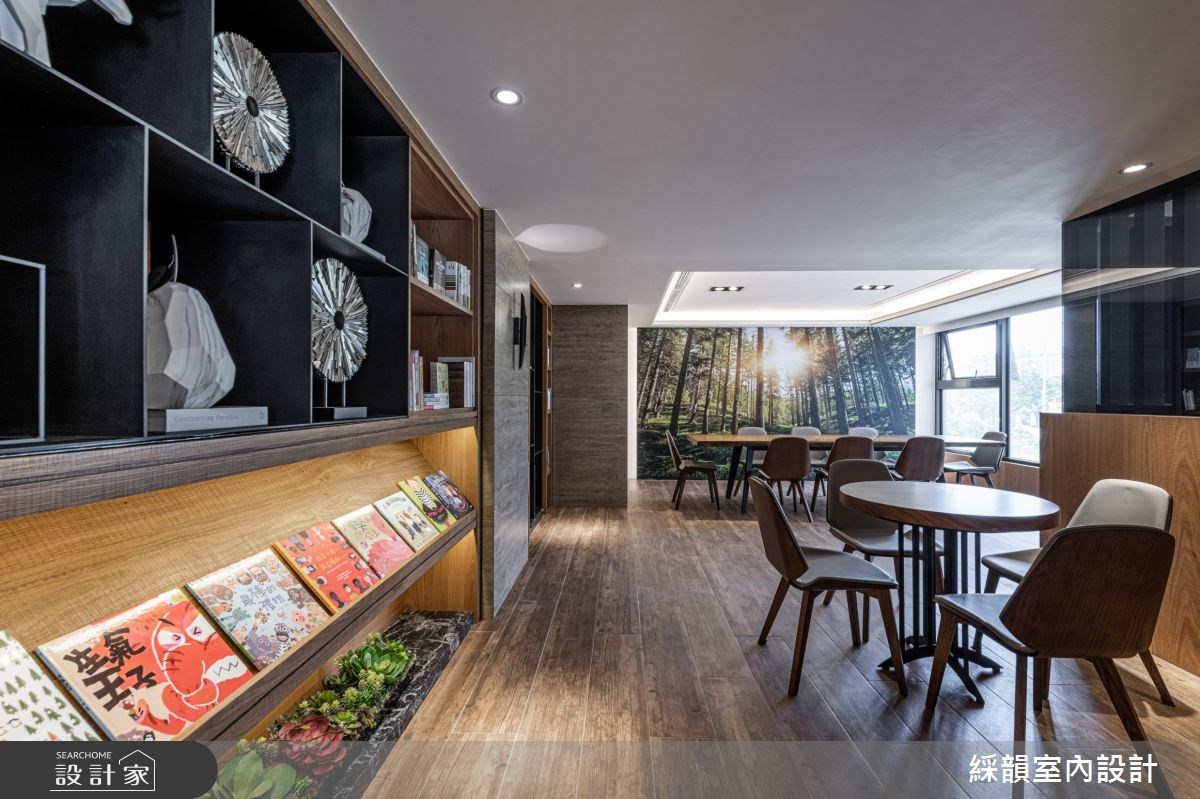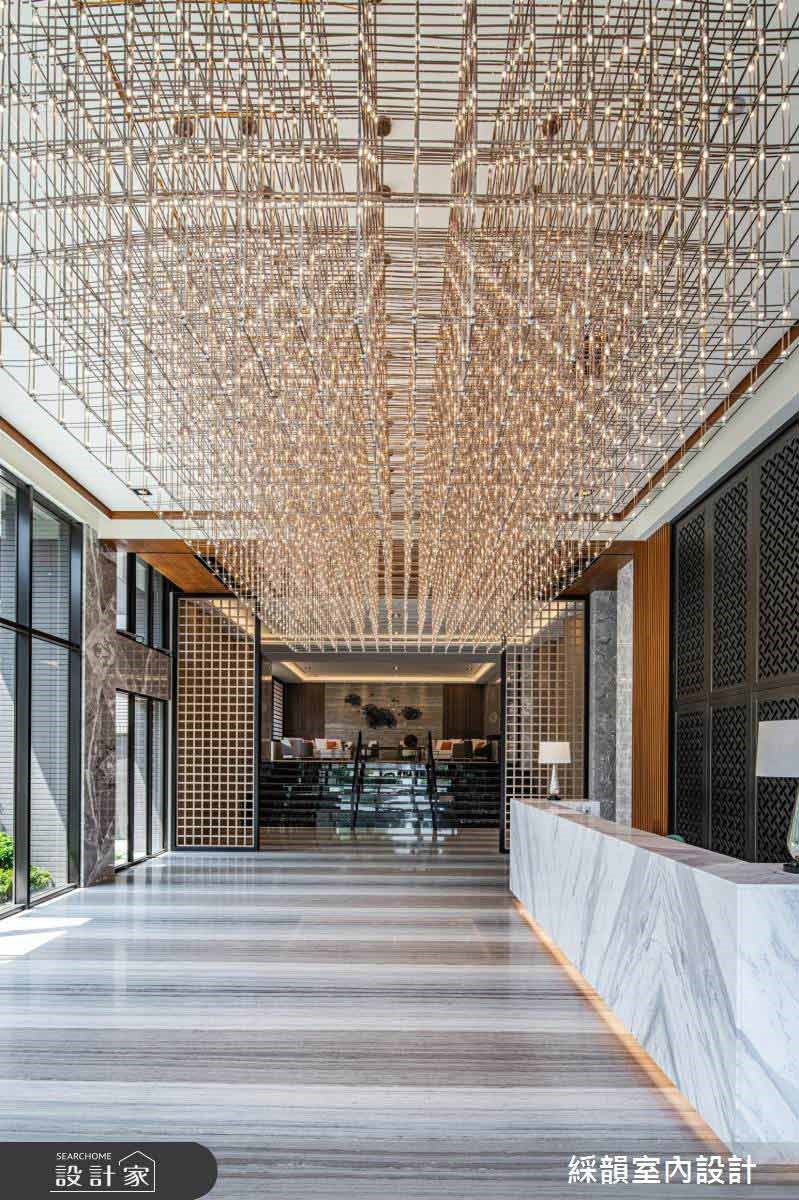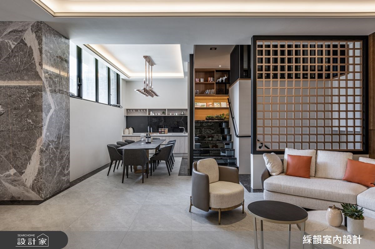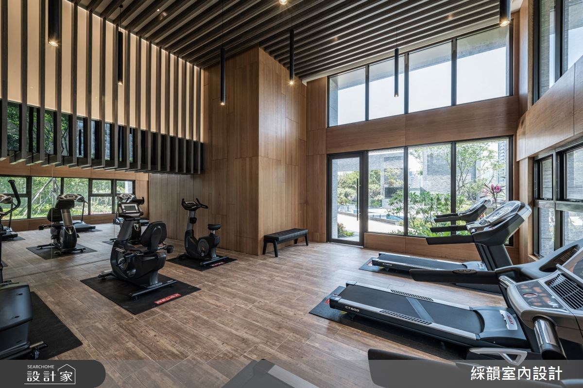 石纹作为大厅地材,将庭园景致化为立体泼墨山水形塑大厅的壮阔气度;木格栅垂直向上延伸,宛如山林树木的宏伟凸显大厅的挑高优势。视线被带向天花由镀钛编织成立体格状灯饰,如同耀眼星空般温暖明亮洗涤了城市的喧嚣烦躁。 【将山林野趣带入住宅大厅】 顺着大厅往内,由深色大理石堆砌出的阶梯往上进入大厅接待区,两侧木质几何造型打造进入室内的过场沉淀心灵。穿越阶梯后映入眼帘的是宽敞的休憩区,墙面横纹大理石带着流水石纹并点缀凤蝶装置艺术;木质包覆两侧延续山林意象,搭配通透的木格屏风,将带有禅意的山林野趣完美移植到室内空间。活用梯侧畸零空间规划静谧的茶水间,打造机能与美形兼备的休憩接待区。 沿着如山林小径的阶梯更往上层,地面从石材转为温暖的木地板,木质与石材比例反转后放松的氛围更为浓郁,配合采光与灯饰的配置,在精品建筑里打造大隐于市的幽静书屋。视听空间以 L 型沙发将 lounge 的慵懒舒适带入现代建筑,健身房以木质包覆三面空间并设计格栅与线性灯饰,让住户在室内健身时能边沐浴着阳光感受到与户外运动雷同的清新氛围。 小编的最爱 户外庭园运用现代建材诠释小桥流水的悠然画面,打造都会区独有的自然景观。植栽丛生遍布庭园,草皮、树木与盆栽掩映出一抹诗意,透过大厅的挑高落地玻璃引入庭园景致,在户外自然与室内空间内找到绝佳的平衡,让绿意与人造建筑共荣共存。