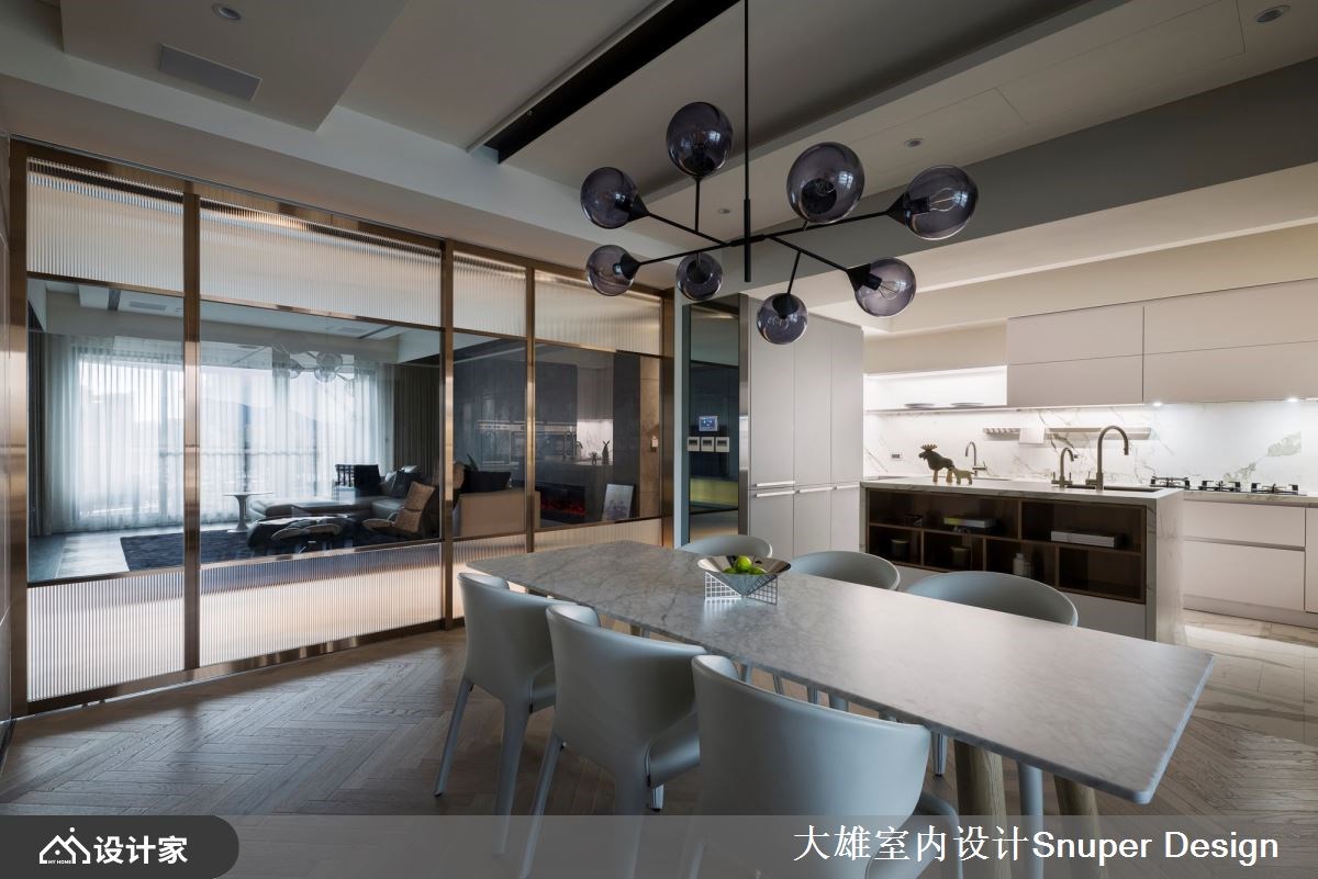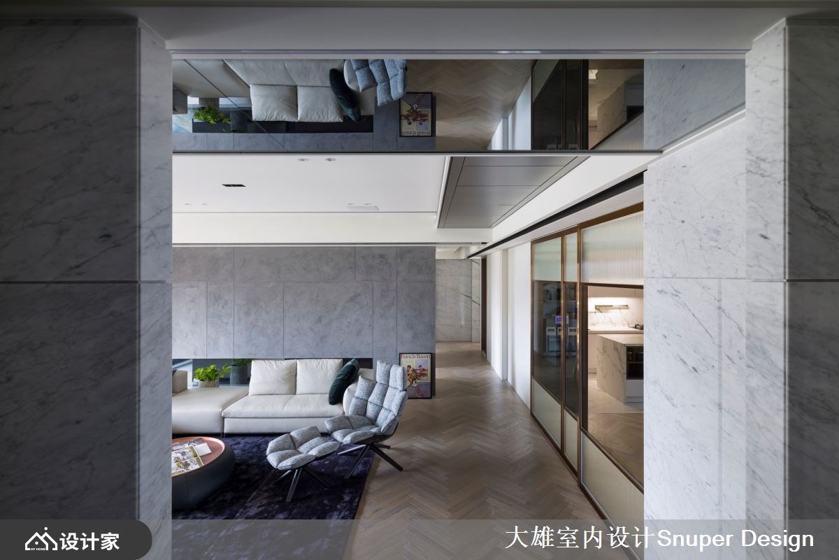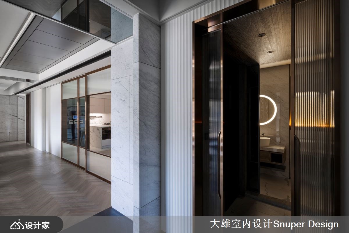 264平米现代风豪宅前有都市景貌,后有山林绿意,室内则是以「结庐在人境,而无车马喧」的豁然胸襟,混搭海岛型木地板、镀钛金属、皮革与石材等异建材,强调家居的开阔感与深度内涵,量身打造一家四口的时尚雅痞大宅。 【镜面修饰大梁,延续空间轴线】 一走进玄关,水磨石地砖勾起浓厚的复古情怀,右侧墙面隐藏玻璃鞋室与客卫空间,彻底善用进入公领域前的过道机能。公共空间铺设人字拼木地板,让每一步都能贴合温暖的触感,而客厅两道大梁则透过镜面修饰,增添空间的高尚质感,下方地板再以深色砖延续轴线,使客餐厅与前后阳台相互串联,形成丰富的视觉层次。 客厅电视墙采用雕刻白石材,堆砌出优雅大气的立面形象,并藉由隐藏门设计,将卧室入口融于墙面,成功拉宽视觉尺度。餐厨空间使用镀钛金属为框的大片玻璃推拉门,创造通透的格局界线;中岛厨房把冰箱隐藏起来,保持空间的整洁利落,而餐厅的展示柜结合红酒柜机能,在墙面延伸电视墙的石材肌理,凸显公领域的整体感。 小编的最爱 主卧床头墙以内敛的粉紫色系妆点,呈现柔和的艺术氛围,而开启更衣間的双开门之后,镀钛金属与玻璃的异建材结合,构筑出时尚化妆台、开放式衣柜,展现精品旗舰店的美好既视感。主浴室拉大空间尺度,双洗手台的贴心设计让人盥洗时更有余裕,找回生活步调的主导权。