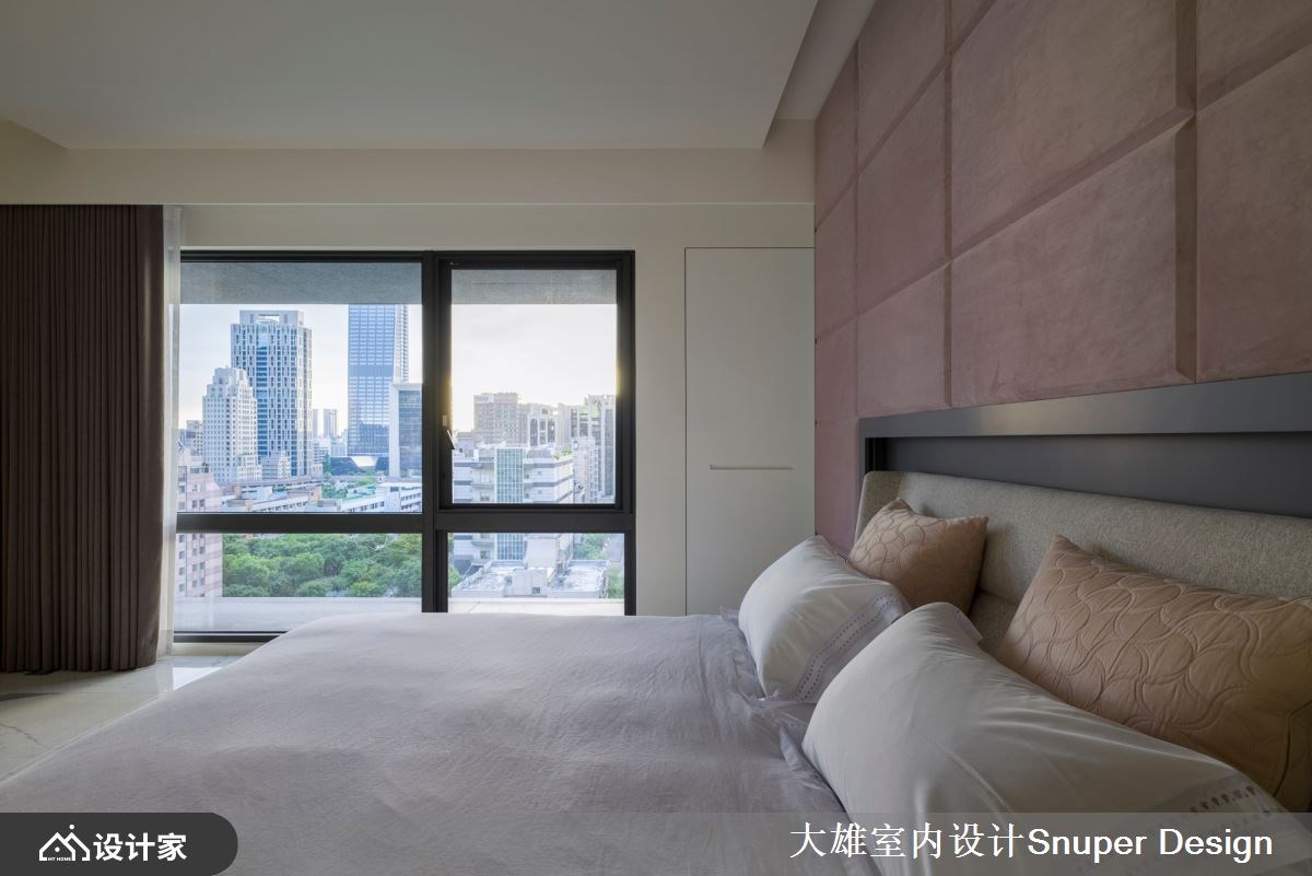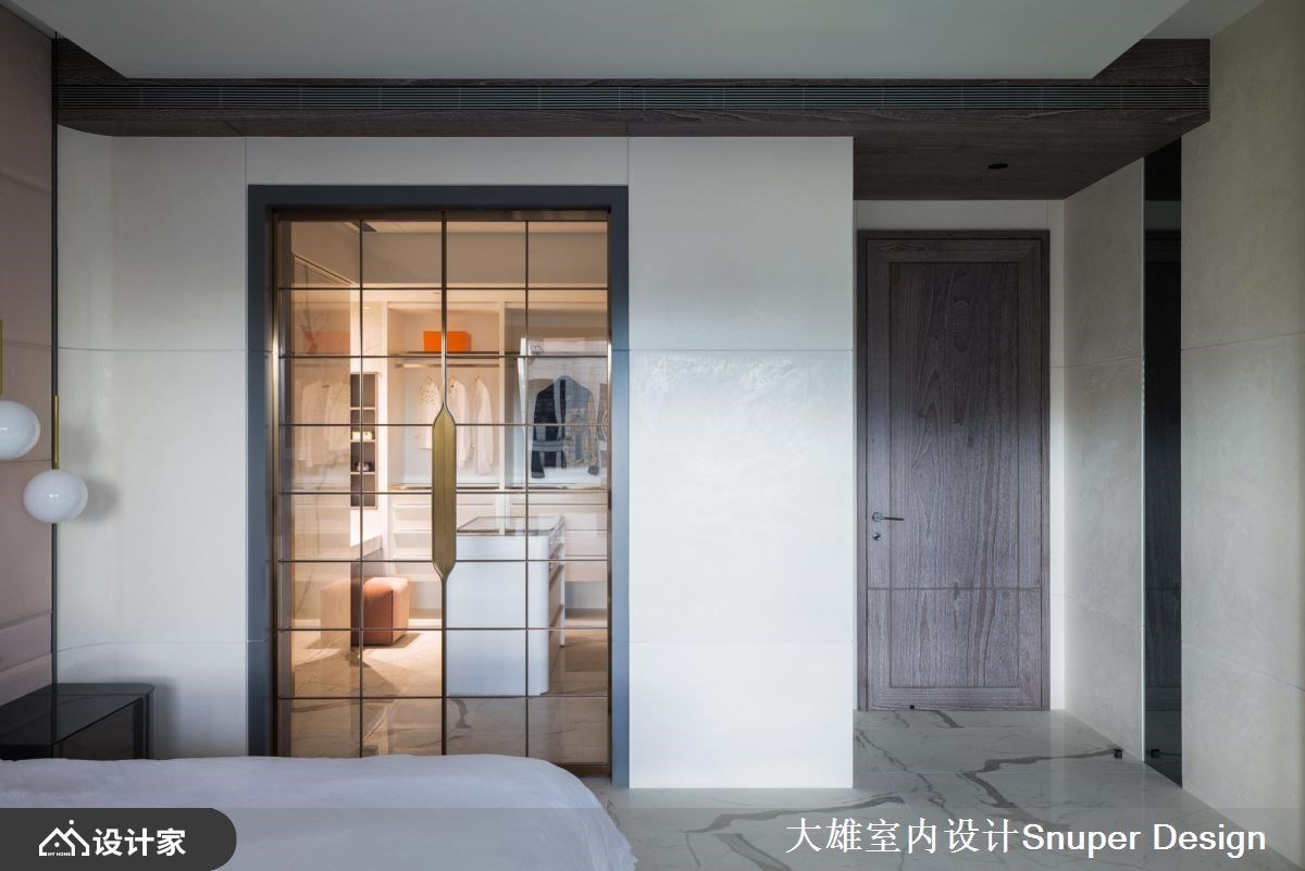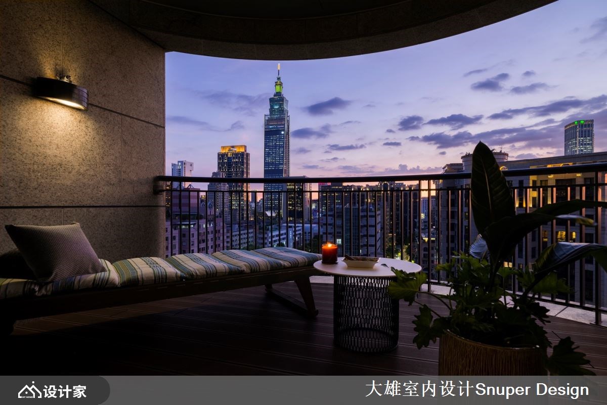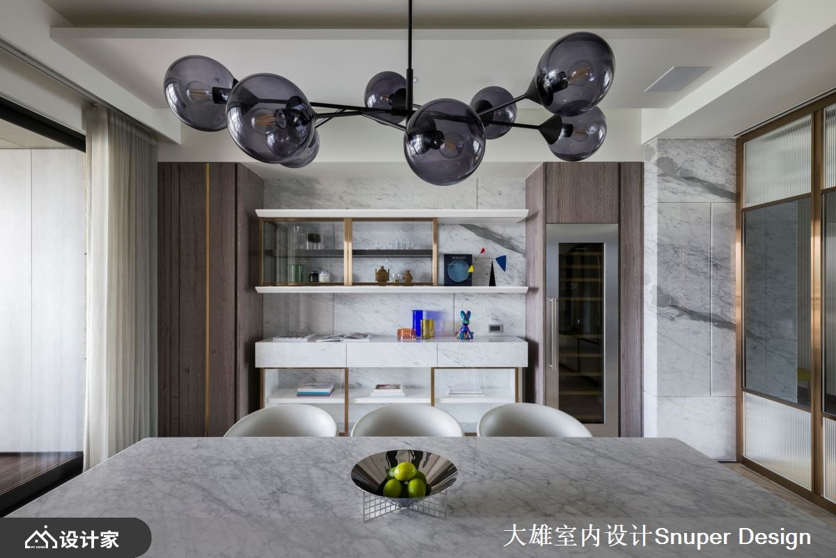 264平米现代风豪宅前有都市景貌,后有山林绿意,室内则是以「结庐在人境,而无车马喧」的豁然胸襟,混搭海岛型木地板、镀钛金属、皮革与石材等异建材,强调家居的开阔感与深度内涵,量身打造一家四口的时尚雅痞大宅。 【镜面修饰大梁,延续空间轴线】 一走进玄关,水磨石地砖勾起浓厚的复古情怀,右侧墙面隐藏玻璃鞋室与客卫空间,彻底善用进入公领域前的过道机能。公共空间铺设人字拼木地板,让每一步都能贴合温暖的触感,而客厅两道大梁则透过镜面修饰,增添空间的高尚质感,下方地板再以深色砖延续轴线,使客餐厅与前后阳台相互串联,形成丰富的视觉层次。 客厅电视墙采用雕刻白石材,堆砌出优雅大气的立面形象,并藉由隐藏门设计,将卧室入口融于墙面,成功拉宽视觉尺度。餐厨空间使用镀钛金属为框的大片玻璃推拉门,创造通透的格局界线;中岛厨房把冰箱隐藏起来,保持空间的整洁利落,而餐厅的展示柜结合红酒柜机能,在墙面延伸电视墙的石材肌理,凸显公领域的整体感。 小编的最爱 主卧床头墙以内敛的粉紫色系妆点,呈现柔和的艺术氛围,而开启更衣間的双开门之后,镀钛金属与玻璃的异建材结合,构筑出时尚化妆台、开放式衣柜,展现精品旗舰店的美好既视感。主浴室拉大空间尺度,双洗手台的贴心设计让人盥洗时更有余裕,找回生活步调的主导权。
