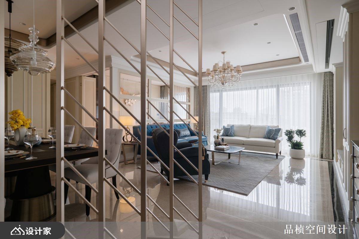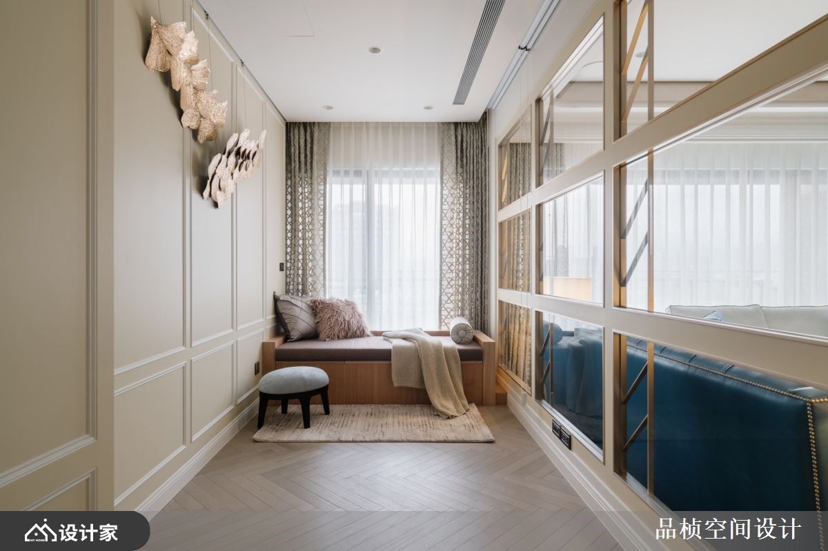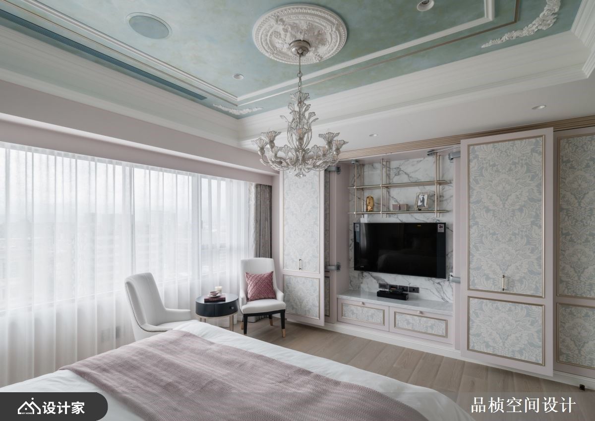 屋主时常海外出差,希望回国后与家人能有个舒适的相聚环境,以及女屋主年轻时想拥有自己家的梦想。设计师以女屋主喜爱的新古典风格作为基调,开放的公领域格局融入客、餐厅,通透的隔断手法与造型,加上流畅的动线,让室内显的开阔、舒心且徜徉在美学日常里。 玄关以线板造型的鞋柜设计延伸入室,衔接收纳柜到电视墙,另一侧利用斜角镀钛屏隔界定餐厅与玄关,镂空的结构让空间更显通透。客厅以米色调的大理石铺陈,天花板则以弧形收边,交织出优雅且温润气息。沙发后方以玻璃格状背墙搭佐拉门设计,打造一间多功能室,玻璃材质营造出视觉通透感;壁面以简约线板描绘,搭佐立体植物造型装置,引入自然艺术之美;窗边则设置飘窗,做为平时休憩之用,也可成为亲友到访时暂住的客房。顺着天花板的大梁结构,定位客、餐厅,厨房与餐厅之间则以木作门拱造型界定,搭佐对称壁灯,呼应新古典风格的对称美学。 小编的最爱 居室以淡紫色打底,天花板让灰绿色的艺术漆饰底,再搭配施华洛世奇水晶的华丽吊灯,流露优雅质韵;床头板则透过金属质感框构主视觉,大小画框的意境诠释,营造出新古典风格的和谐与工艺精湛之美。