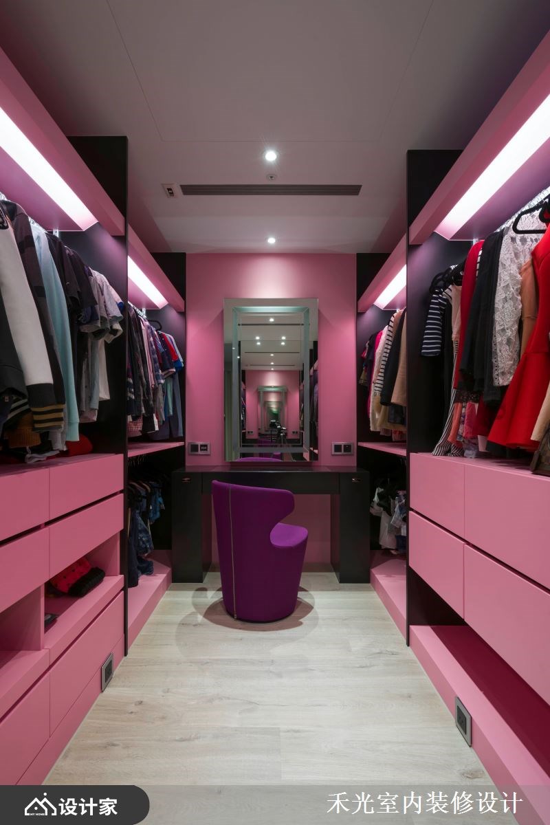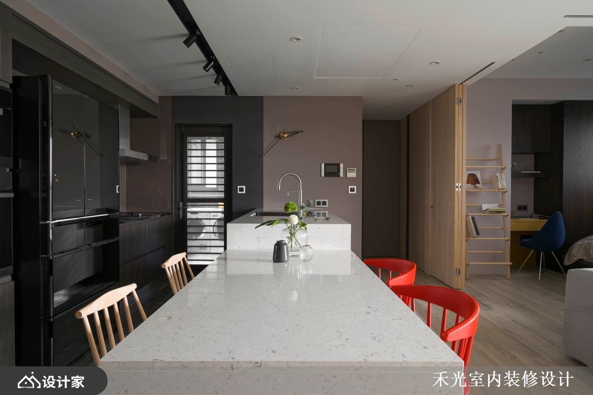 这处为招待亲友而生的79平米混搭宅,有限的空间内,却藏有趣味性十足的室内规划,无论是超梦幻的时尚更衣间,抑或是亲友举杯而欢的开放式中岛,都让人深深羡慕不已,是好客业主不容错过的经典案例。 【客厅沙发背墙,刻划业主印记】 走入室内,采开放式手法使客、餐厅与多功能房合而为一,并援引日光照拂,形塑通透的自然气息,同时运用亮眼软件妆点,呈现流畅利落的线条感,打造出个性化的年轻形象。沙发背后的沃克板立面则刻上业主印记,藉由推拉门的位移,可顺势隐蔽居室,建立起既分隔却又开放的生活情境。 餐厨区域,以餐桌结合中岛吧台,打造公领域的核心区域,不但是三五好友相聚欢笑之处,更满足业主阅读、用餐与料理轻食的需求。主卧区域,以灰玻当作居室、浴厕的隔断,维系光线流动的可能性,为场域间写下亲密的关系。 小编的最爱 时尚梦幻的粉色更衣间,在展示灯光的陪衬下,成为全室的一大亮点,满足收纳机能之余,更让业主沈浸于惬意的穿搭时光。