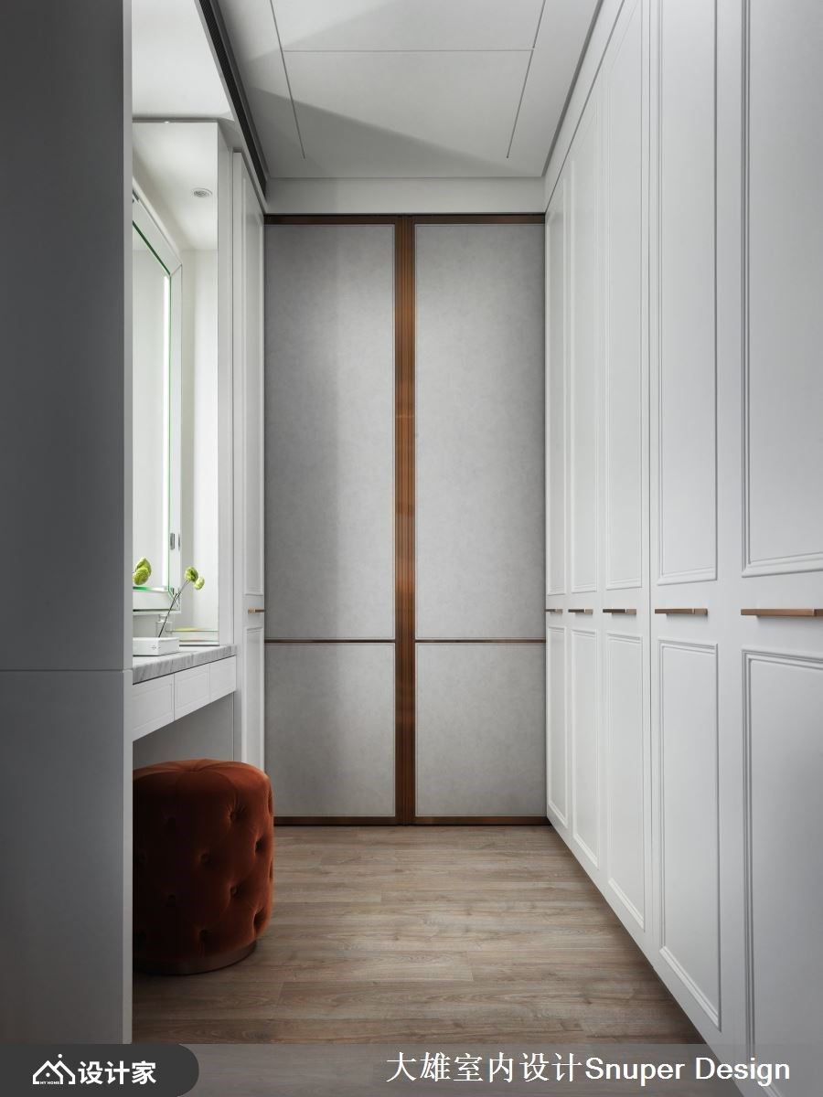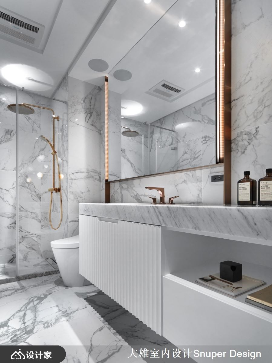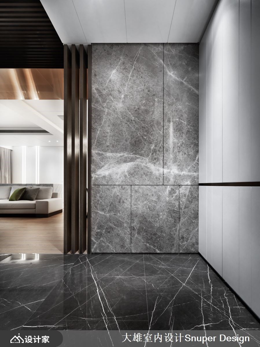 165平米现代风的室内,透过石材与木纹展演出最极致的空间神情,且划分出内外领域;简约配色的基底下,再搭佐灯带艺术与美学画作,形塑人文大宅风范。 玄关地坪以大理石铺陈,浅白色线条画破深色肌理,撼动美的既定印象;石材切割面结合镀钛的屏隔意象划分内外领域,侧边串连白色简约的鞋柜,转折面向公领域处,特别换上深木纹门板,中央安排展示空间并以间接照明,让光线洒落在雕塑品上,创造视觉美学端景。 深色石材持续延伸入室并穿越电视墙,天花板辅以格栅元素串连,而前方大梁透过镀钛修饰,与石材电视墙与地坪相互辉映,增添奢华质感;大梁后方的公领域皆铺设木纹地坪,形塑温润、安定的居家氛围;灰色布质沙发上安排几个跳色抱枕,增添视觉活泼度,后方倚靠着石材围塑出开放书房区,简约的灰阶墙面流露细致沟缝,左侧两道直线形灯带直竖而下,与一旁餐厅处的艺术画作墙、餐桌上圆弧形的吊灯相互呼应,调和一片柔美光晕。 小编的最爱 书房壁面以干净简约为基底,透过沟缝的造型安排,延伸出右侧通往卧室的隐藏门;主卧更衣室以白色为基底,简约线板描绘的衣柜展现古典秩序,再利用镀钛设计把手与门扇边框,注入时尚奢华美感。
