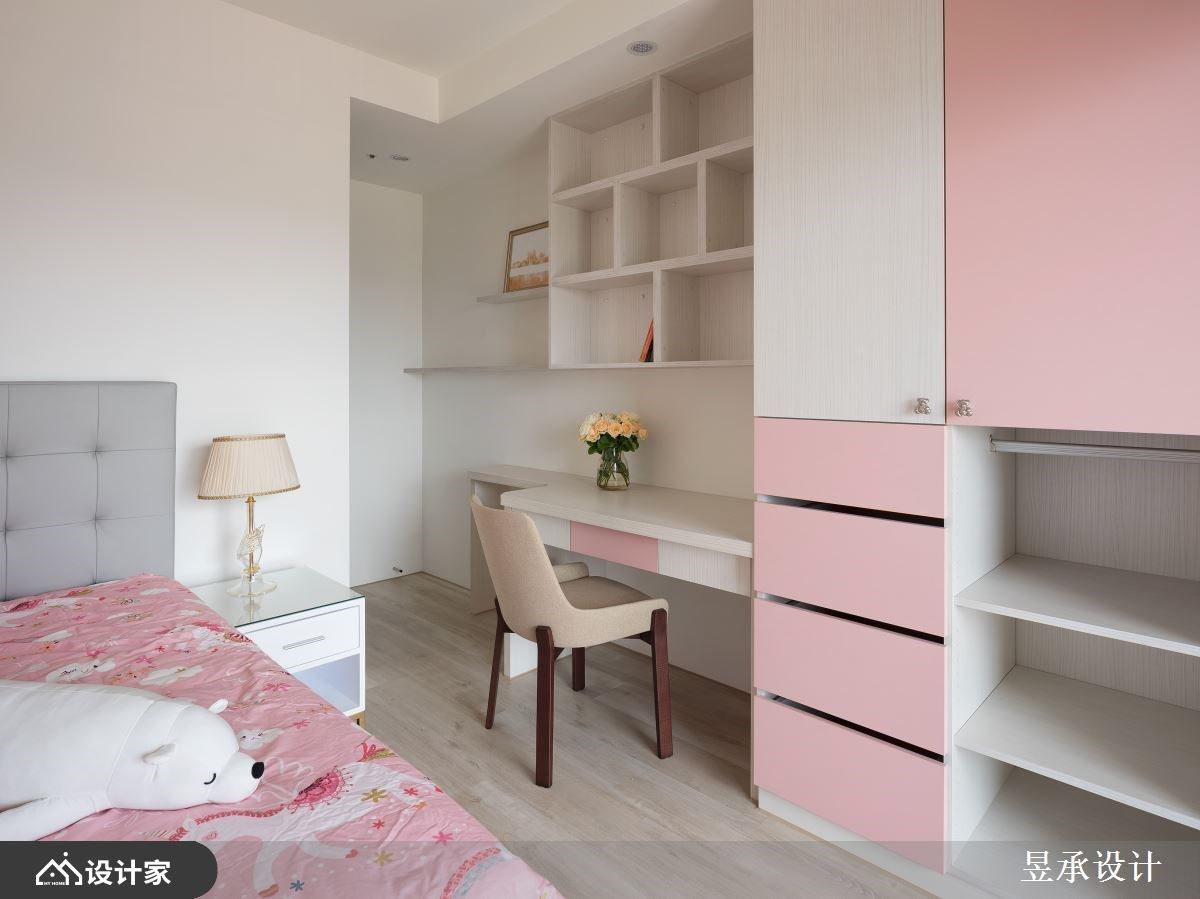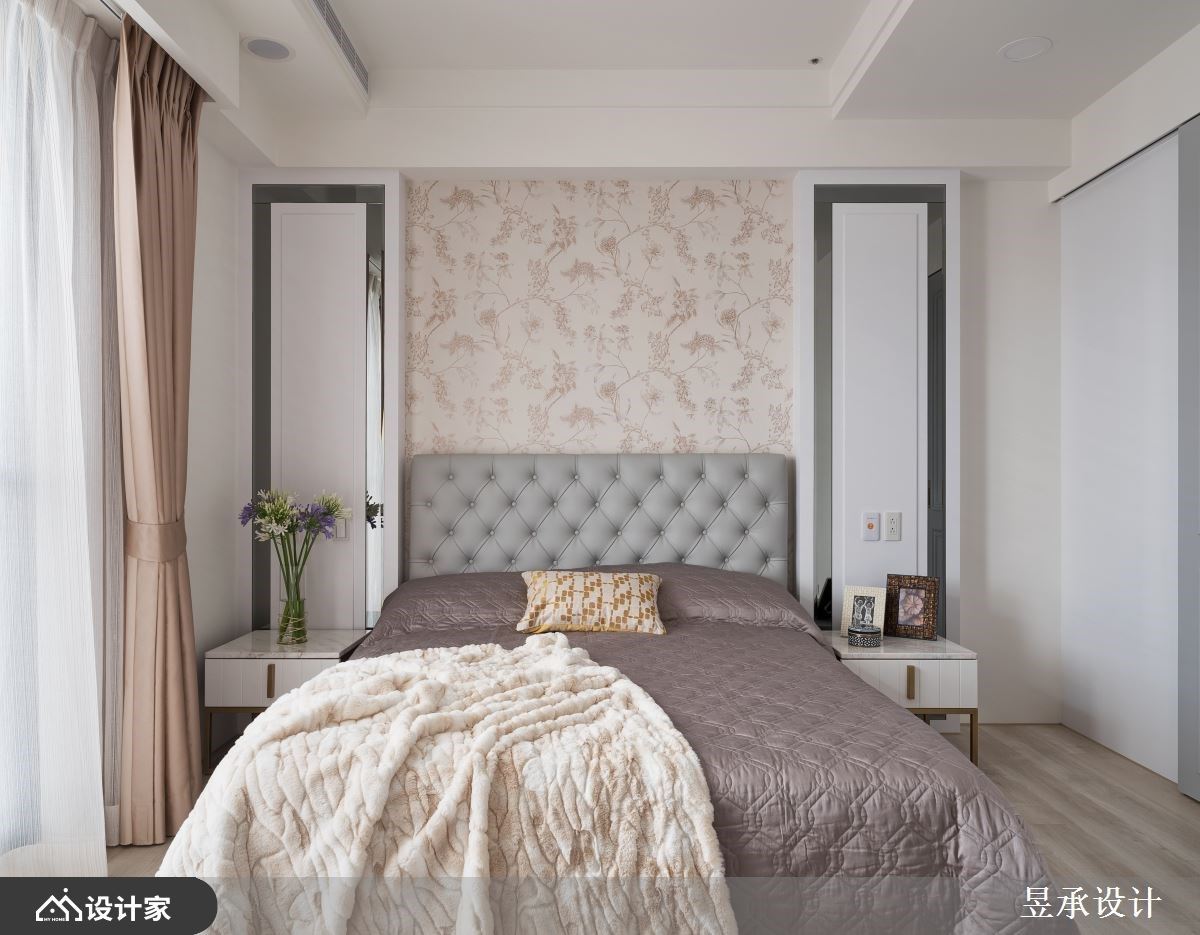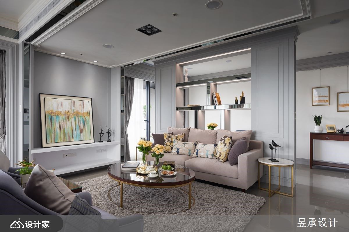 玻璃落地窗的通透无碍,引入敞朗日光走进室内,照亮满室明亮及其动人的美学细节。设计师透过优雅美式风格,描绘出一家四口梦想中的家屋,让我们走进来瞧瞧! 入室后的玄关右侧,以线板描绘的柜体规划出鞋柜及公浴收纳柜,不仅巧妙隐藏公浴出入口,还创造收纳机能,同时也藉由灯柱的设计点缀,创造出完整的玄关领域,营造出浪漫的空间气息。客厅里为了营造出宽敞、充沛采光的优势,沙发后方搭配镂空的书柜设计,界定出男屋主期待的独立书房,开放的柜体让光线走进书房领域,同时成为领域的隔间技法;电视墙的两侧则以灰镜妆点且延伸至天花板,反射的特性让空间更显延伸、放大,与室内的古典元素相互辉映,形塑时尚且奢华的气息。客厅另一侧以木作矮柜界定,延着L型落地窗,打造出开放餐厅,结合庭园木作的规划,让室内与户外景致融合,一边用餐的同时也能欣赏露台的风景,好不惬意! 小编的最爱 延续公领域的细腻质感,主卧床头以粉色印花图腾衬底,两侧以对称的灰镜安排,放大空间视感;床尾藉由木框玻璃拉门搭配古典壁板、壁灯设计,创造出时尚品味的更衣室。