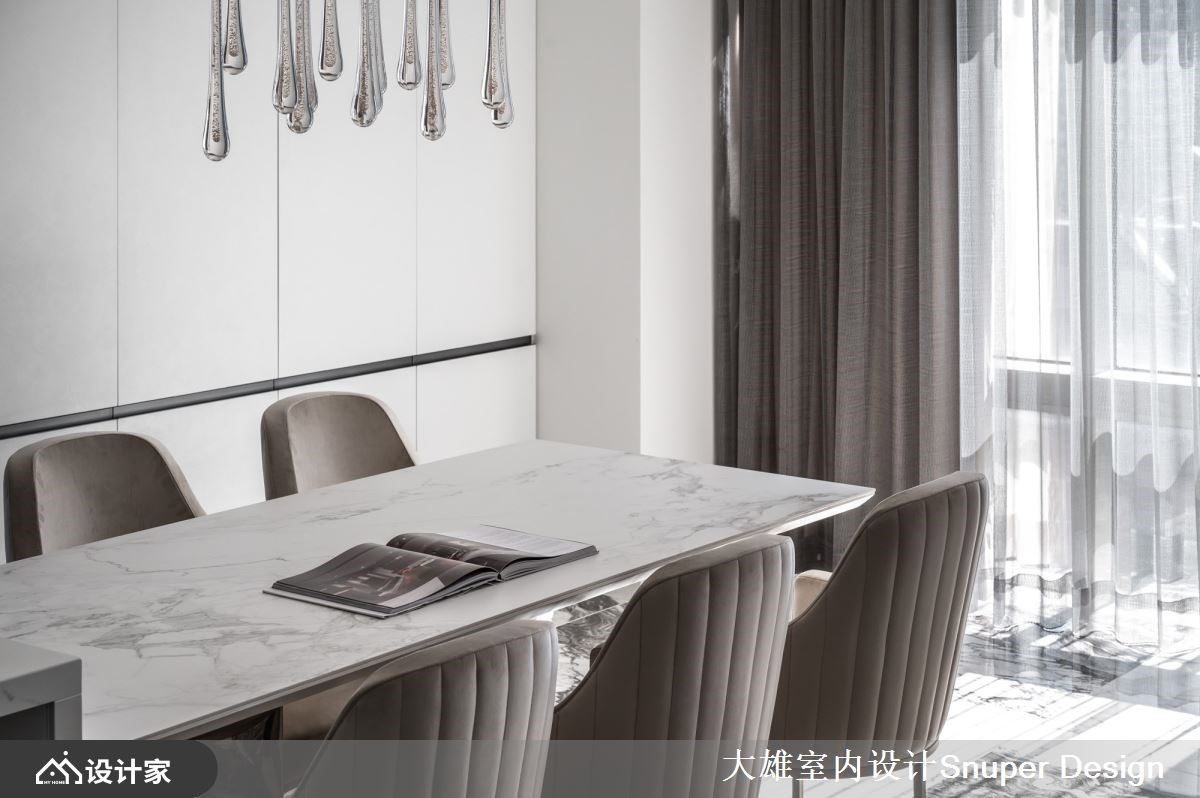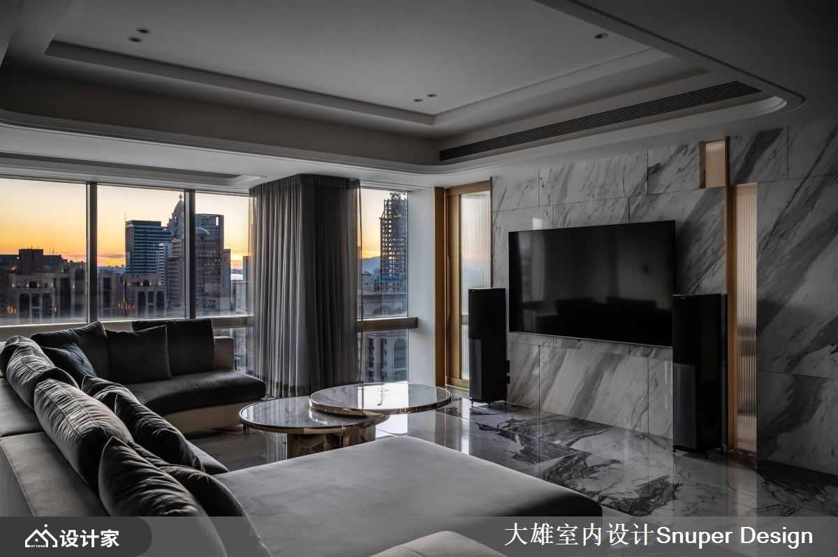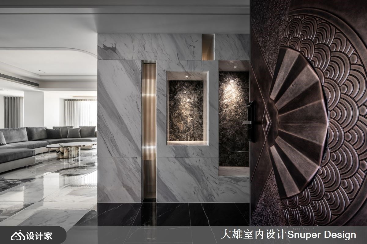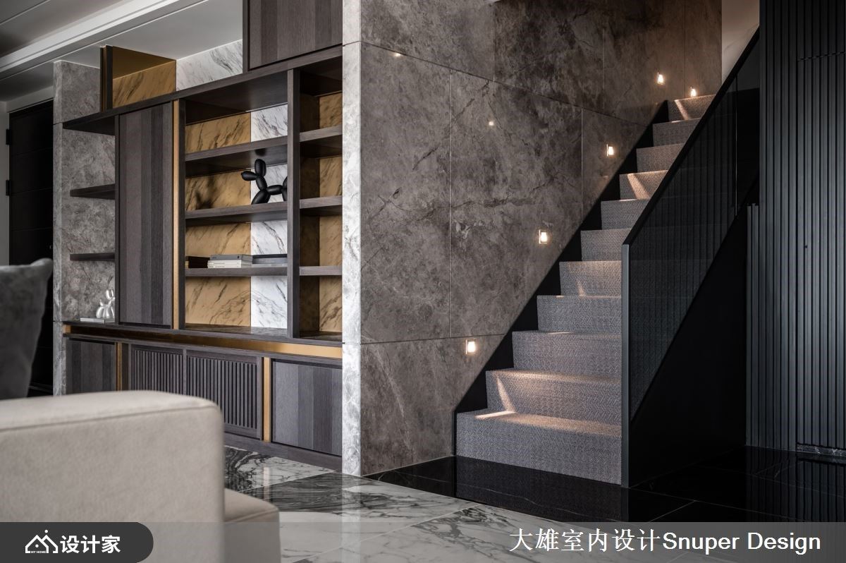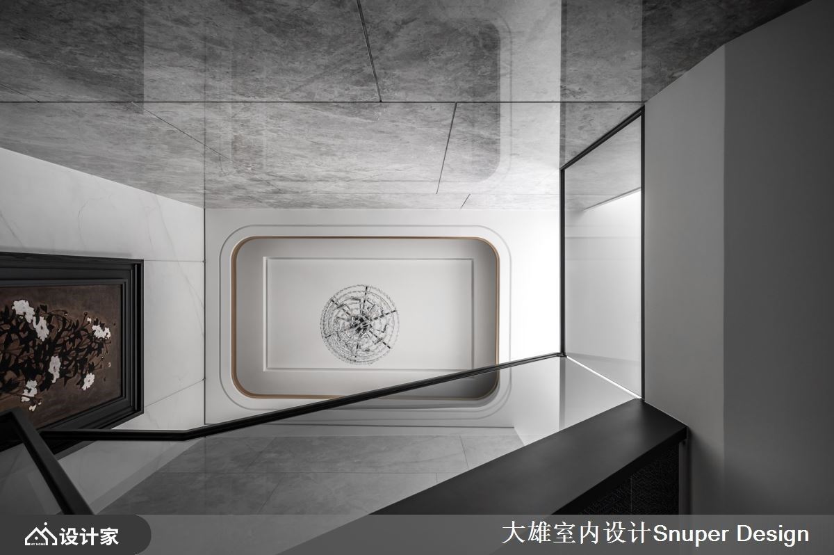 此案为188平米的中古屋翻新设计,大面采光且将城市美景引入室内,运用大量的大理石铺陈出空间质感,伴随间接照明、茶镜、水晶吊灯与铁件的安排下,形塑透、亮且具人文艺术气息的豪邸风范。 玄关以深色石材铺设地坪,石材壁面的局部以内凹设计,搭配深色石材衬底,结合间接光线的聚焦手法,营造出具意境的端景造型,成为入室后撼动视觉的第一眼。公领域的天花板以简约线板收边,拉出渐层、挑高视觉,且以弧形线条诠释柔和气息;电视墙以石材打造,局部以玻璃、镀钛材质描绘出镂空立面,增添视觉穿透感;沙发安排弧形线条,中央搭配双圆形茶几,透过圆形线条的安排,让座位更集中,隐喻凝聚家人情感之意。 沙发后方为开放餐厨空间,白色中岛吧台串连餐桌,可容纳更多人共乘、用餐,成为度假时绝佳派对场域。串连一、二楼的楼梯立面以大理石贯穿,阶梯处安排间接照明,到了夜晚成了绝佳视觉导引;二楼作为主卧空间,带着裸色光泽的绷布做为床头造型,两侧搭配对称的水晶吊灯,流露出私领域独有的柔美、静谧时光。 小编的最爱 整体空间以大理石为主要创作素材,设计师透过公领域的深色木纹搭佐金属线条的展示柜、中岛吧台侧面的茶镜安排,以及间接照明的巧思,替现代感的空间挹注一股温润气息,调和出家的宜人温度。
