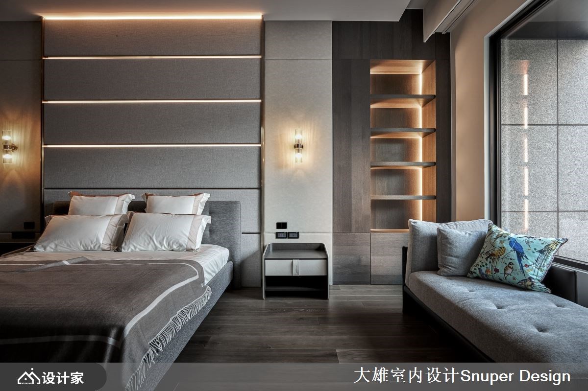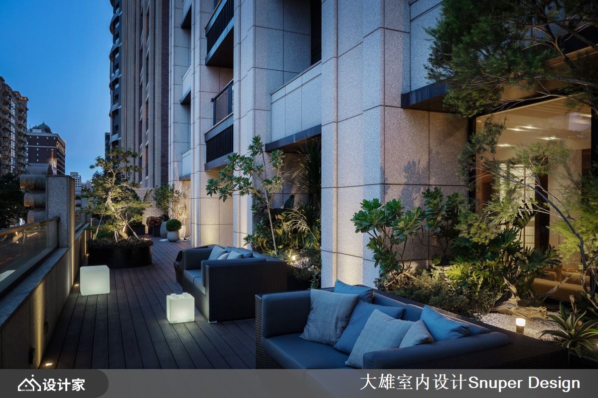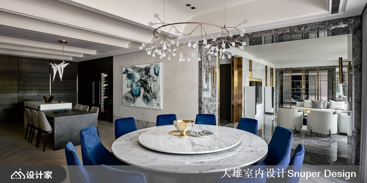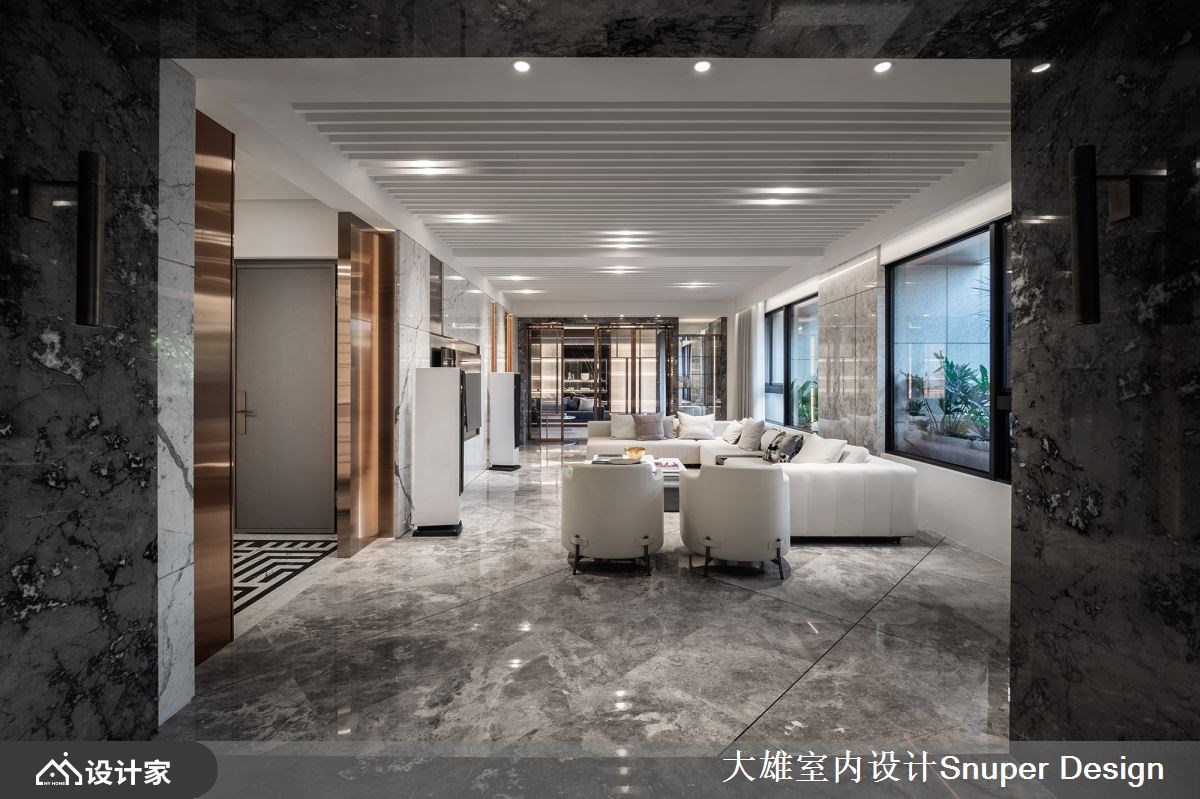 三代同堂如何在同个屋檐下,取得最好的生活平衡呢?设计师从这间660平米的双拼豪宅还是毛胚房的时候,就开始规划室内格局,考虑到空间存在着大梁低矮的问题,因而运用天花板的修饰手法去化解,同时沿着空间而生的绿意露台,更是打破三代成员的隔阂,让彼此能在大型植栽的陪衬下,交流内心真切的想法。 【石材拱门,连接餐厅和起居室】 玄关以黑白几何拼贴的技巧,表现石材地板的时尚高雅,而缓步走进客厅,大理石地板特别转了45度角,并在接缝处镶嵌镀钛金属线条,尽显设计师对石材工艺的高超掌握度。客厅天花板透过格栅语汇,延伸空间的恢宏气势,并衔接两侧的石材拱门,连接起餐厅及起居室,使同一轴线的空间拥有多层次的端景风貌。 餐厅结合现代与古典的风格精髓,在地面铺排鱼骨拼木地板,天花板则藉由拱型设计降低梁柱的压迫感,让空间拓展出欧美感的开阔视觉。而除了接壤客厅的大圆桌以外,餐厅还设置了一个长型中岛,可以大方招待亲友用餐;主墙面则透过特殊的进口涂料,凸显空间的不同温度,与一旁的隐藏式冰箱、红酒柜,构筑了完整立面。 小编的最爱 主卧在床旁露台种植樱花树,当温暖的春季降临,美丽的花海将在早晨唤醒夫妻俩,而且设计师还为男女主人定制各自的更衣室,就像精品店般展示他们的衣物收藏。孝亲房以温暖舒适的色系为设计重点,皮革、金属、石材相互混搭,加上床头墙柔和的灯带配置,以及方便欣赏窗景的休憩飘窗,让长辈能获得最贴心的呵护。