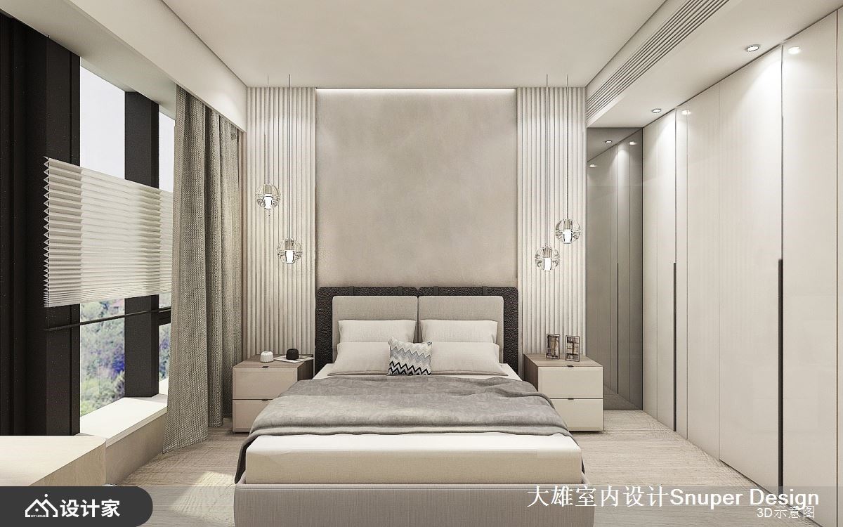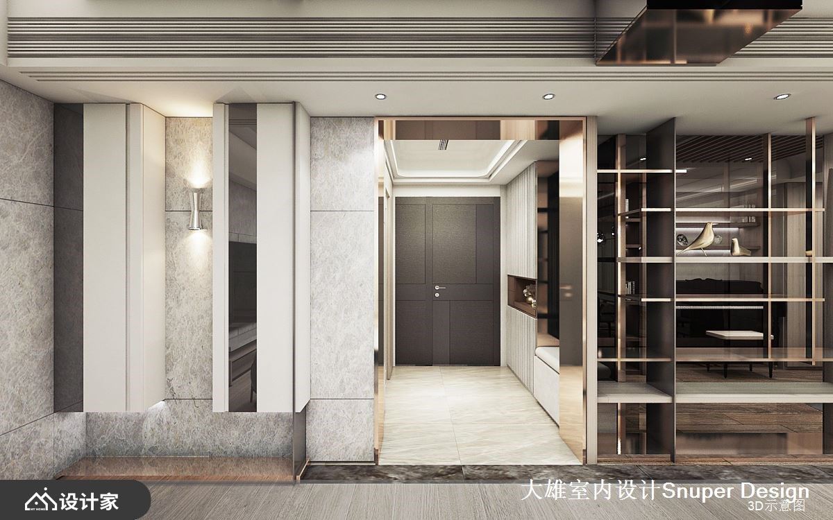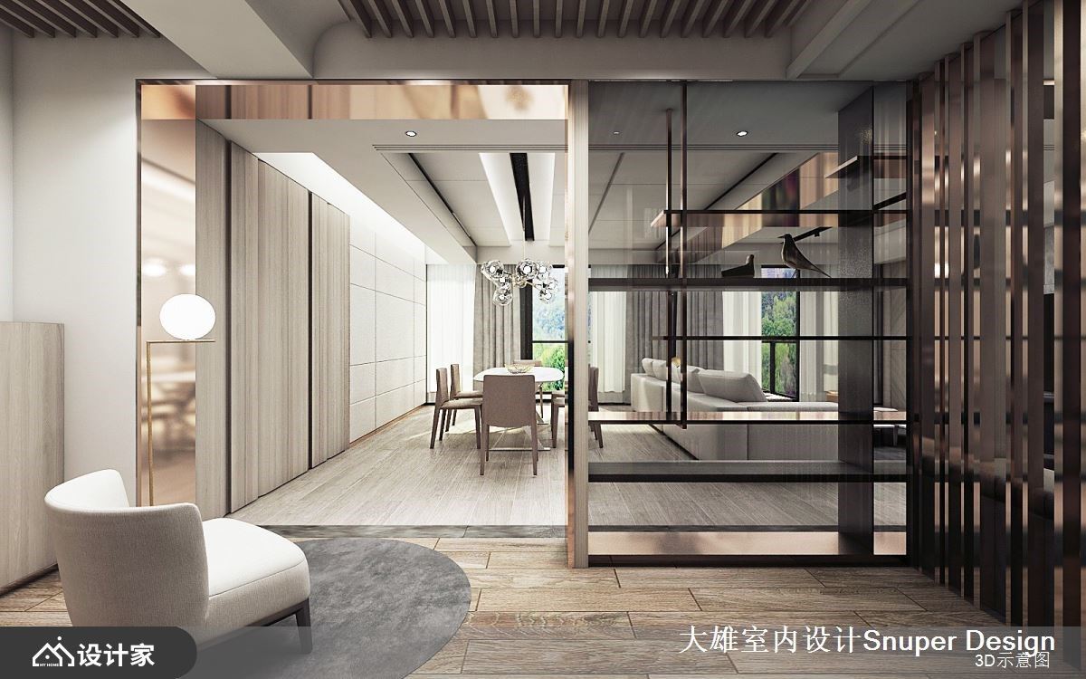 165平米现代风空间里,伴随大面窗引入绿意景致,让建筑体内外产生对话,敞朗日光映照在异材质刻划的精致细节,特调出自然与时尚的独特品味。 玄关通往公领域,利用一道细致的镀钛拱门造型界定,且串连一旁的开放展示收纳,并衔接通往琴室的入口,透过金属材质以细致线条勾勒出机能,让简约的空间增添些许时尚新意。公领域以大量木纹铺叙地坪,增添温润暖调,局部活用金属、玻璃等材质,画龙点睛,增添奢华质感;电视墙以石材拼接而成,彰显非凡气度,天花板大梁贴附镀钛,与空间里的精工细节相互辉映,且划分出后方的餐厅区。 轻薄弧形石材餐桌搭配奶茶色餐椅,悬挂一盏通透光采的设计灯饰,挹注简约质感的人文情怀。屋主平时练琴的休闲空间,选择以艺术展示层架与镀钛门拱自然界定,领域整个被打开来,转化为公领域的一部分,展现出开放、通透的舒适度。书房里延续大面窗景引援自然风光,L型开放展示书柜兼具美学展示机能,让人悠游在舒心快意的空间里尽情阅读。 小编的最爱 居室里以大地色调为基底,床头搭佐对称立面,且安排渐层的吊灯,诠释静谧、安定的氛围;小孩房以木作打造两处床铺,并结合开放书柜,将奈良美智、动物图腾为灵感妆点其中,替孩子打造充满童趣的日常生活。
