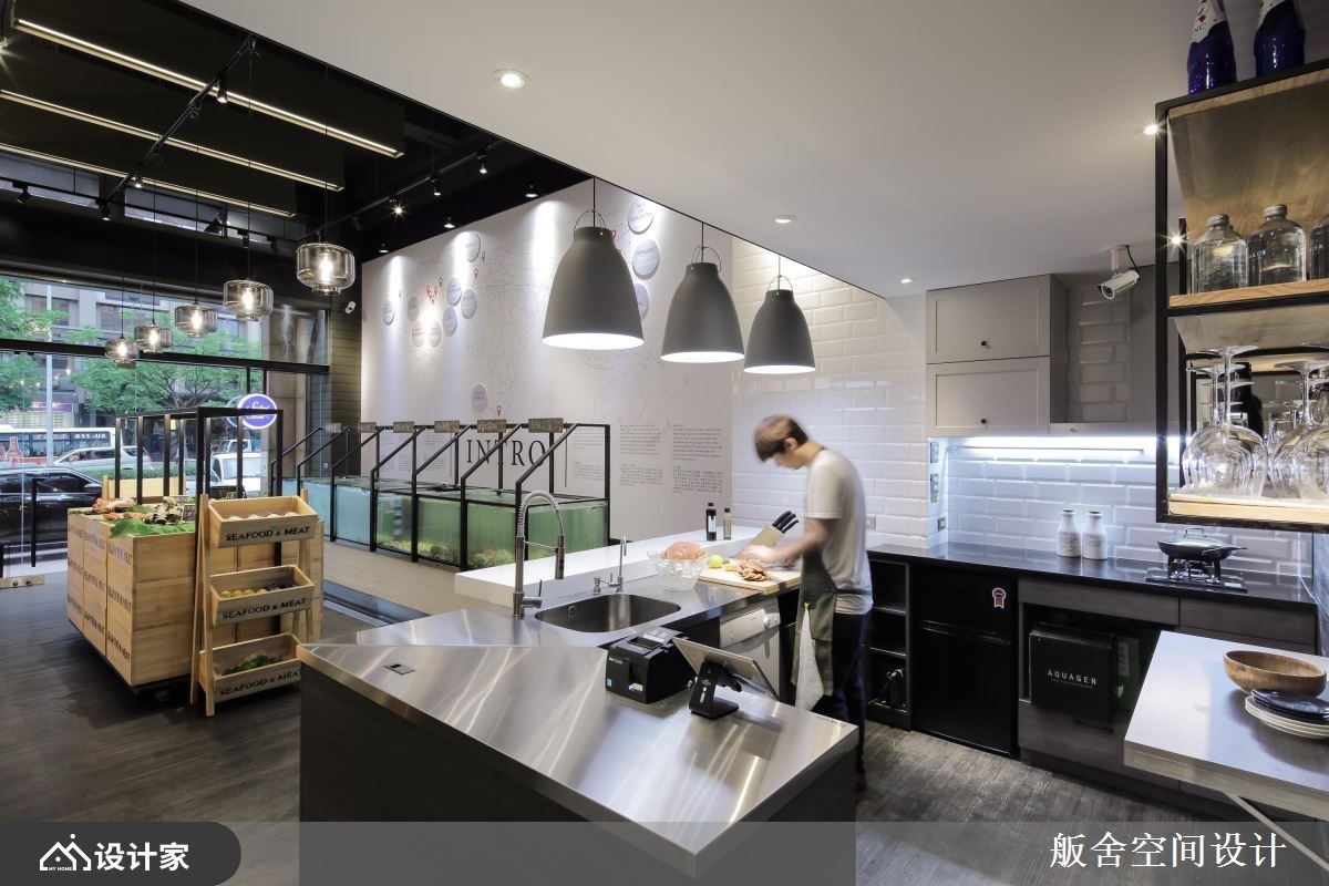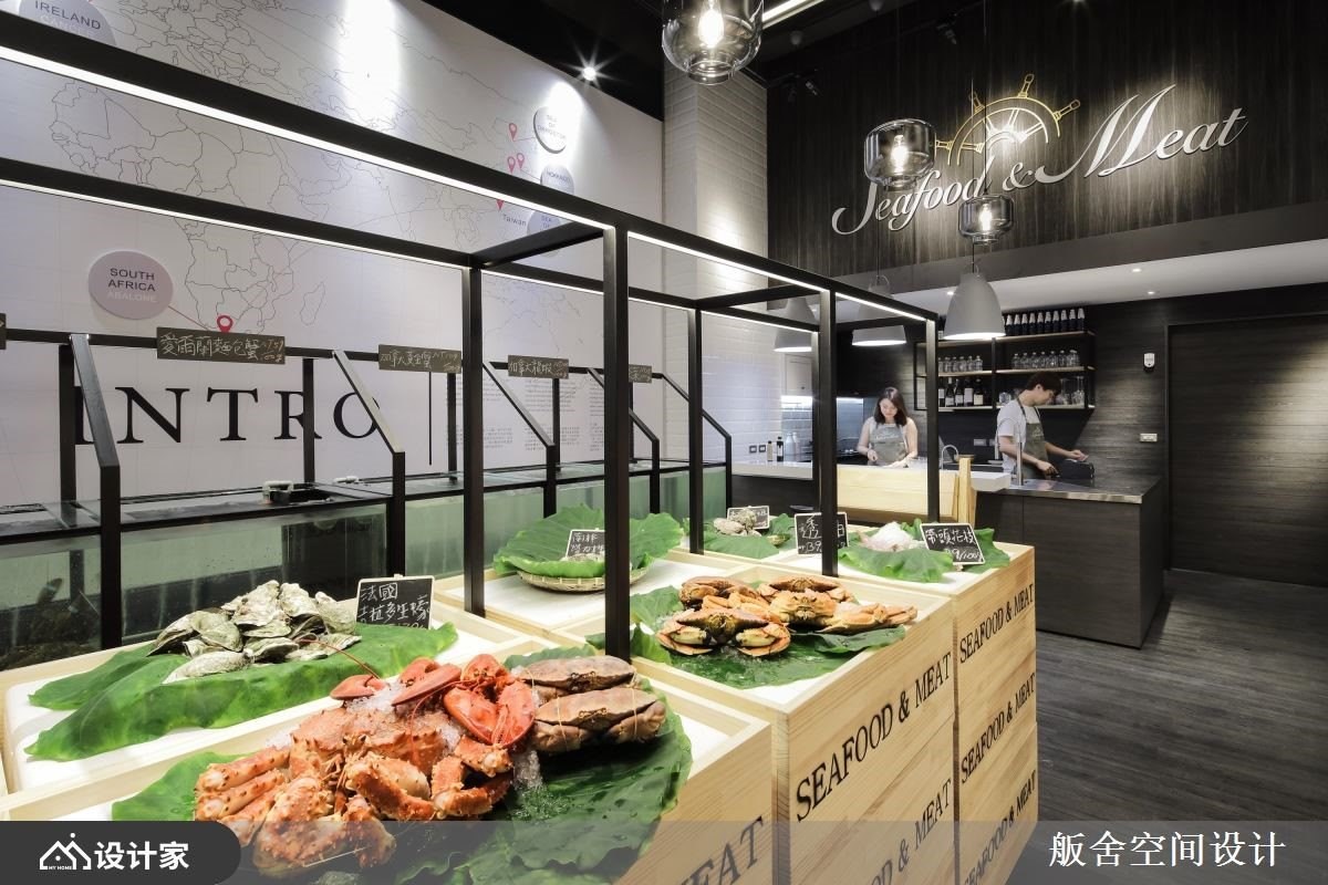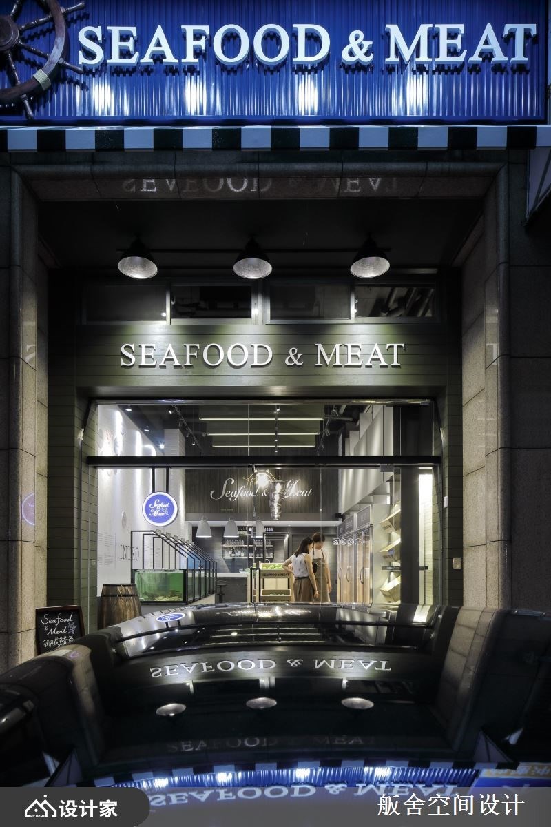 改造指南 1. 展售区怎么表现出气势? 2. 料理区如何让顾客安心? 3. 用餐区这样呈现工业风! 设计师这样做 水蓝色的招牌搭配船舵,并写上海鲜与肉的英文字,让人期待开门后的长形空间,会有什么样的惊喜!设计师依循流畅的室内动线,划分长形屋的机能区域,店内透过拉近渔港到餐桌的距离,让前来寻找美味的顾客,都能大饱口福、满载而归。 设计师善用6米的挑高空间,结合倒L形的金属柱列及木垂板灯,衬托出空间的恢弘气势。左侧的海水养殖缸藉由梯形铁艺妆点,让人聚焦于缸内活力十足的海鲜,同时隐藏完善的排水系统,给予顾客美好的来店体验。右侧的一整排冰箱与调味品层架,则营造出超市的时尚感。 鱼缸旁的主墙,利用世界地图的大图输出,标示出海鲜的产地来源,在灯光的映照下,使顾客走进来就能一目了然。此外,料理吧台区以不锈钢台面,搭配墙面的进口地铁砖,透过好清洁的建材,让处理生鲜的区域,保持干净利落,获得顾客的安心与信任。 小编的最爱 用餐区在格状天花板,安排玻璃罩吊灯,表现工业风质感,而卡座沙发及吧台椅的混搭配置,让人沉浸于美式餐酒馆的微醺。