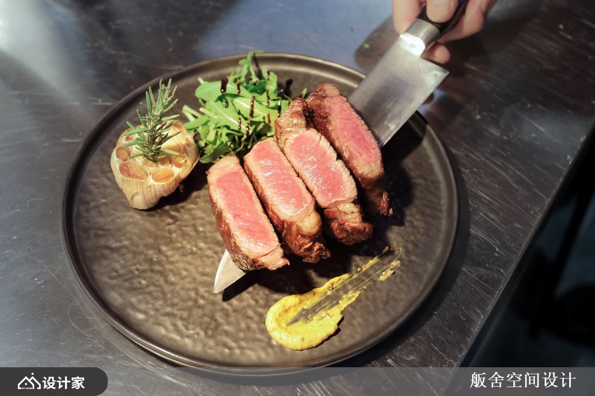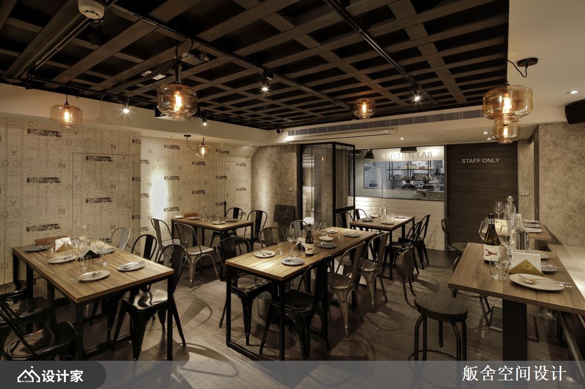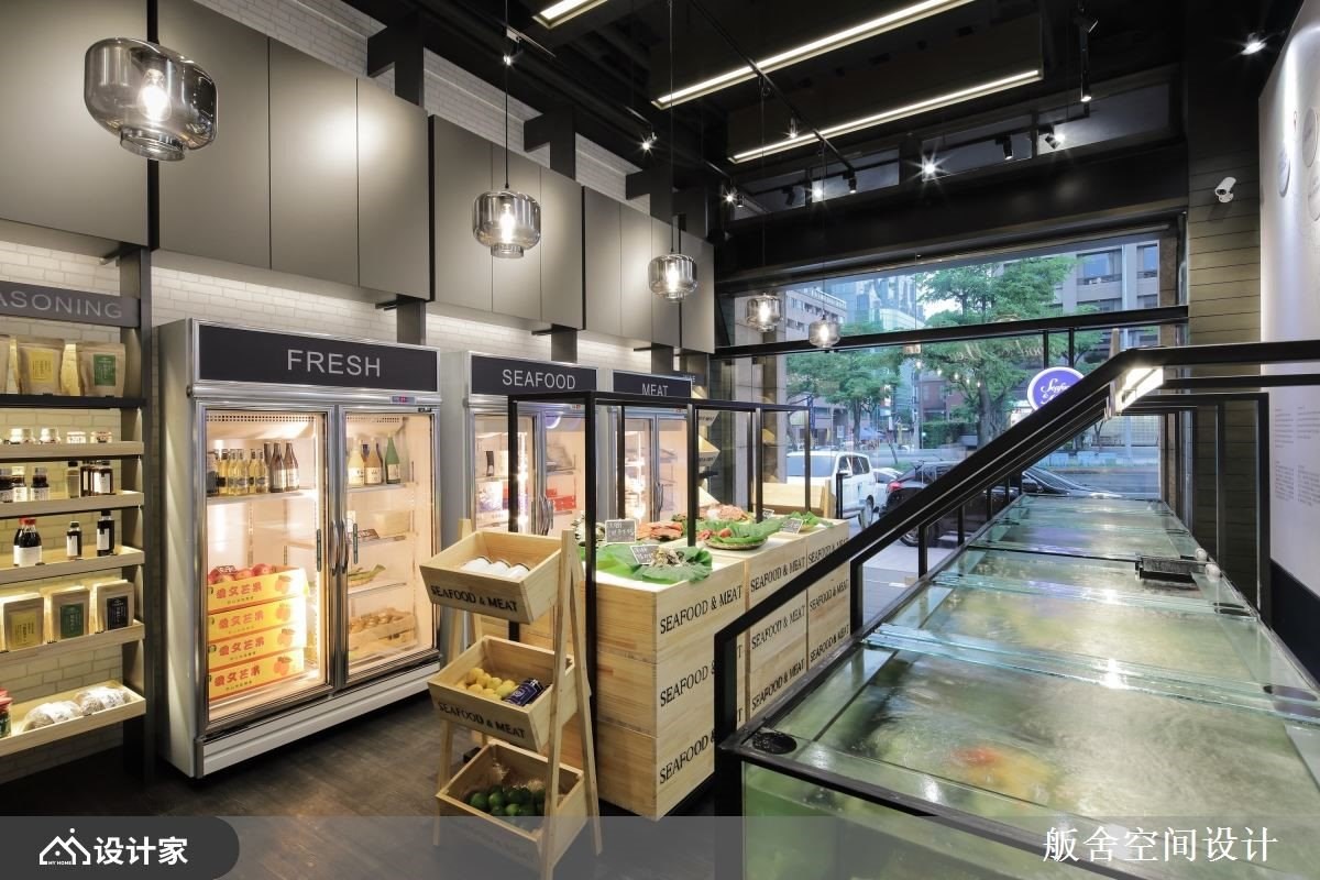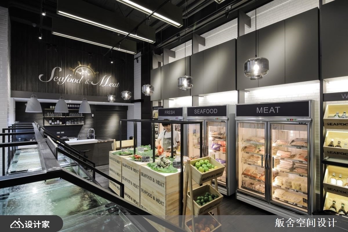 改造指南 1. 展售区怎么表现出气势? 2. 料理区如何让顾客安心? 3. 用餐区这样呈现工业风! 设计师这样做 水蓝色的招牌搭配船舵,并写上海鲜与肉的英文字,让人期待开门后的长形空间,会有什么样的惊喜!设计师依循流畅的室内动线,划分长形屋的机能区域,店内透过拉近渔港到餐桌的距离,让前来寻找美味的顾客,都能大饱口福、满载而归。 设计师善用6米的挑高空间,结合倒L形的金属柱列及木垂板灯,衬托出空间的恢弘气势。左侧的海水养殖缸藉由梯形铁艺妆点,让人聚焦于缸内活力十足的海鲜,同时隐藏完善的排水系统,给予顾客美好的来店体验。右侧的一整排冰箱与调味品层架,则营造出超市的时尚感。 鱼缸旁的主墙,利用世界地图的大图输出,标示出海鲜的产地来源,在灯光的映照下,使顾客走进来就能一目了然。此外,料理吧台区以不锈钢台面,搭配墙面的进口地铁砖,透过好清洁的建材,让处理生鲜的区域,保持干净利落,获得顾客的安心与信任。 小编的最爱 用餐区在格状天花板,安排玻璃罩吊灯,表现工业风质感,而卡座沙发及吧台椅的混搭配置,让人沉浸于美式餐酒馆的微醺。