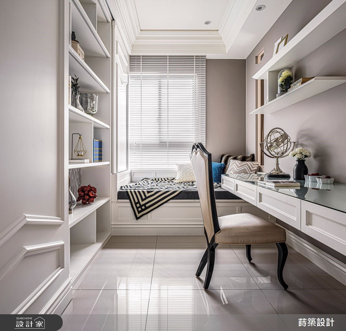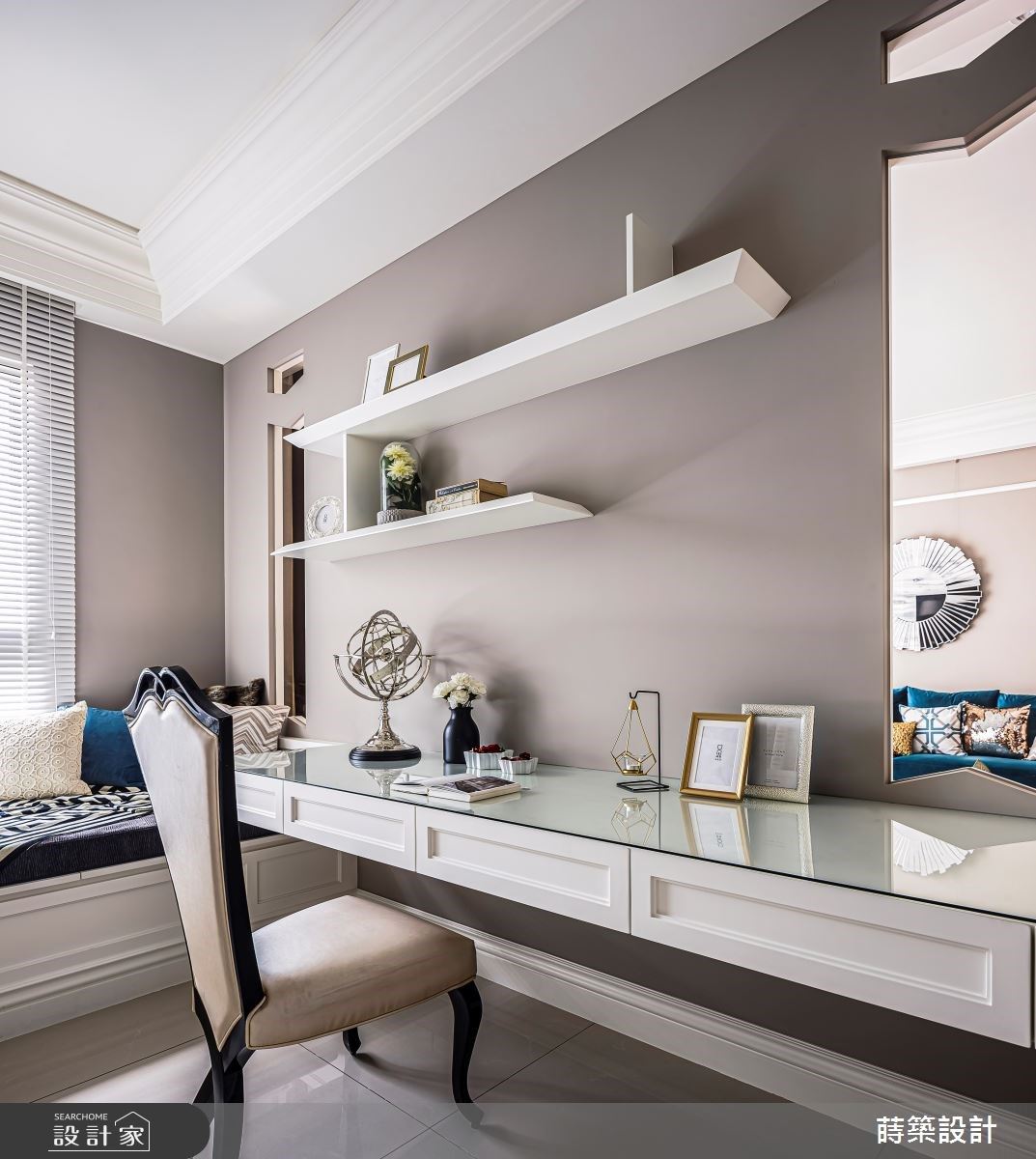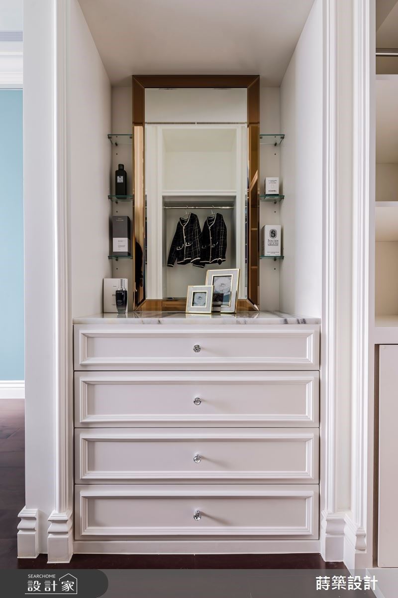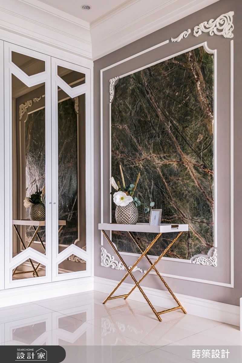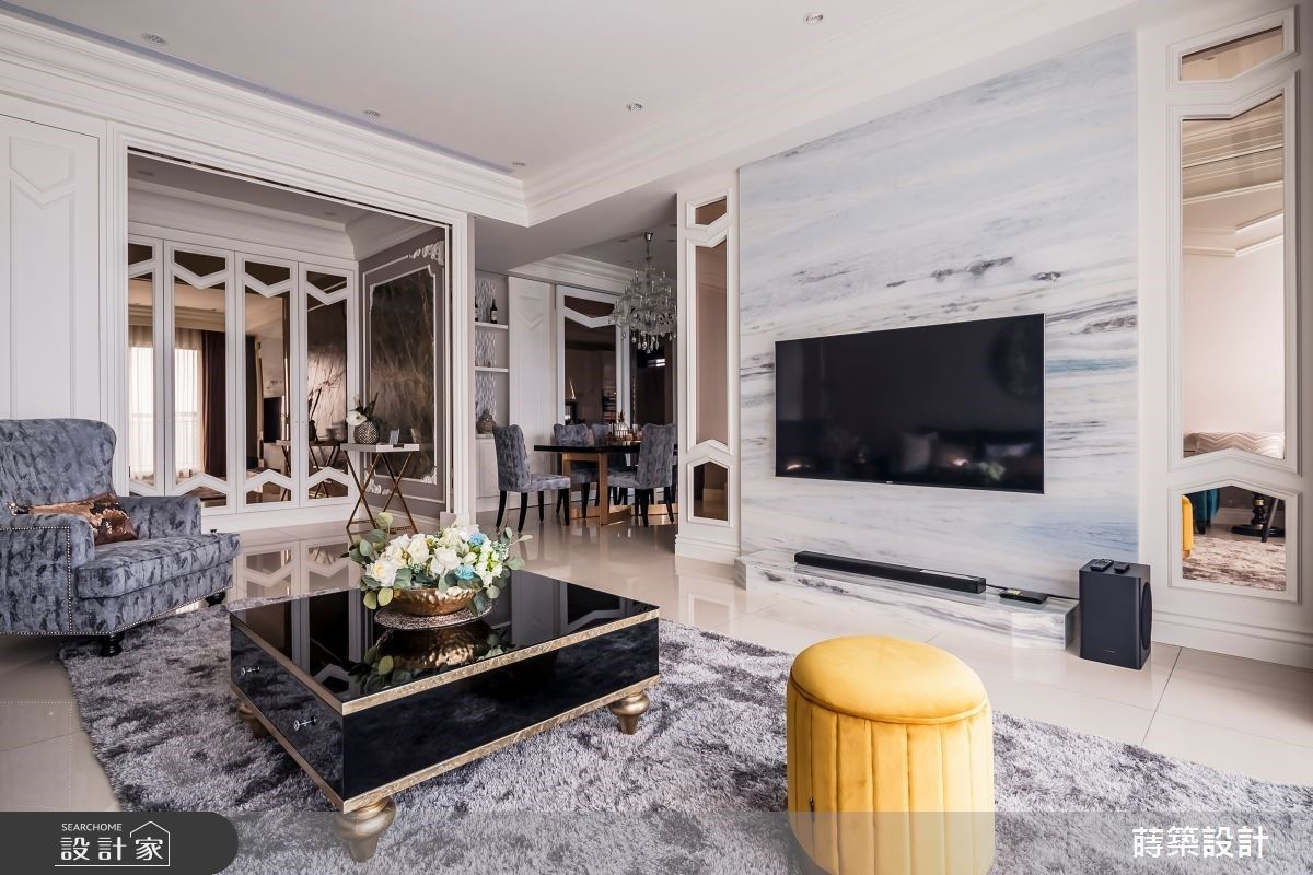 35坪新古典风宅,莳筑 朱皇莳设计师以柔美语汇营造细腻氛围,多层次的设计元素在空间内相互呼应,更运用玄关端景与电视墙的自然纹理,围塑大自然的艺术气息,一股低调奢华的气息悄无声息地溜进夫妻俩的退休生活。 入门玄关以大面夏木漱石搭佐精致线框,华丽端景瞬间成为空间的第一印象,侧边柜体结合茶镜延伸视觉效果,外出时不仅可从容地整理仪容,内部的收纳空间更满足了屋主需求。 公领域以温柔杏色与白为基底色调,将湖水蓝的亮面绒布沙发摆放于客厅,提升空间贵气与质感,最后以圆椅与鲜艳抱枕衬托场域。 以半开放式设计串连客厅、餐厅以及书房三场域,独立出各自的休憩活动而不相互干扰,壁面则运用镂空与茶玻设计,升华一家人的情感互动,并保留鲜明的分野与通透的空间感。