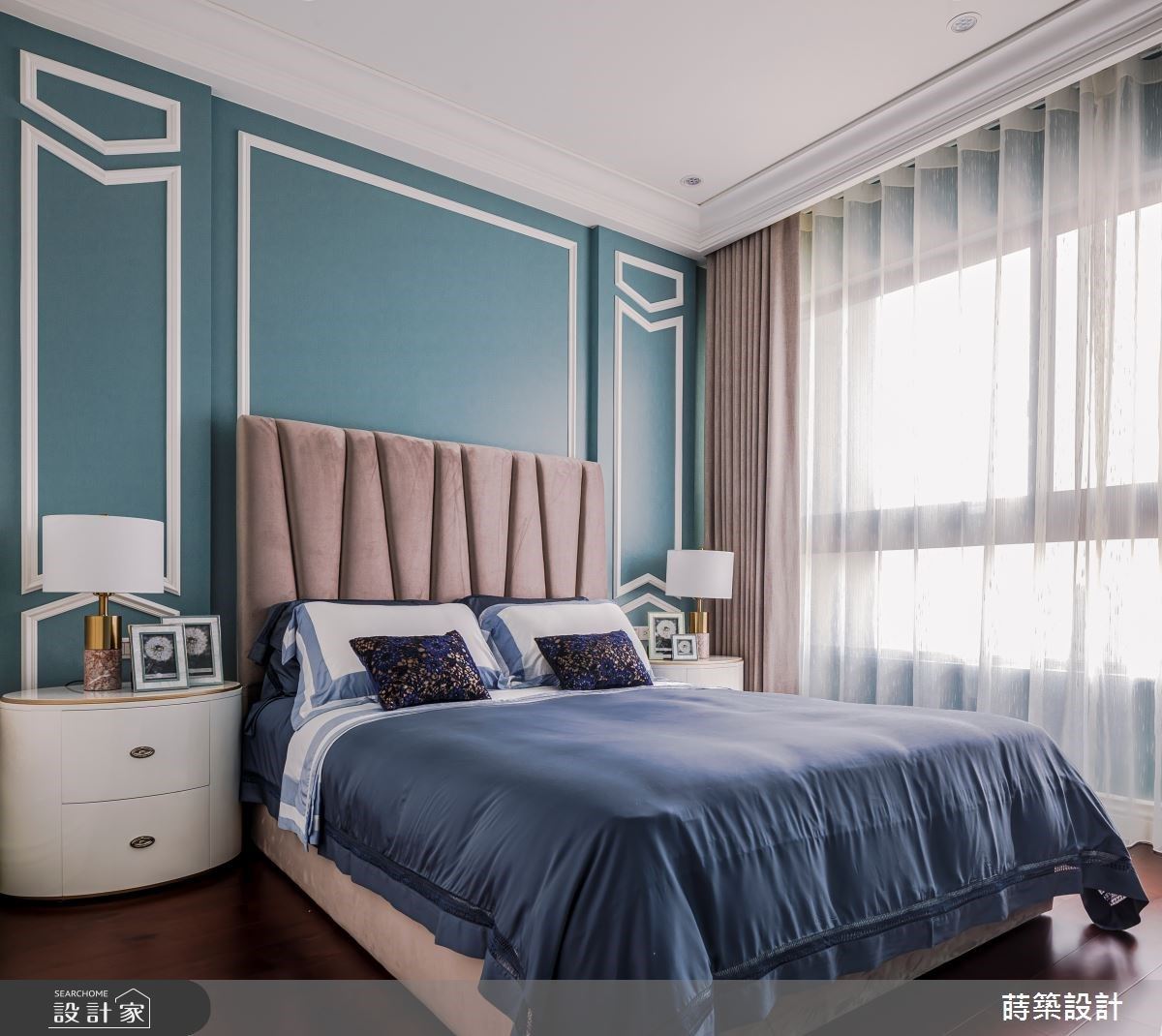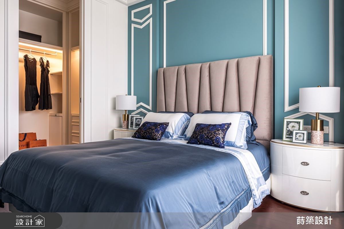寝居空间以湖水蓝铺陈墙面,延续的缎带元素搭衬奶茶色绷布,营造柔软舒适的空间意象。