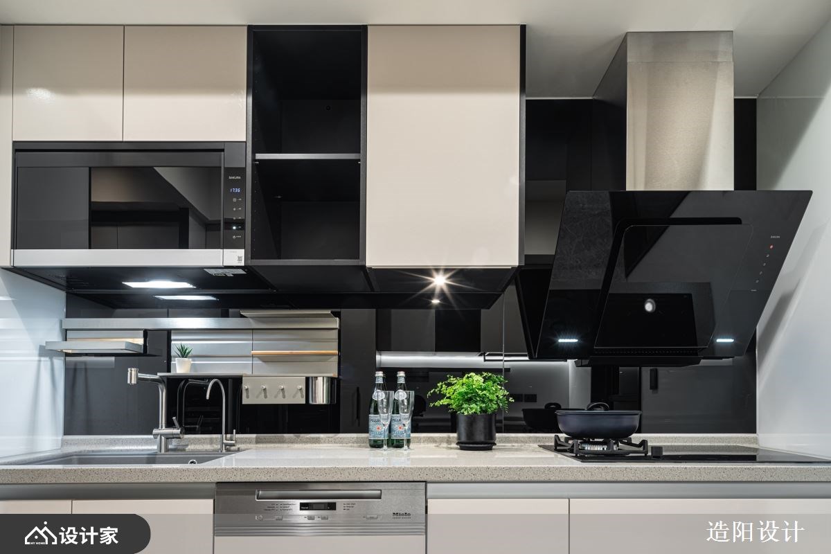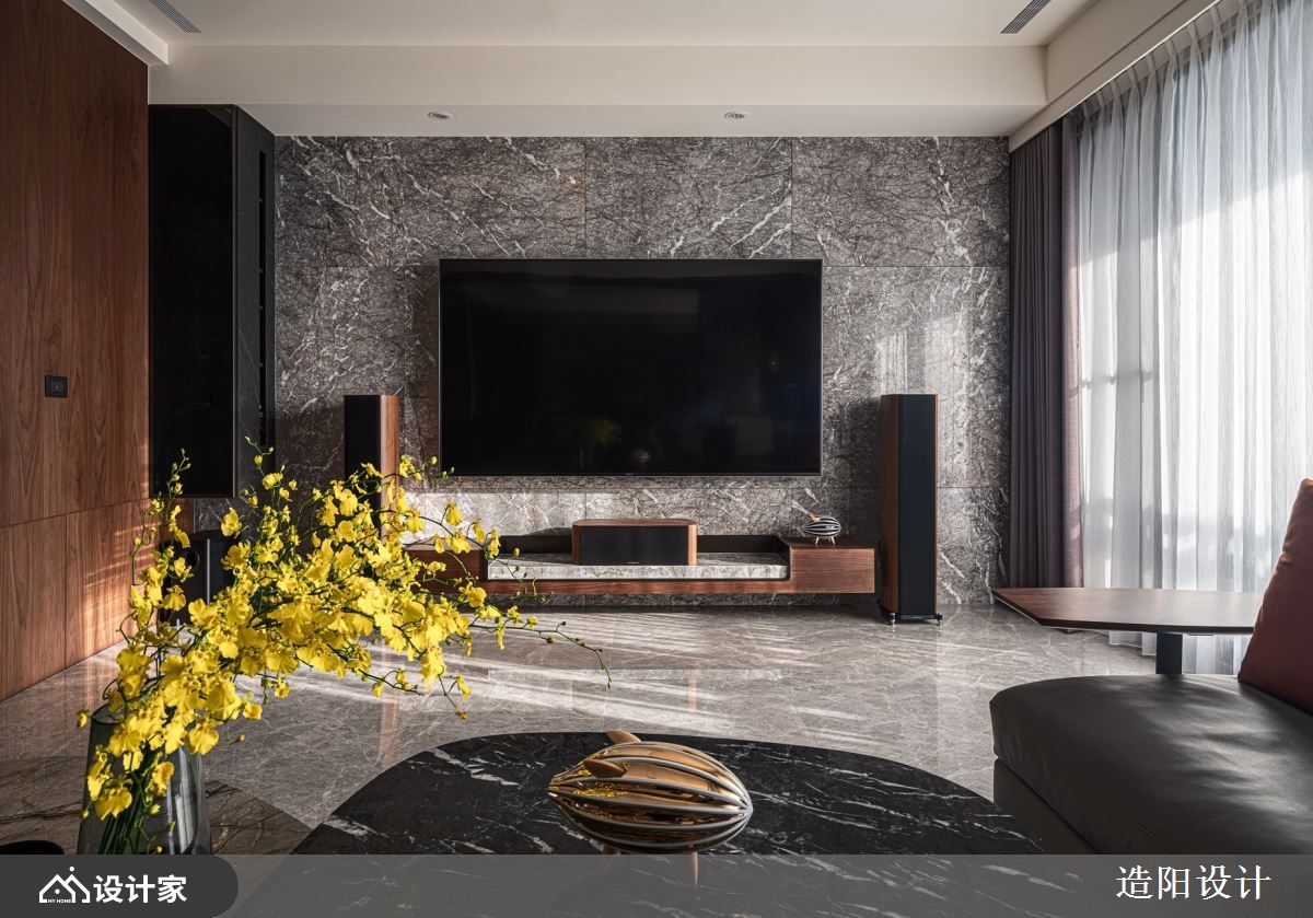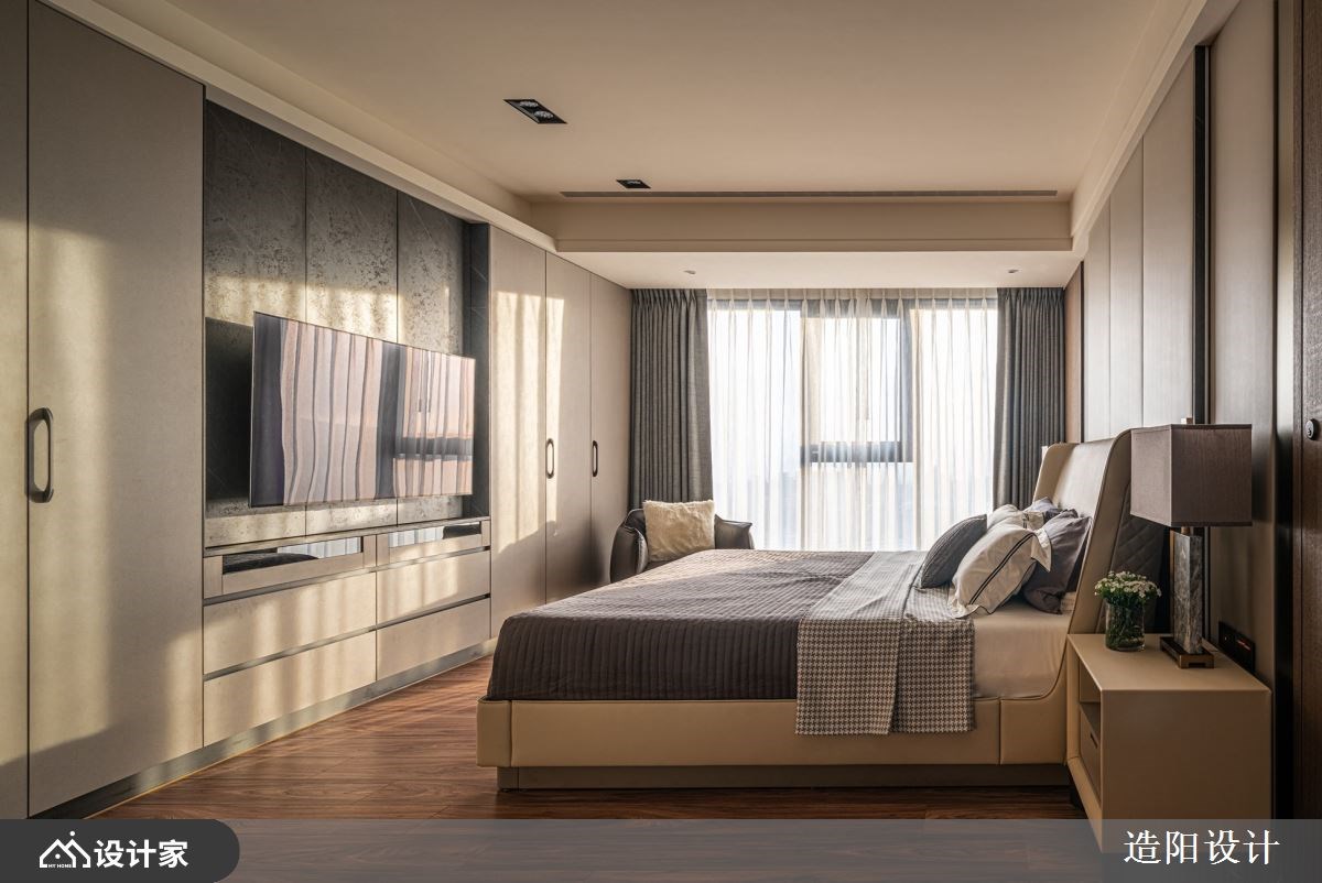 改造指南 1. 弹性空间如何发挥多维使用机能? 2. 舍弃一房后,怎么规划室内格局? 3. 门片也能隐藏动线和兼具涂鸦墙! 设计师这样做 284平米现代风豪宅的年轻业主,希望能将自己的品味嗜好融入家居,让妻子与三个孩子都能住得舒适。设计师全盘考虑一家五口的生活所需,透过隔断与门片的小巧思,让空间不仅符合每个人的使用习惯,还能发挥意想不到的格局妙用,创造专属的生活环境。 设计师以灰网石大理石妆点电视墙,简练的线条凸显空间的大气质感,而环绕立体音响与卡拉OK设备,让团聚时刻充满欢笑。沙发后方的多功能室,平时作为爸爸的书房或客房,当外地念书的女儿返家时又能成为专属空间。多功能室的隔断采取电雾玻璃建材,让透明墙面随时变成投影幕,保有隐私又兼具娱乐效果。 原本毛胚房最多能隔出四居室,但男主人决定舍弃一房格局,来送给太太一间大厨房与更衣间,让空间更为实用。大理石中岛结合异建材混搭的餐桌,让一家人可以围在中岛的电陶炉,吃火锅聊近况。厨房的门扇还刻意留有一片玻璃,让女主人煮饭时也能照看孩子,感到无比安心。 小编的最爱 主卧床头墙以对称手法,结合裱布、木皮、金属饰条等异建材,来隐藏卫浴入口,维持立面的完整性;床尾安装变形电视支架,只要把电视往前拉,后面就是深度足够的收纳空间。两个儿子的儿童房则用烤玻衣柜门片,塑造好擦拭的涂鸦墙,发挥一门两用的高效能。