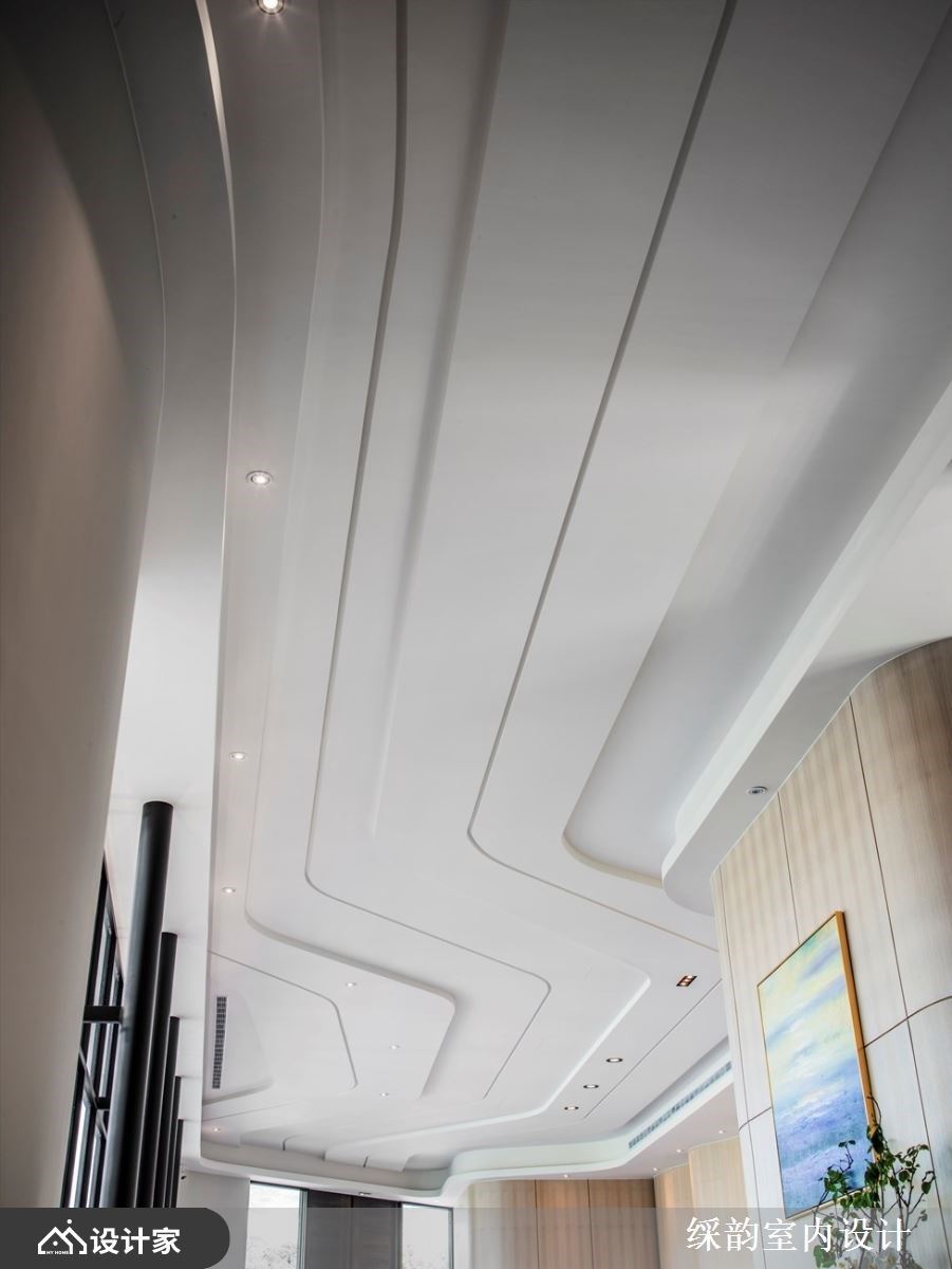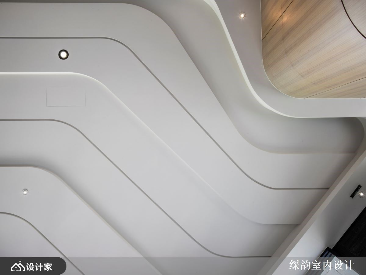 借助建筑思维,室内的天花板造型有了更多的情绪展露。延伸建筑的弧形线条造型,天花的设计自然也富有力与美,宛如将水波的流动裱框在此,创造室内外呼应的设计。
