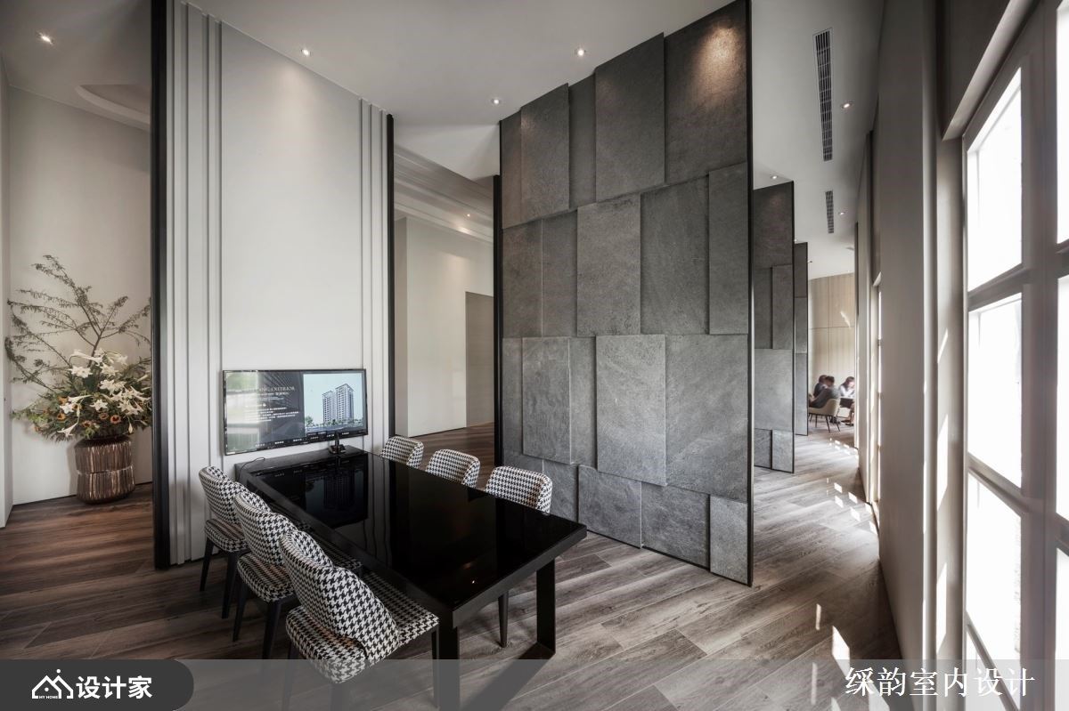 每个空间的动线精炼,极富层次感。进入洽谈区后,中间运用屏风隔断的手法,缔造出具有神秘的仪式感与秩序感,使用保有自然感纹理的巨大砖石与切分工整的木作隔断交错,自然感的色彩与人造的白,形成的不是视觉上的停滞,而是具有缓冲的转换及延续。