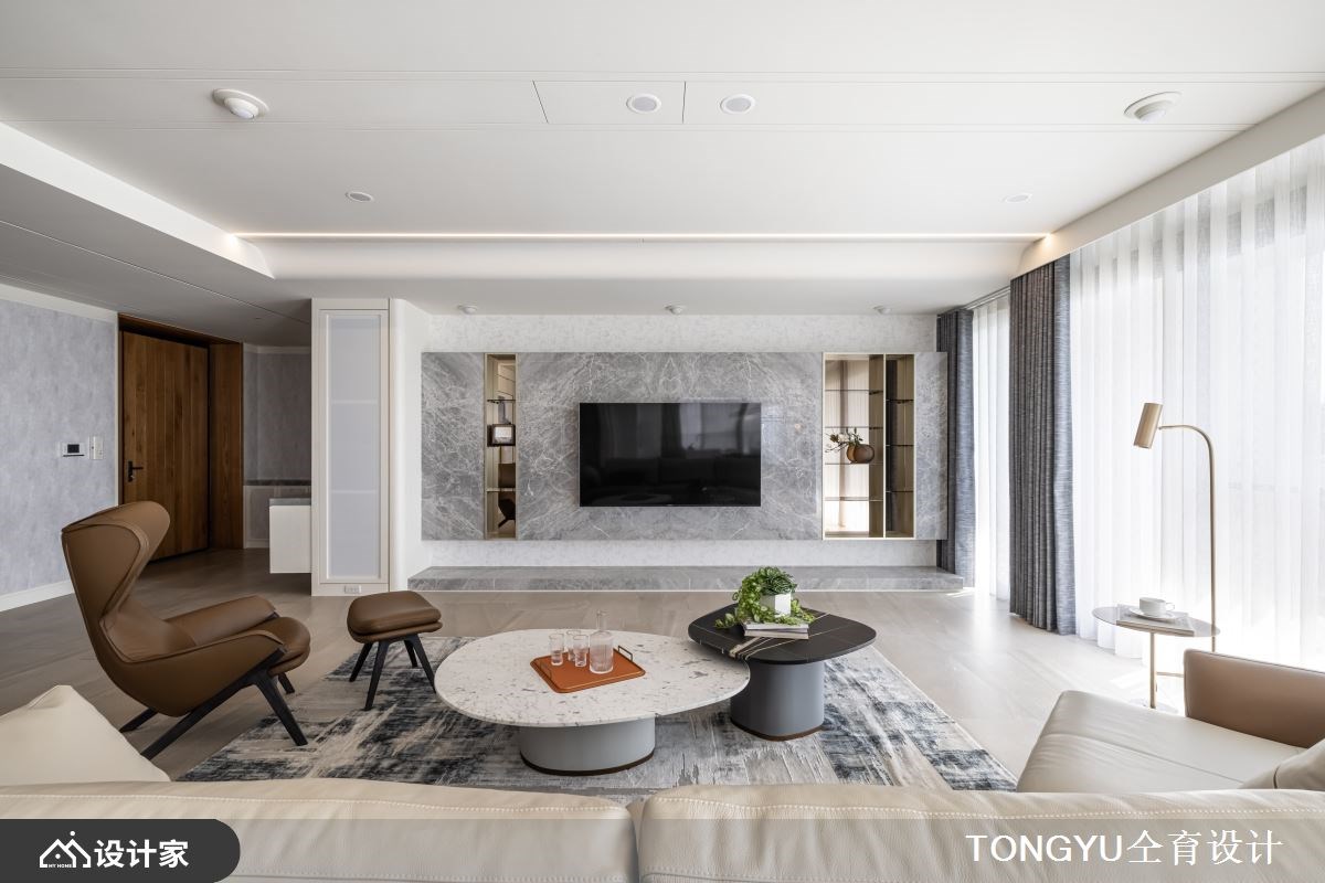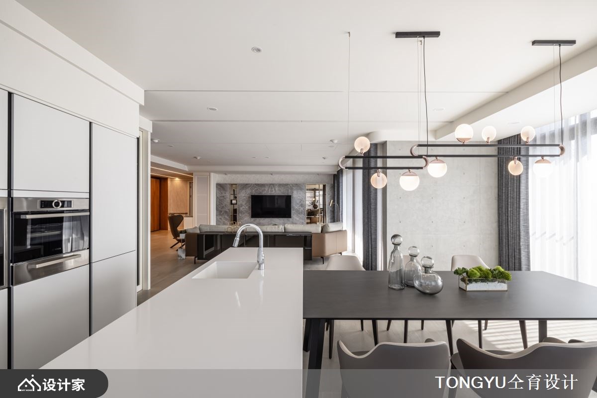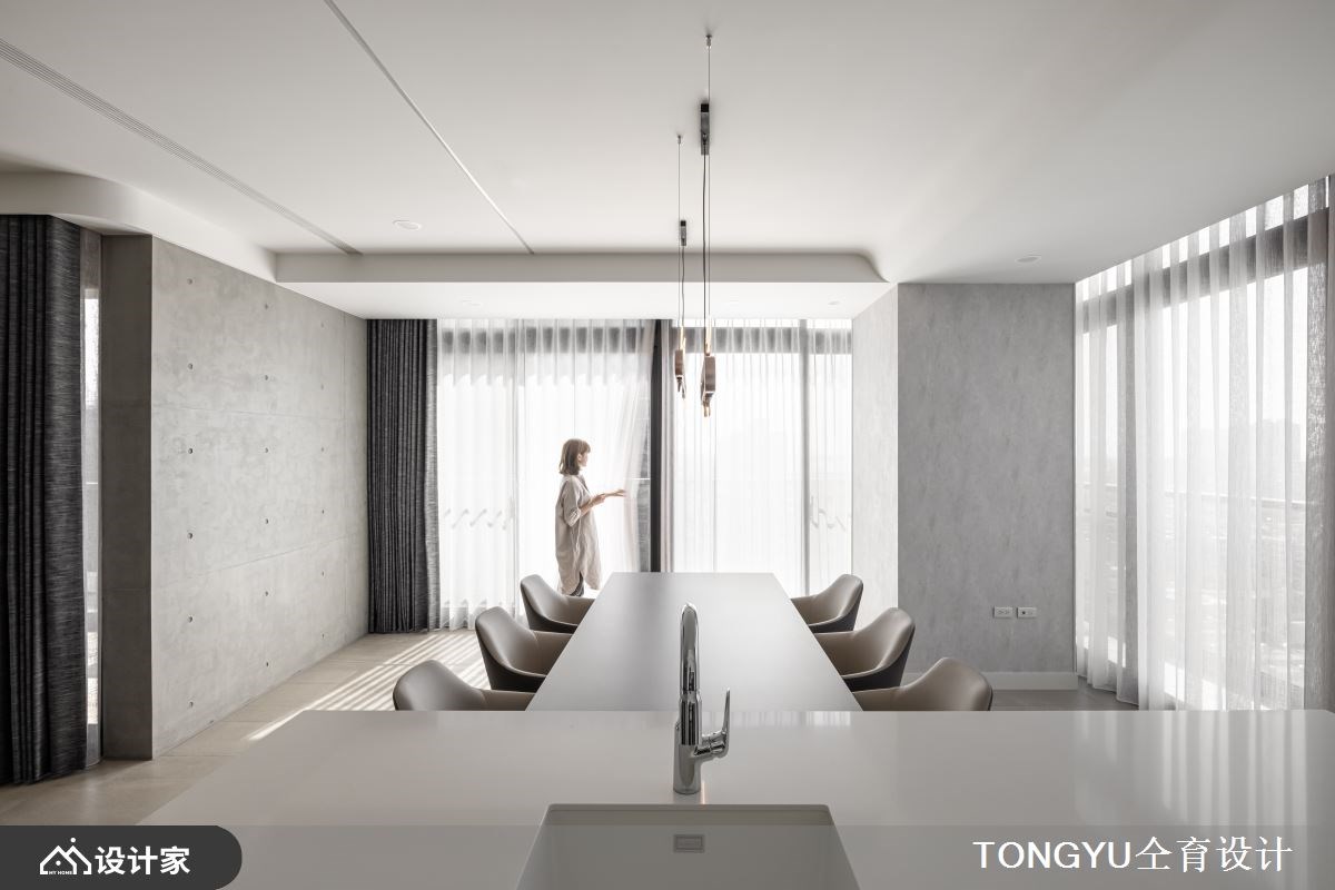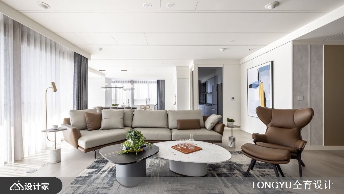 改造指南 1.怎样让大户型柔和有温度 2.如何打造无障碍的交流空间 3.让卧室合乎每个人的期待 设计师这样做 设计师融合低调却时尚的设计元素,打造出净白的大户型空间,给人眼睛一亮的清新感,让屋主一家人可随时领略居家生活的细致美好。在冰冷的白色空间之中,以削光面雾金局部妆点,带出奢华亮点,也平衡了大理石建材的冰凉感;天花板则刻意以圆弧包覆,修饰过于锐利的线条,展现天圆地方的格局,让住宅亲切有温度。 打造客厅、餐厅、厨房之间的开放式格局,同时规划一个白色大中岛,串联与餐厅区的关系,额外的热炒区则位于电器柜后方,隔绝油烟不干扰。 四间卧室都以套房做规划,按照家族成员需求加入设计巧思。像是男孩喜欢看窗外风景,就安排了原木卧榻营造休闲感;主卧房则贴近女主人需求,重视更衣间机能,以精品柜设计让衣物、饰品可被妥善分类及收纳。 小编的最爱 仝育设计团队的庄媛婷、郑瑞文设计师,秉持对生活、设计的热爱,藉由与客户的深度沟通,不仅仅提供机能和形式上的规划,也关注空间使用上的考虑,替每一位客户塑造出专属个人风格的居家情景。