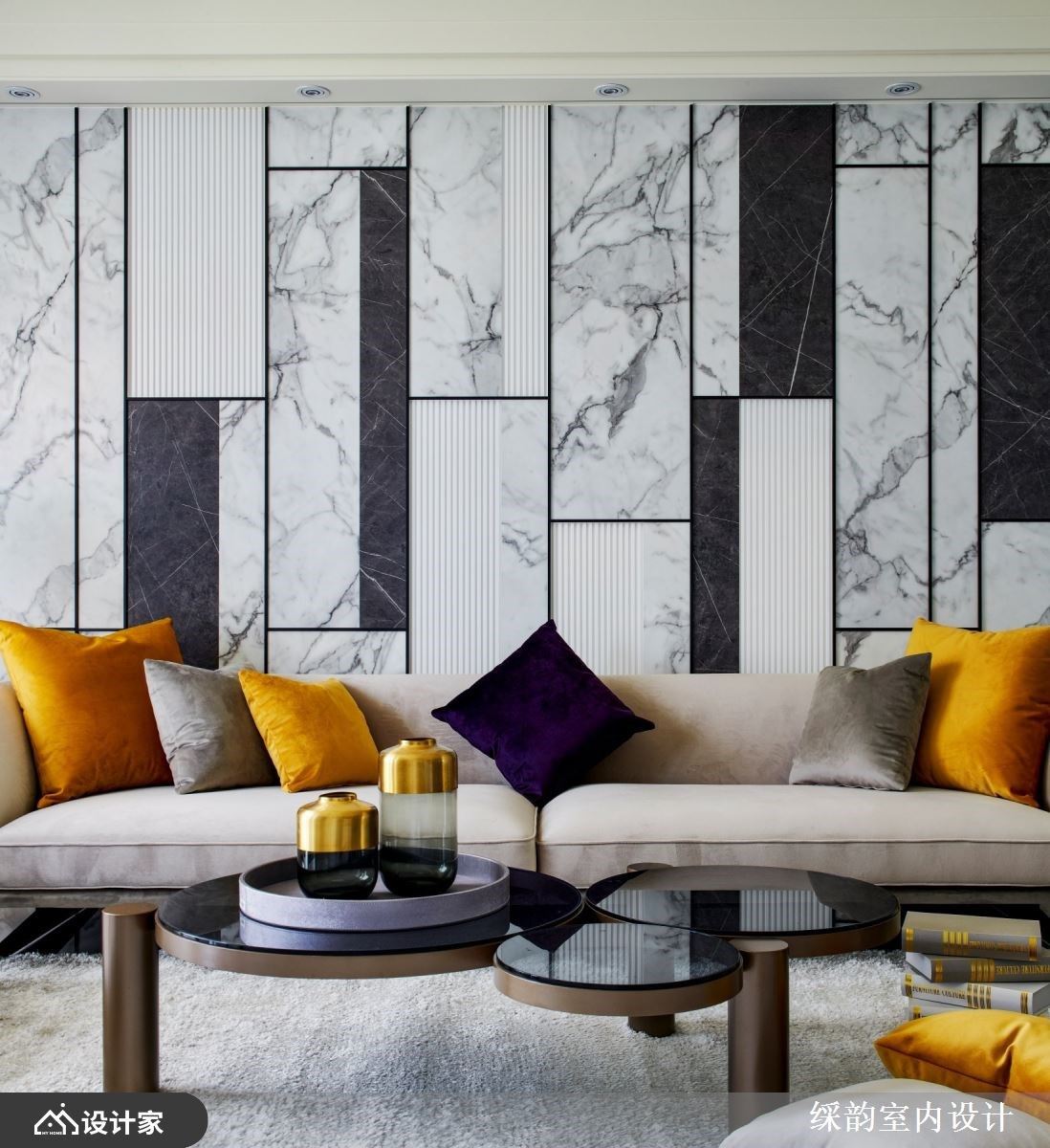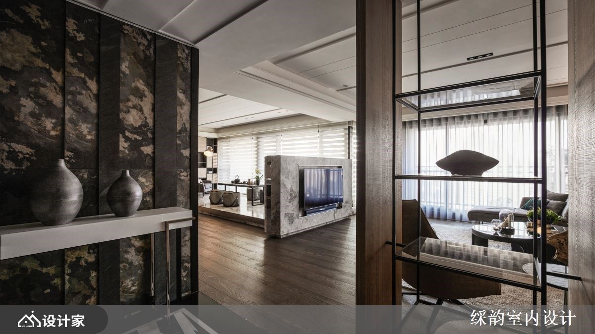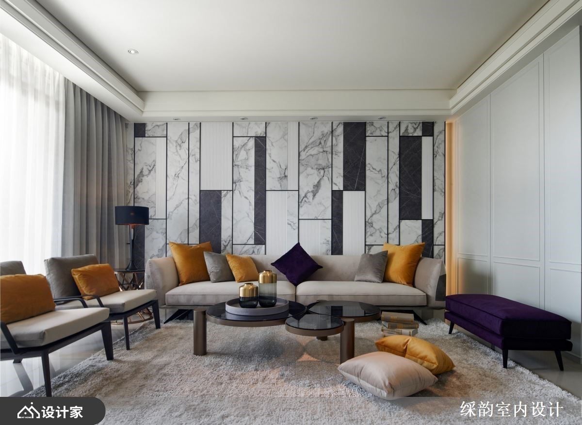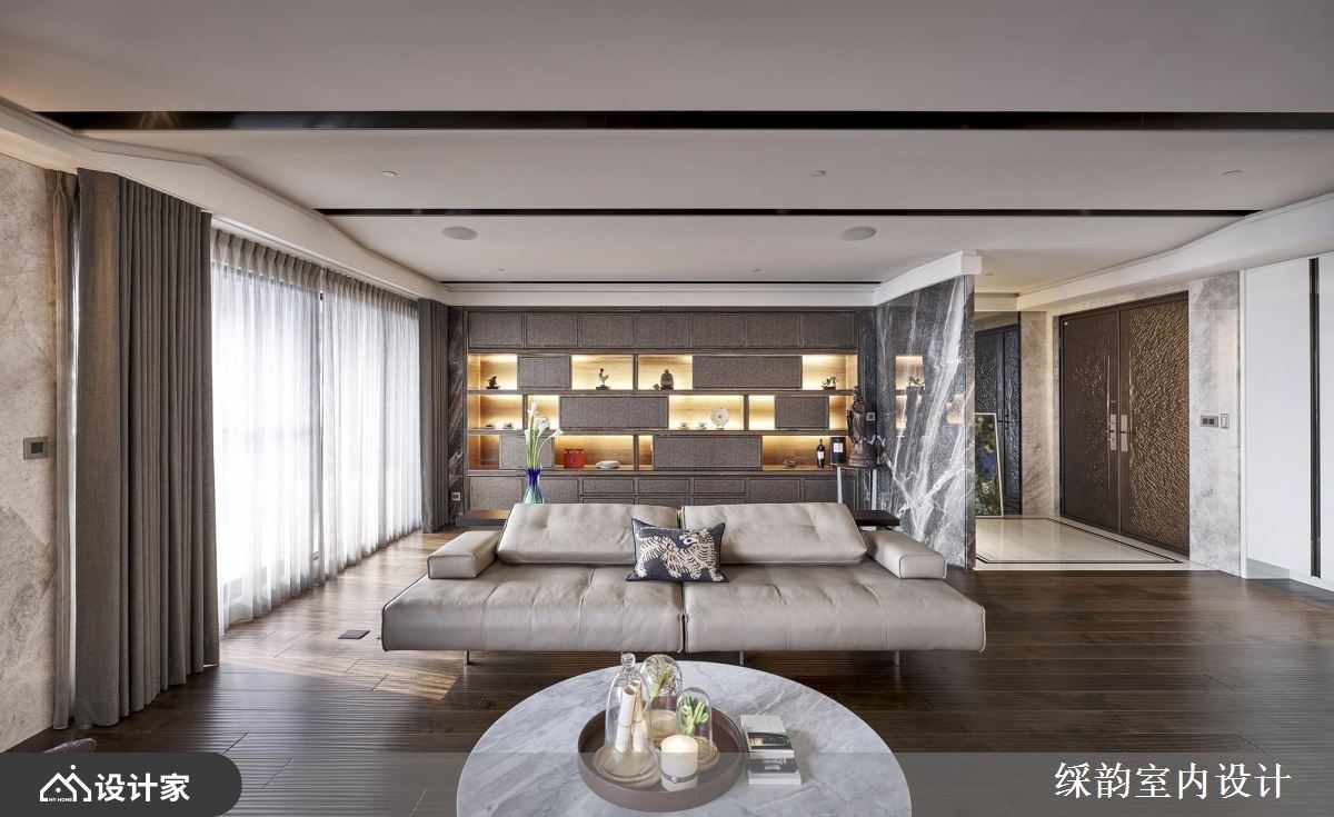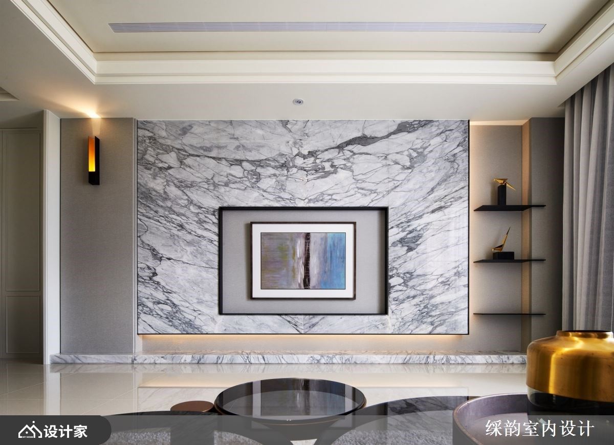 墙面设计可利用异材质的拼贴、色彩变化的运用、层架柜体的搭配及光源的点缀等技巧,营造各区域所需的氛围,并兼顾屋主的收纳及摆设机能,而䌽韵室内设计运用多重巧思,于沙发背墙、电视墙、展示收纳柜中,缔造空间价值,且融入理性收纳机能,与屋主一同描绘美好的生活美学。