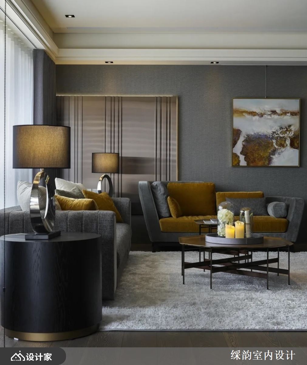走入宽敞客厅,开阔的视觉享受即刻映入眼帘,以深灰色搭配芥末黄的绒布沙发椅,为空间打造活泼撞色感,沙发背墙以造型不锈钢镀钛加入空间的理性,并内嵌光源增加墙面层次感,墙面选用壁布增加空间温度,适当的留白空间,以相同色调的艺术画作妆点墙面,减少空间压迫感。