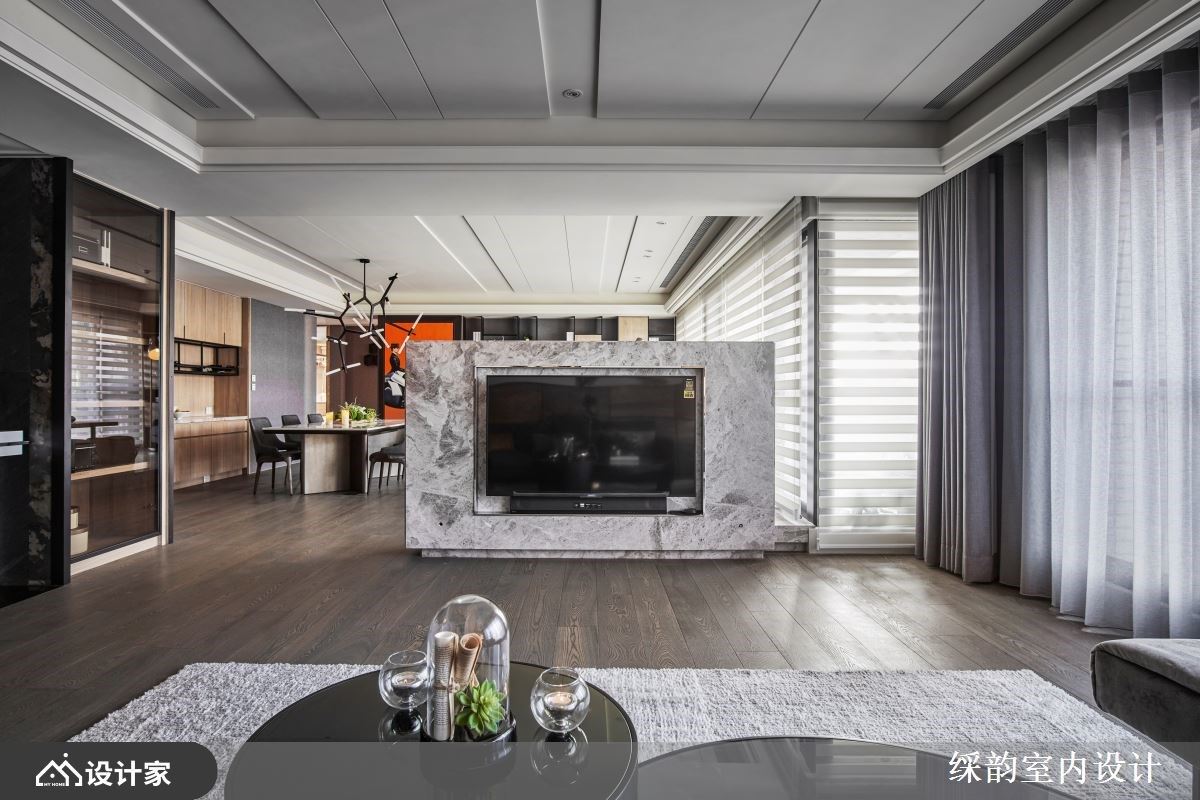 灰石材电视墙以未满版的特殊设计,间接做为隔断,划分出各个公共领域,展现出通透视觉,使用不锈钢框构出电视造型,并在后方设置展示及储物空间,背面材质则选用木质纹理打造不同场域,让电视墙呈现双面造型且具双用功能。