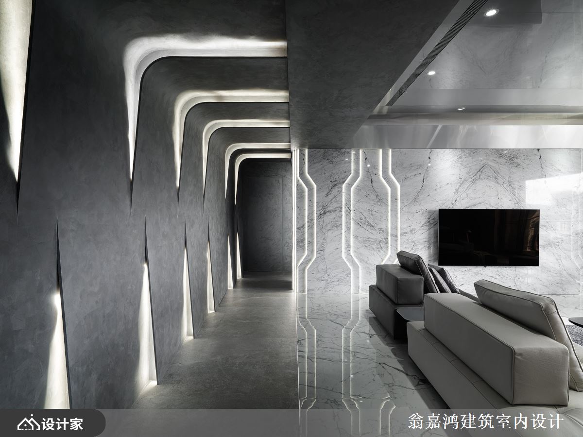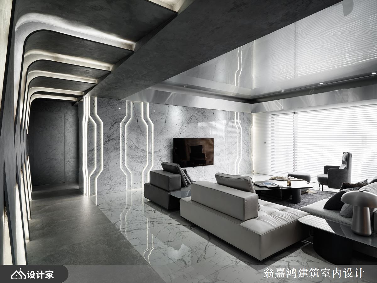 改造指南 1.怎样呈现强烈的科幻风格? 2.如何避免设计过于冷冽? 3.如何创造更大的接待空间? 设计师这样做 设计师以灰、白、黑三色为主色调,藉由灯光与纯粹色彩创造大户型的设计氛围,缔造充满特色的科幻豪邸视野。打造曲折的造型墙面,并搭配LED灯隐身于切割线内,搭配银灰色特殊漆料、金属天花板,呈现前卫中带有大器感的空间情境;餐厅更悬吊环形灯饰,引导银河系星体的想象。