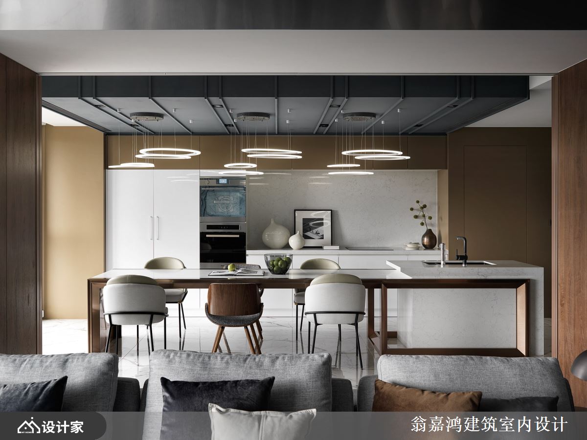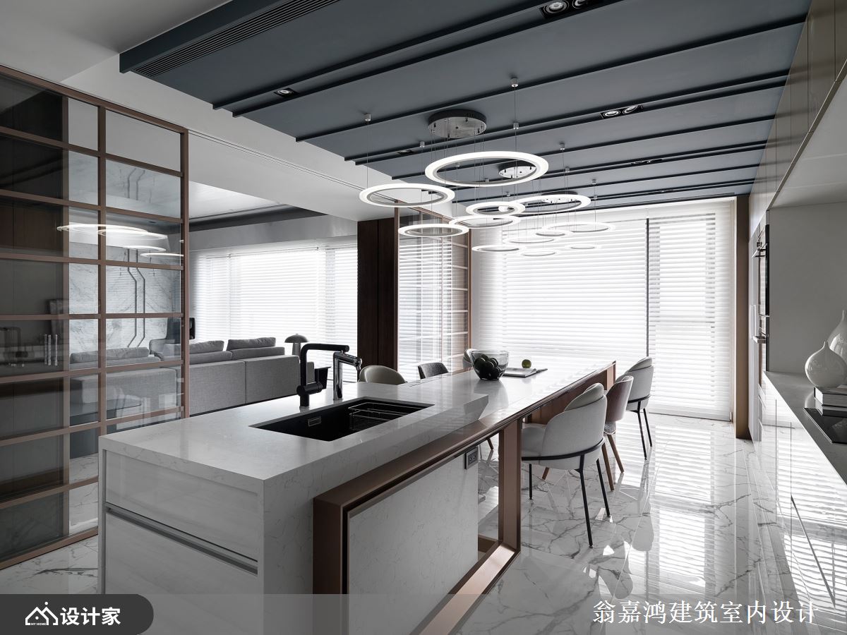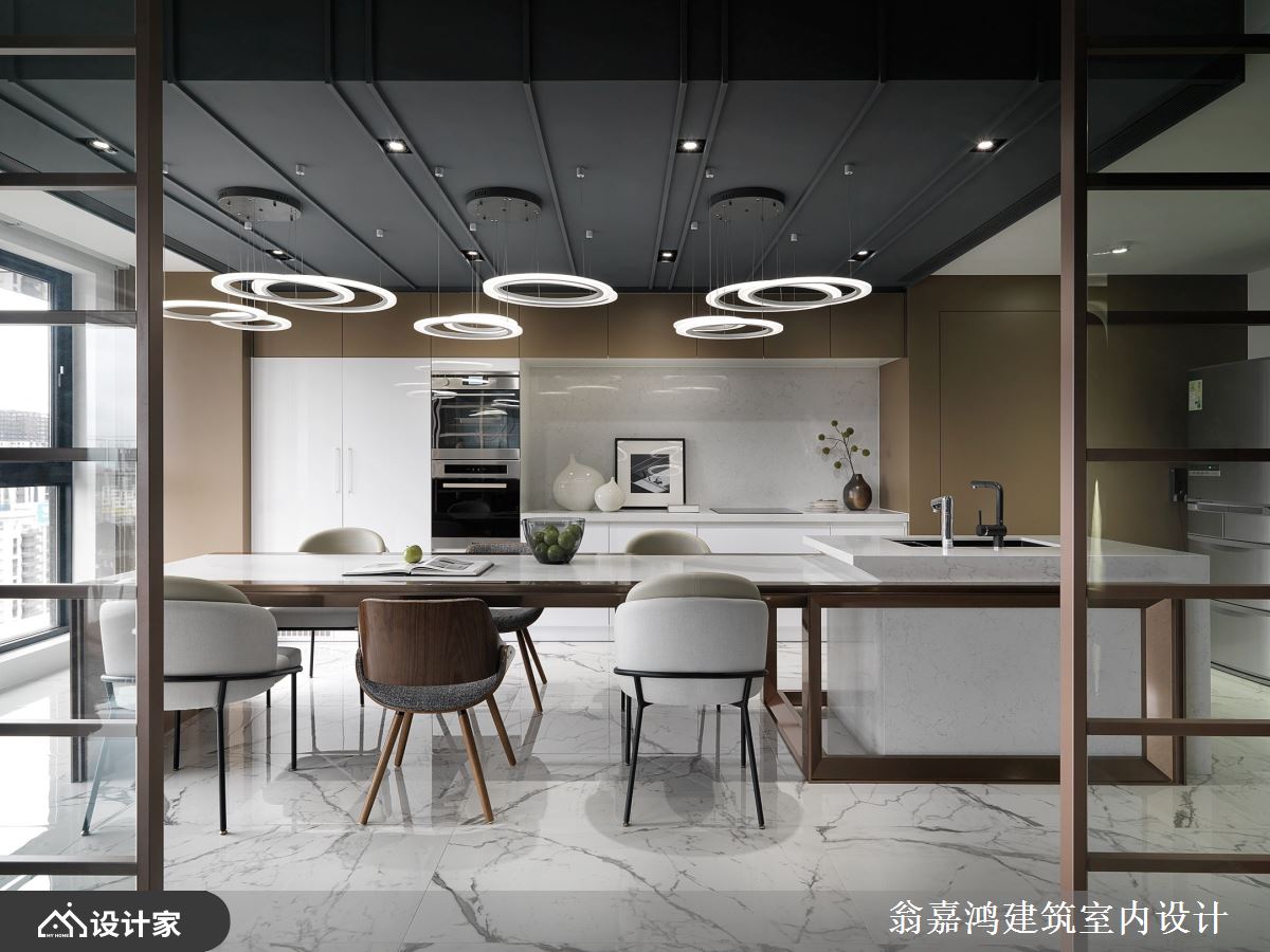 打造中岛餐厨,做出高效的机能运用,并以格状玻璃推拉门做为客厅与餐厅的区隔,不只强化视觉穿透感,也扩大迎宾的范围,形成一个大尺度的餐叙聚会领域。 小编的最爱 翁嘉鸿建筑室内设计坚持思辨求新,将创新的思维及工艺美学带入生活,并追求美学突破,为屋主创造更美好的生活,同时客制化专属空间,与业主一同见证永铭于心的珍贵感动。